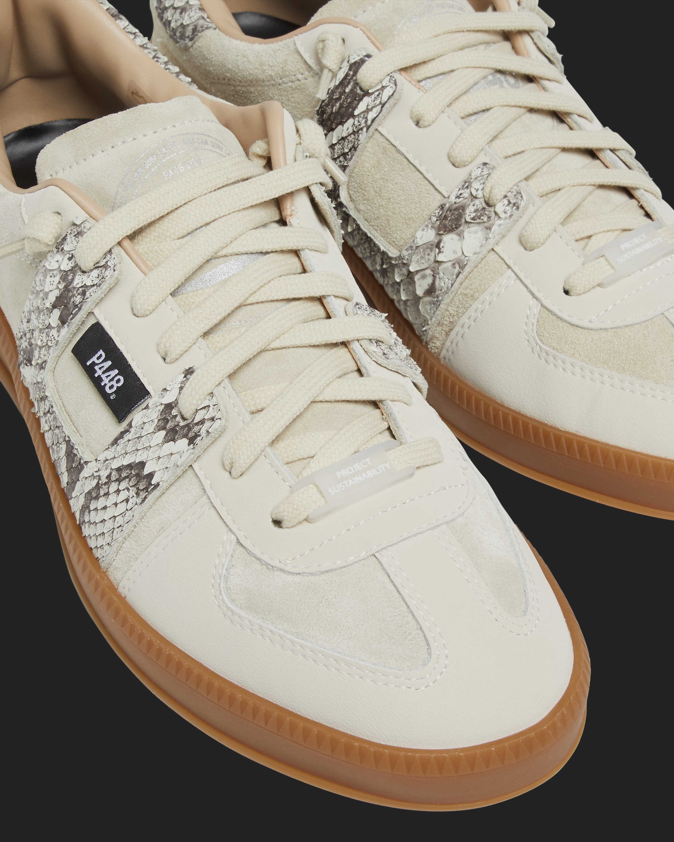 By removing Burmese pythons from the Everglades, we're helping to preserve native species, their resources and their environment. After months of tannery testing and material samples, we've created our sustainable snakeskin. The Monza Python features all-over beige recycled leather accented with a Burmese python leather heel tab and trim. Beige recycled organic cotton laces and our signature amber gum sole finish off the look.