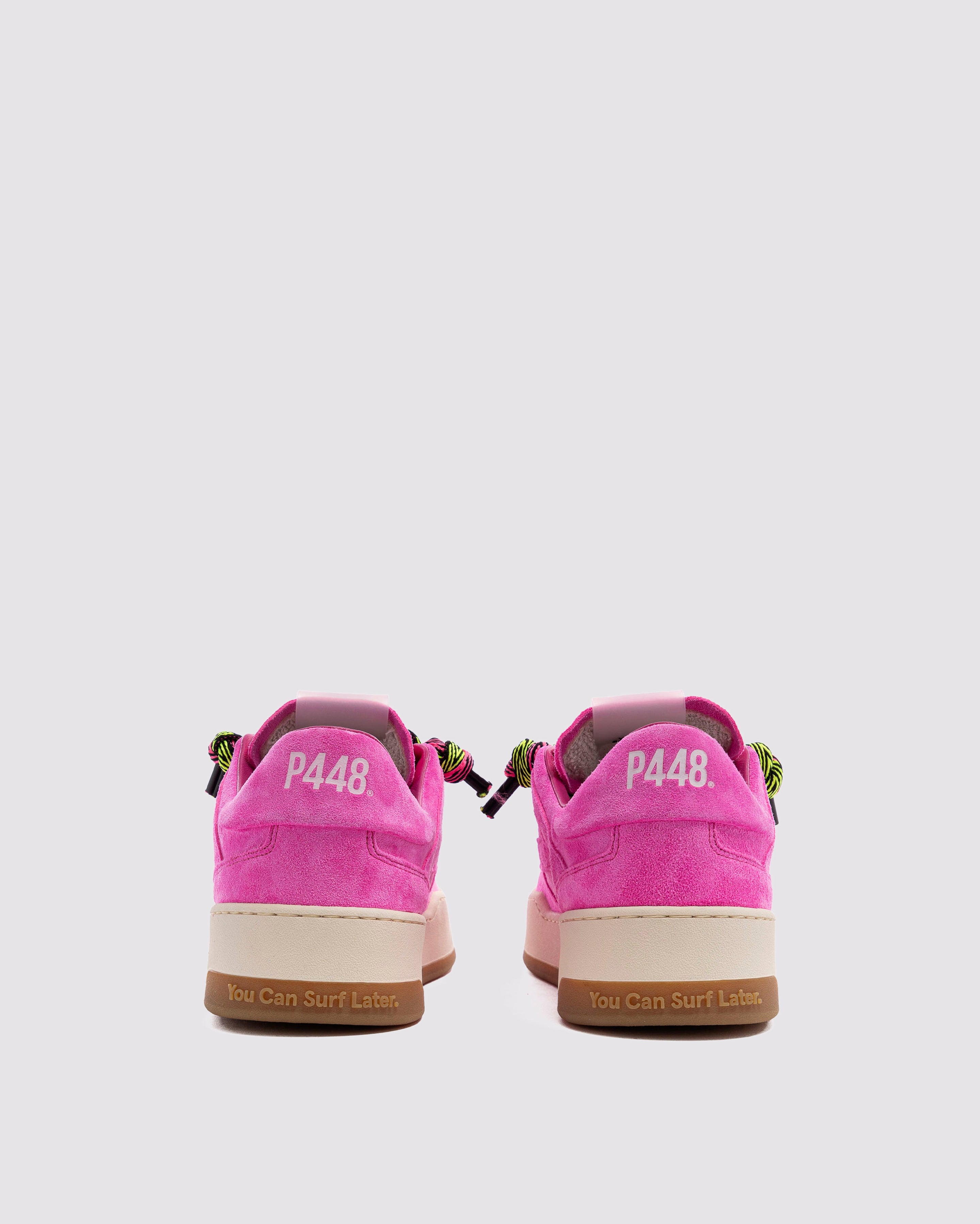The Brixton Neon/Fuchsia features an all-over fuchsia suede design accented by multicolor double laces. Our signature P448 rubber sole, featuring a contrasting amber tread, grounds the look.