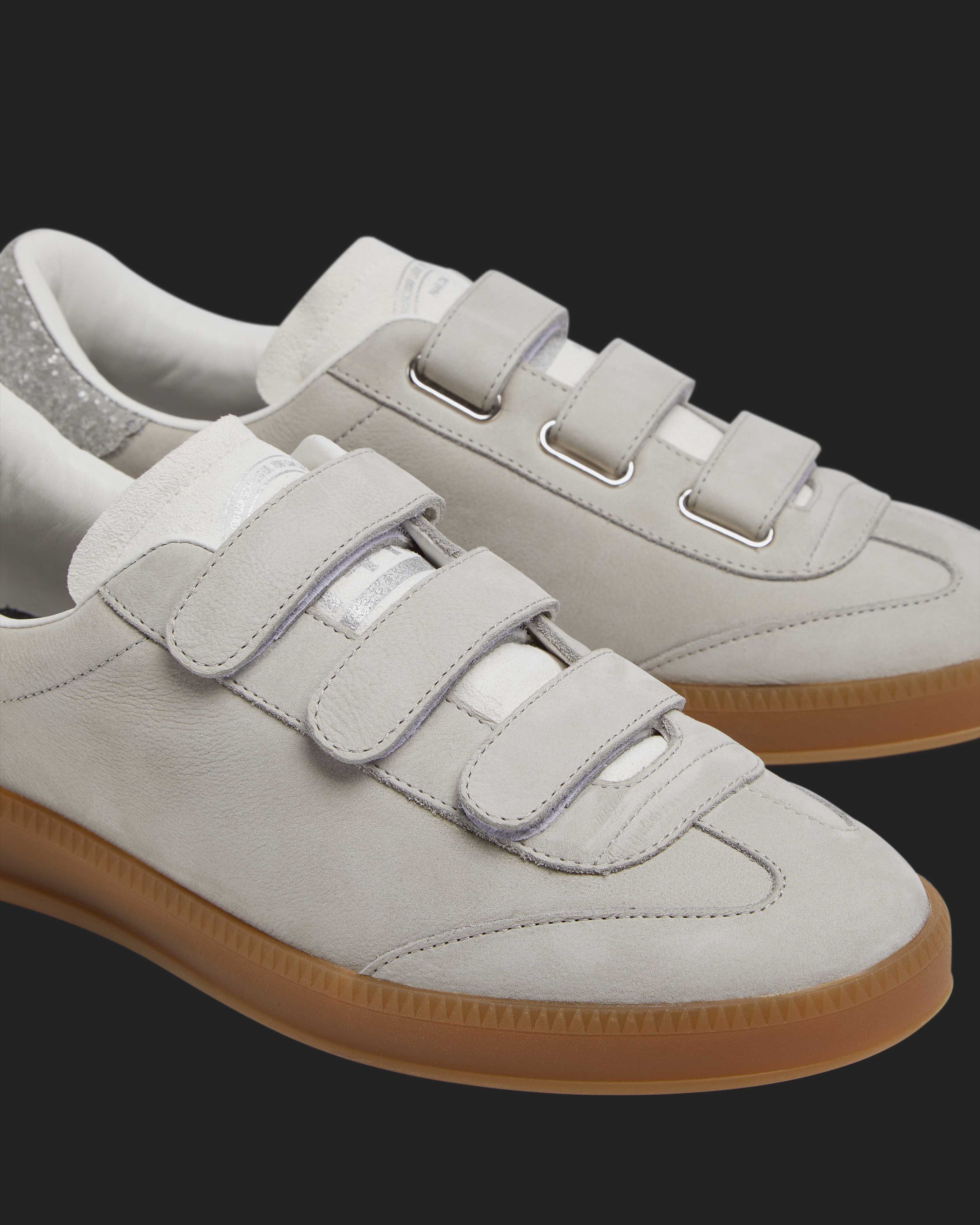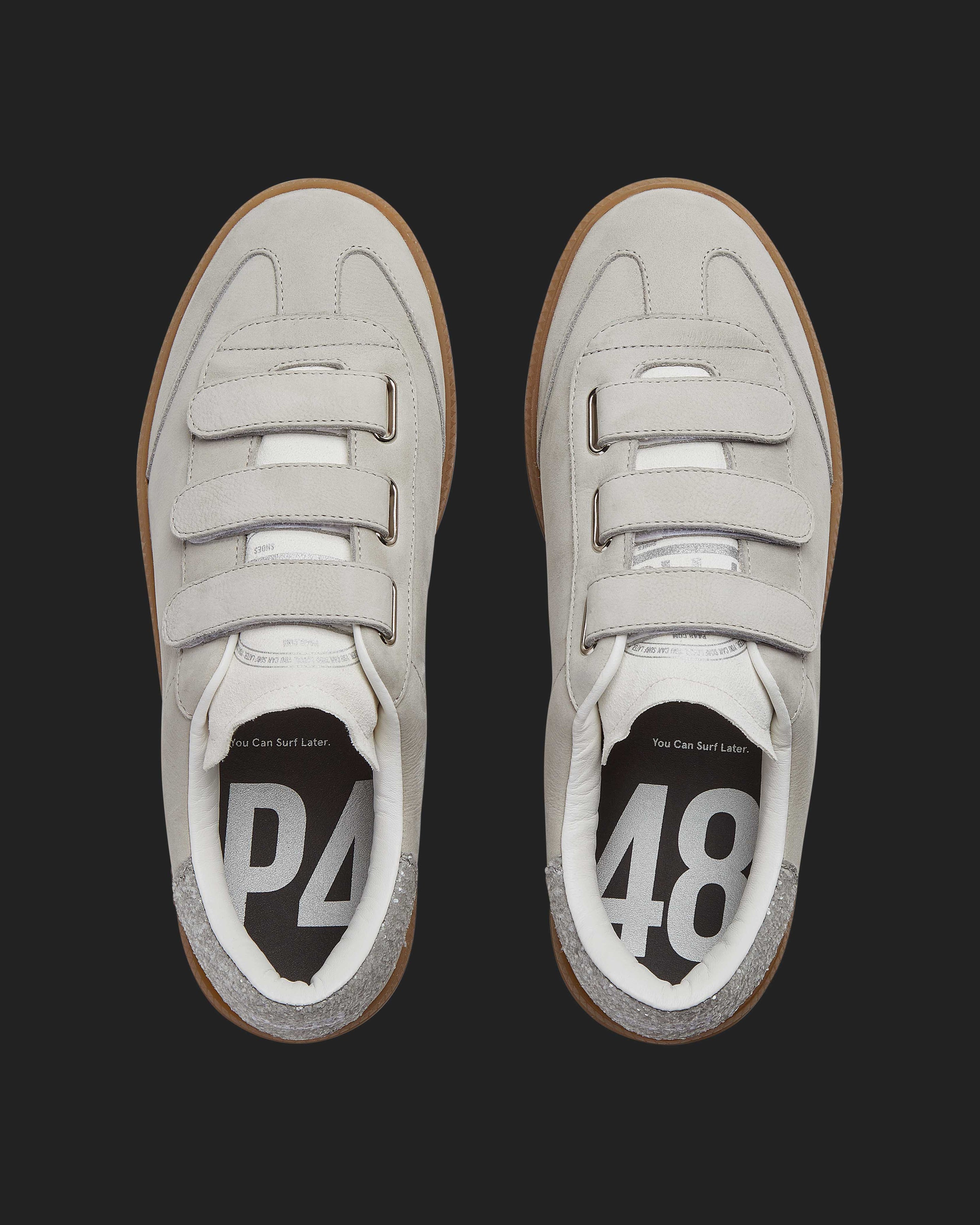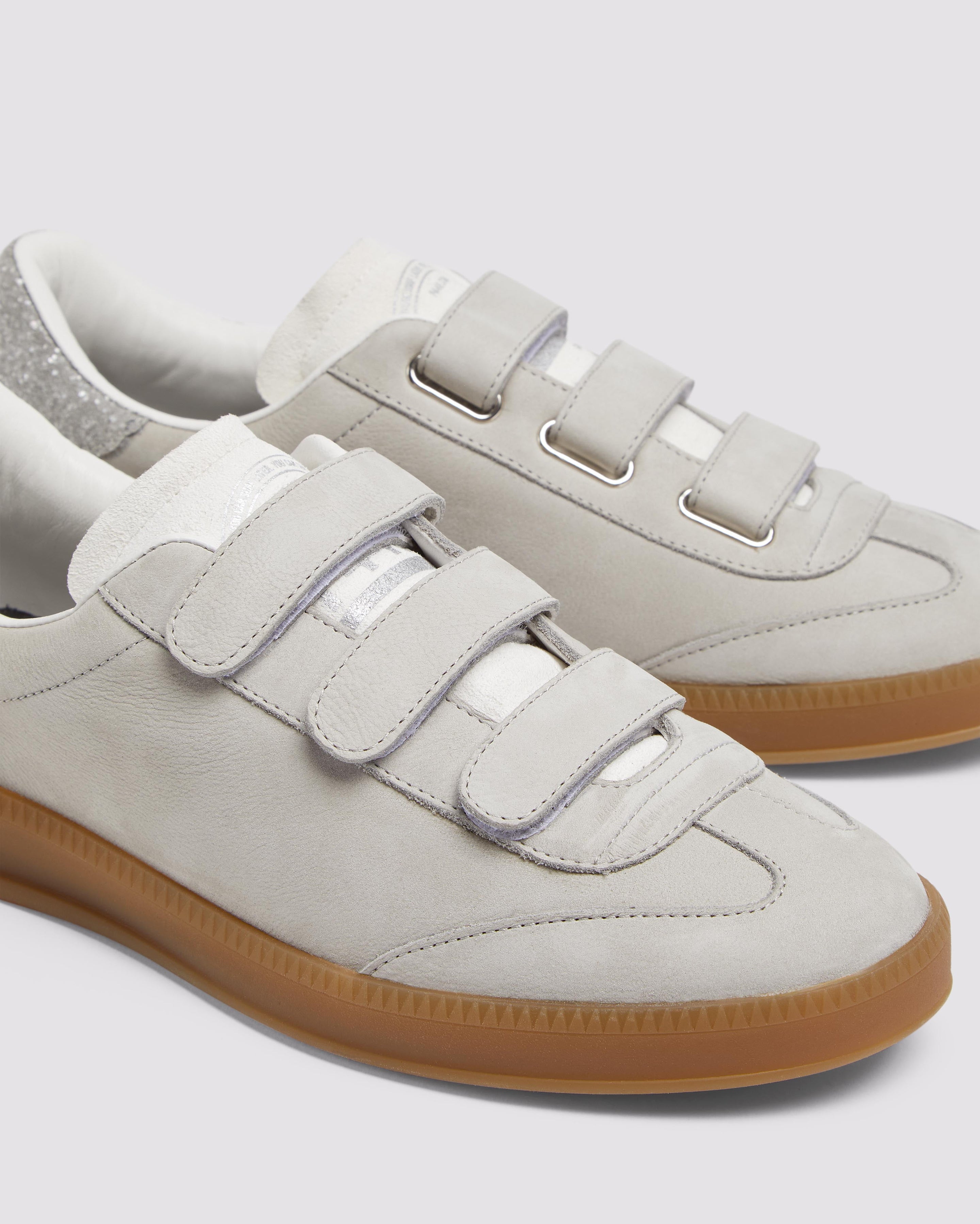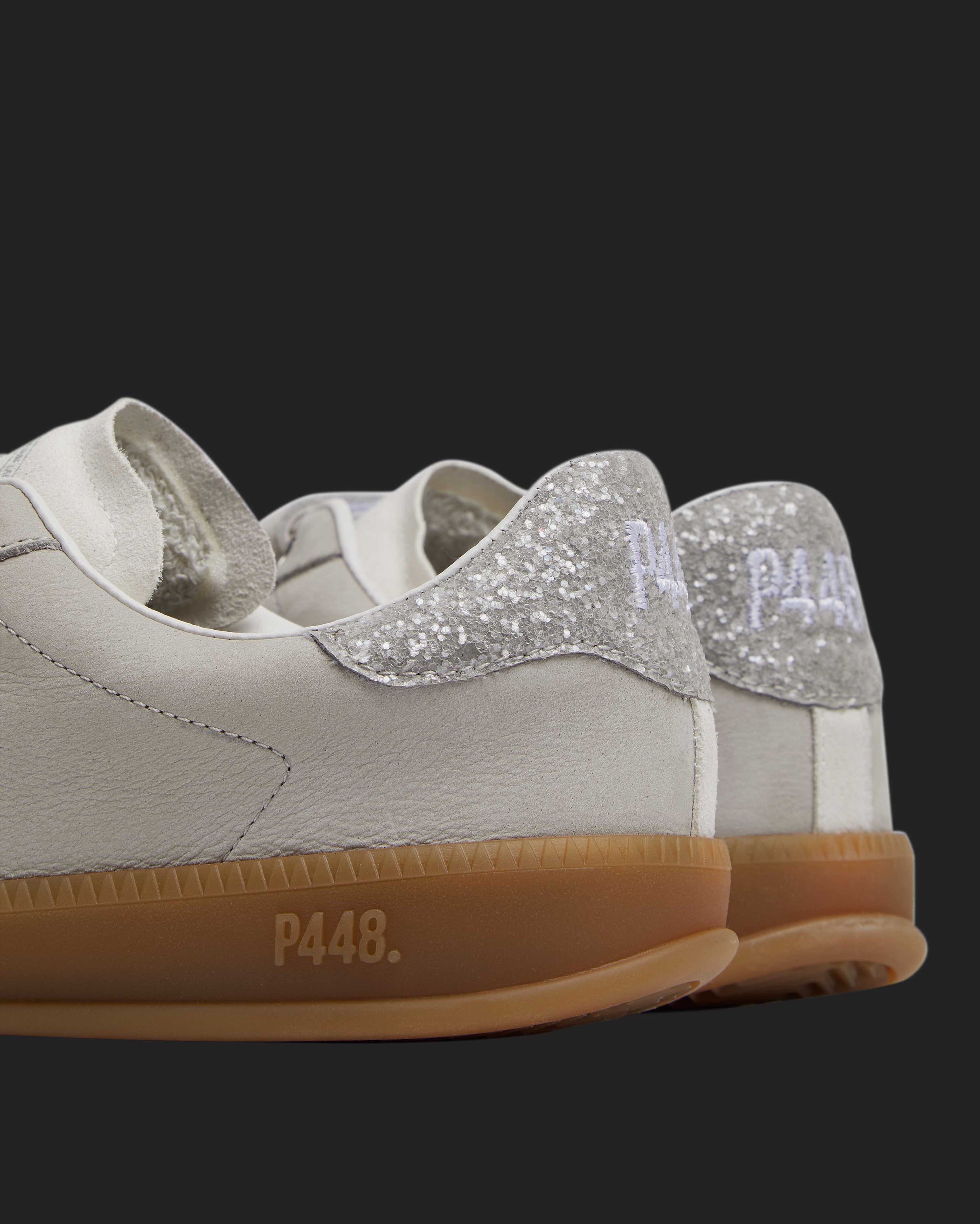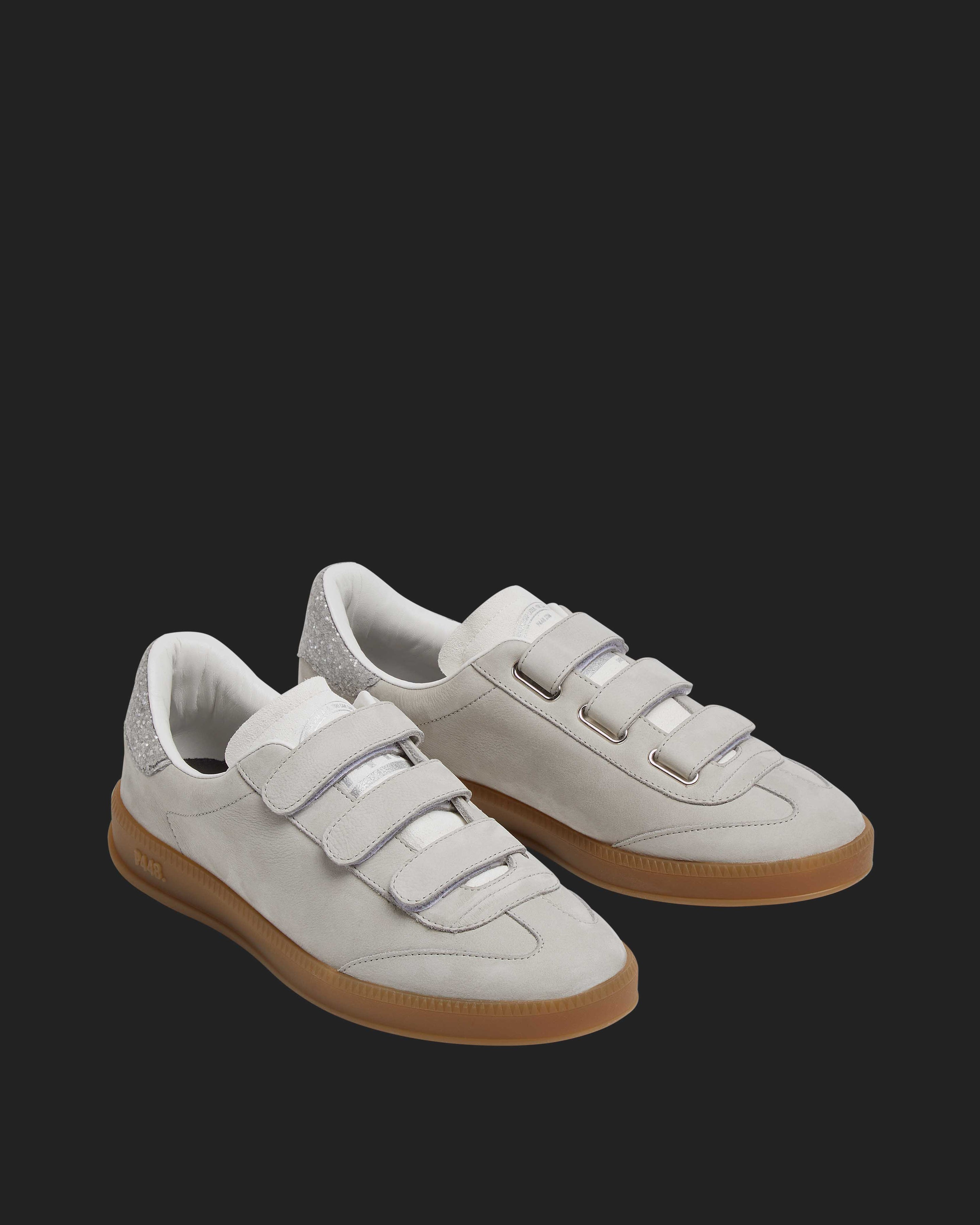 Slip into the Capri Glitter/Pearl for a sleek nubuck leather look. This effortless low top is wrapped in light grey nubuck leather, featuring an off-white suede tongue, all accented by a grey glitter heel tab. Grey suede straps and our signature P448 amber gum soles finish off the look.
