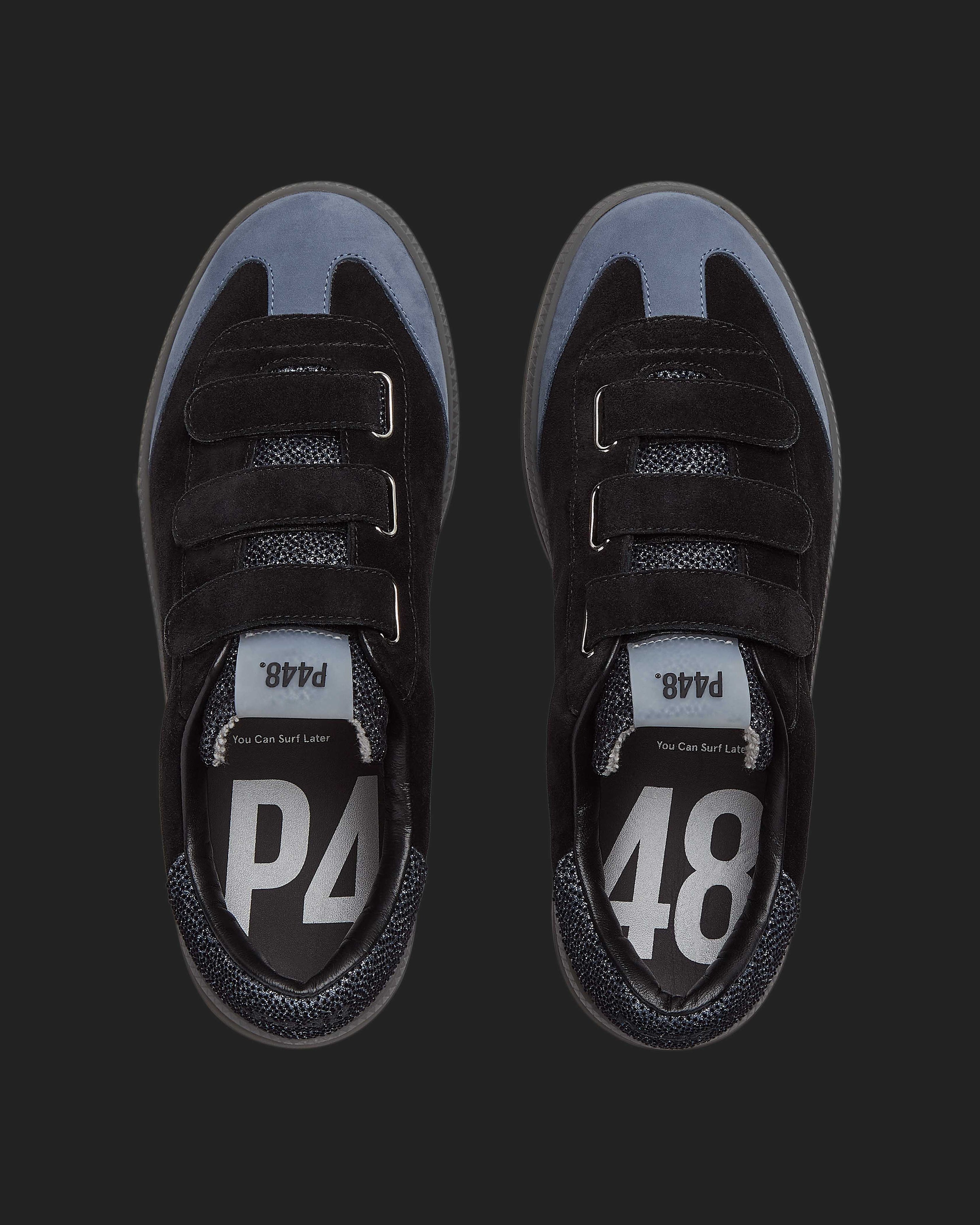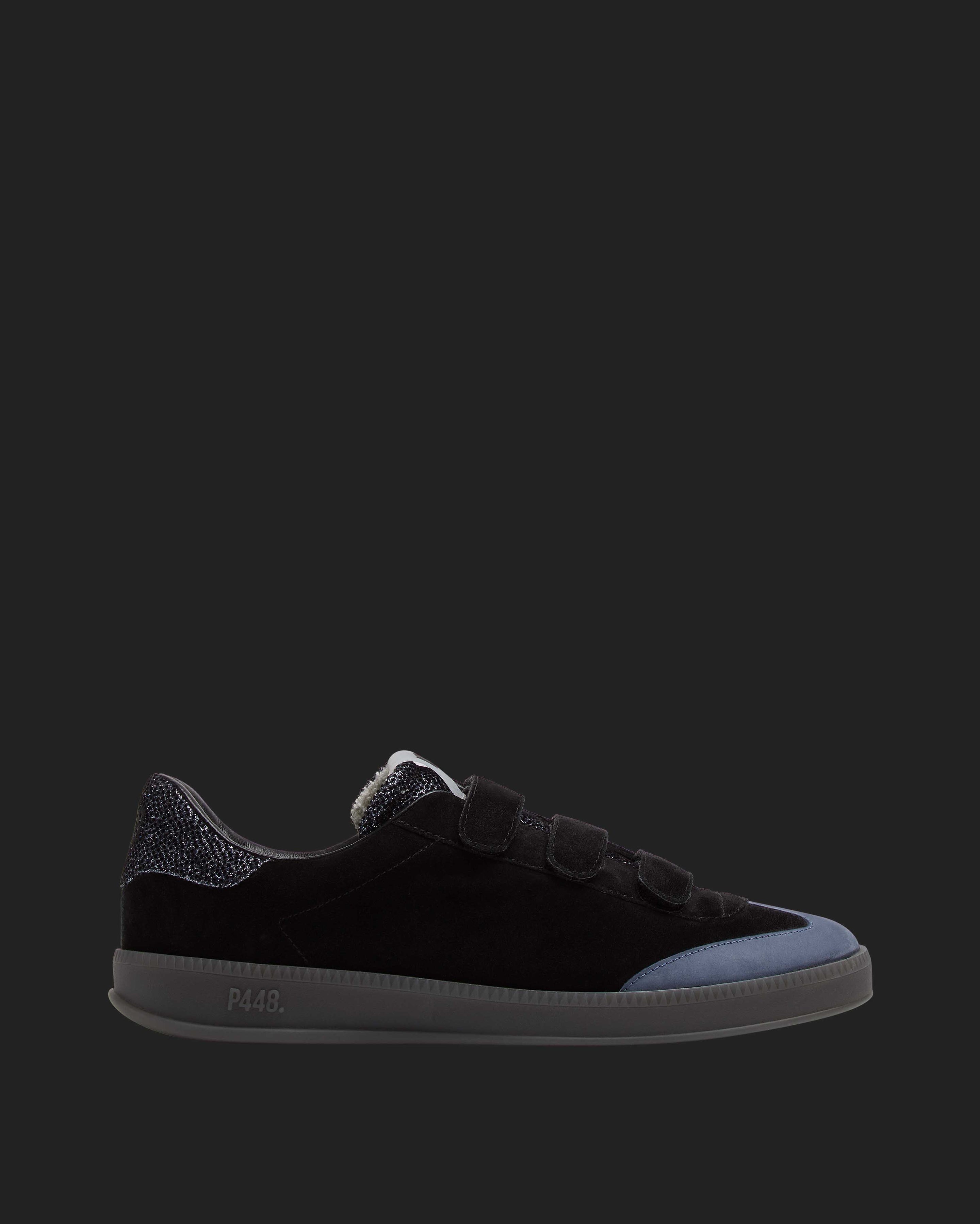 Slip into the Capri Phantom for a sleek suede look. This effortless low top is wrapped in black suede with contrasting silver glitter and velvet dot trims and accents. Black suede straps and our P448 semi-transparent black rubber soles finish off the look.