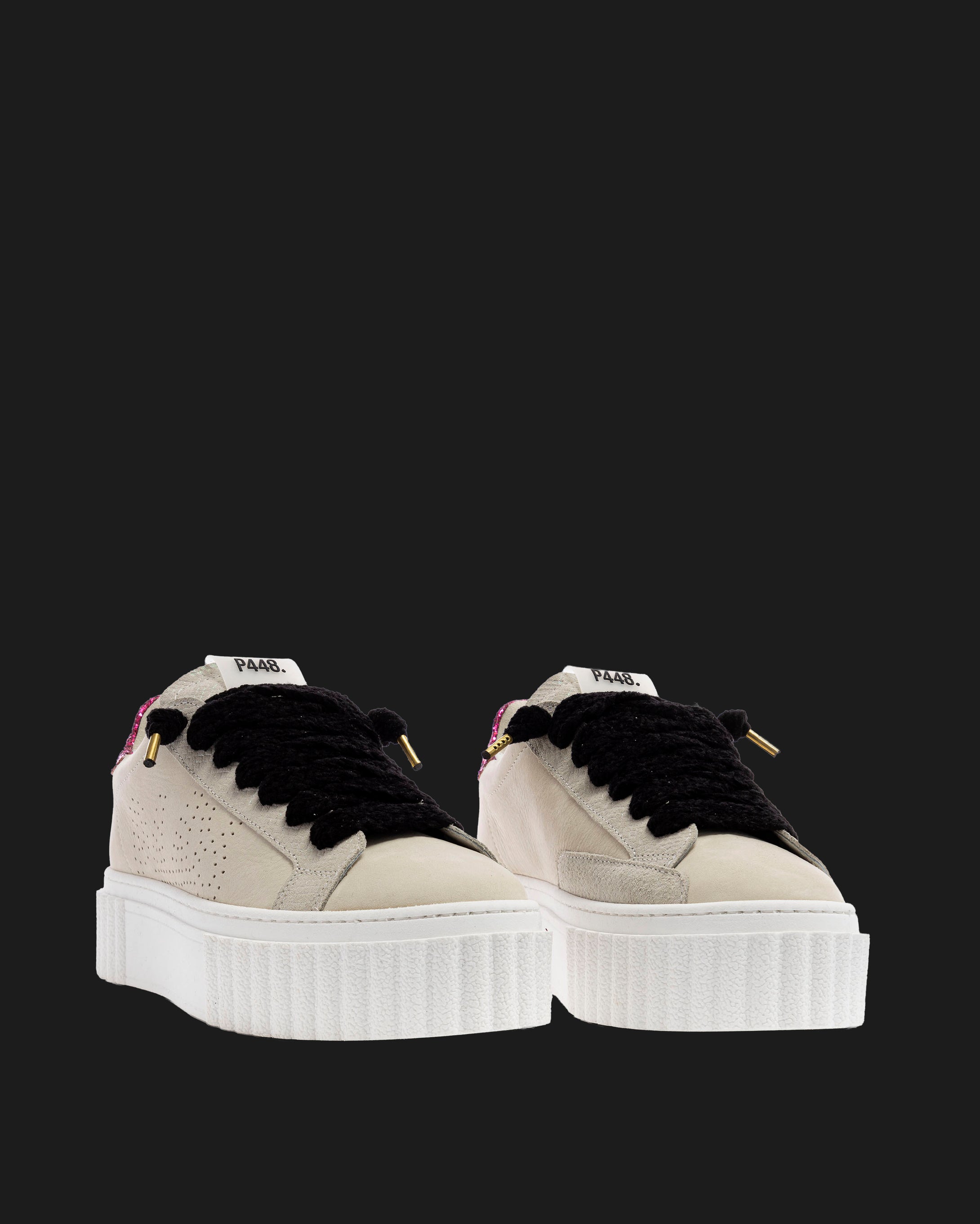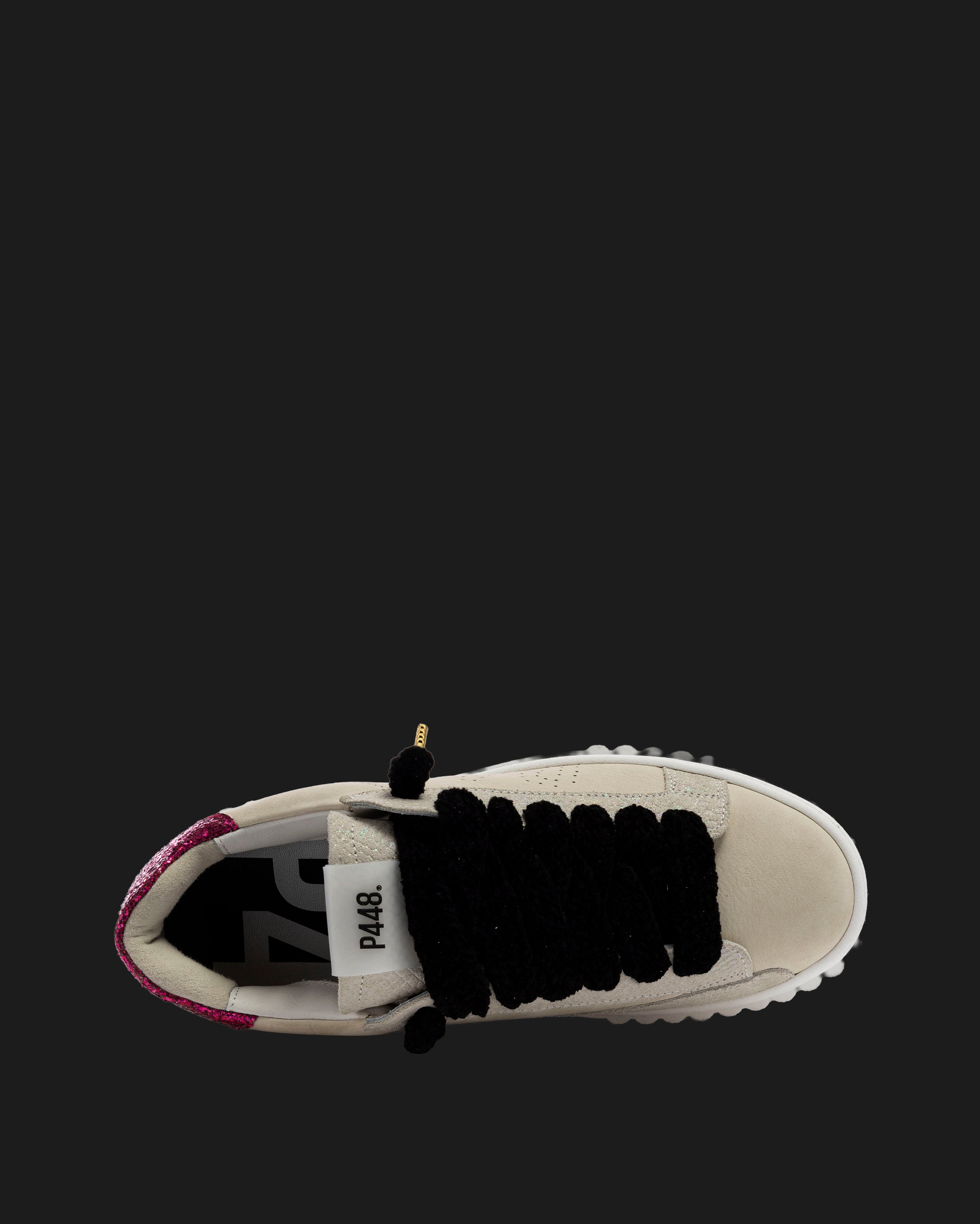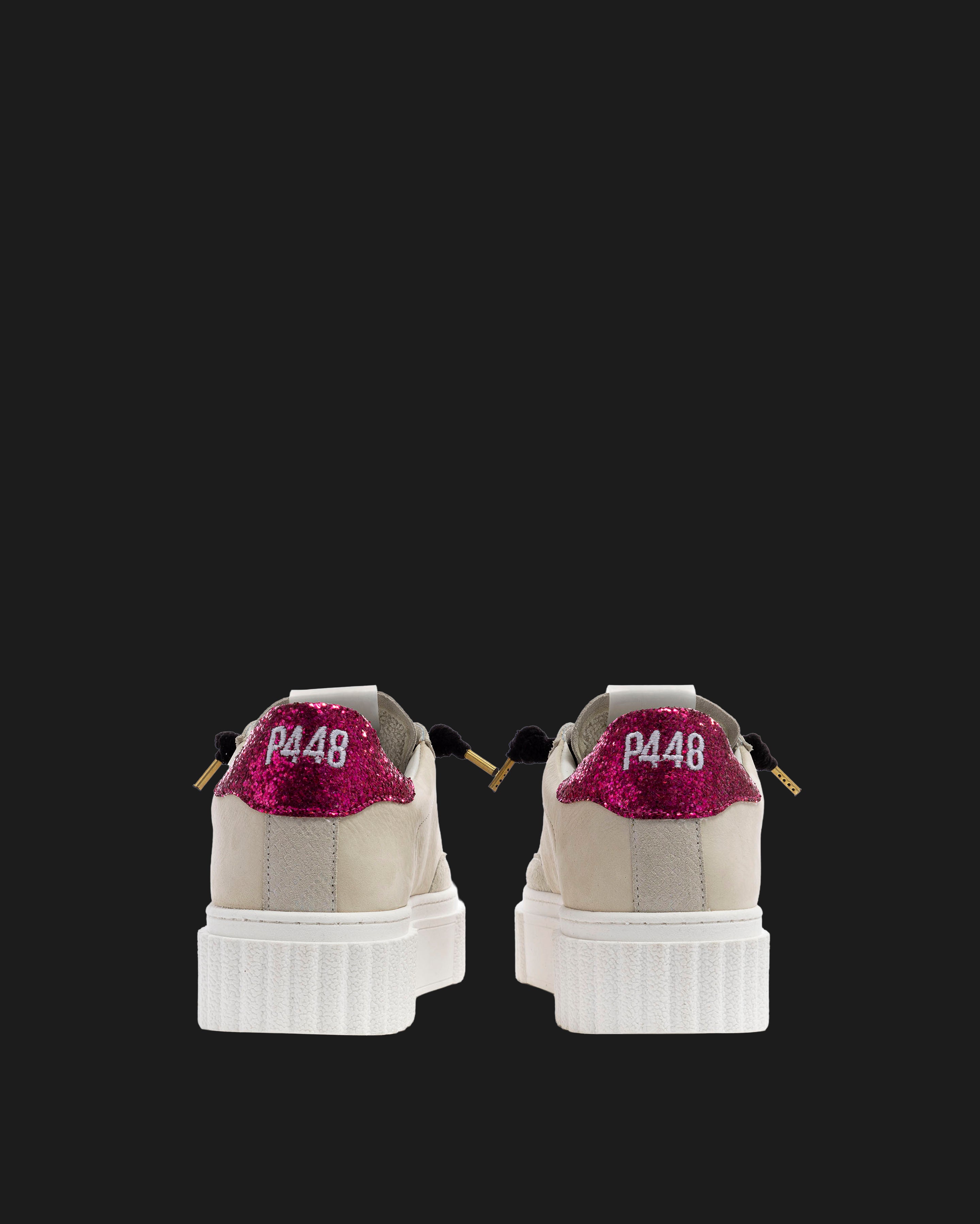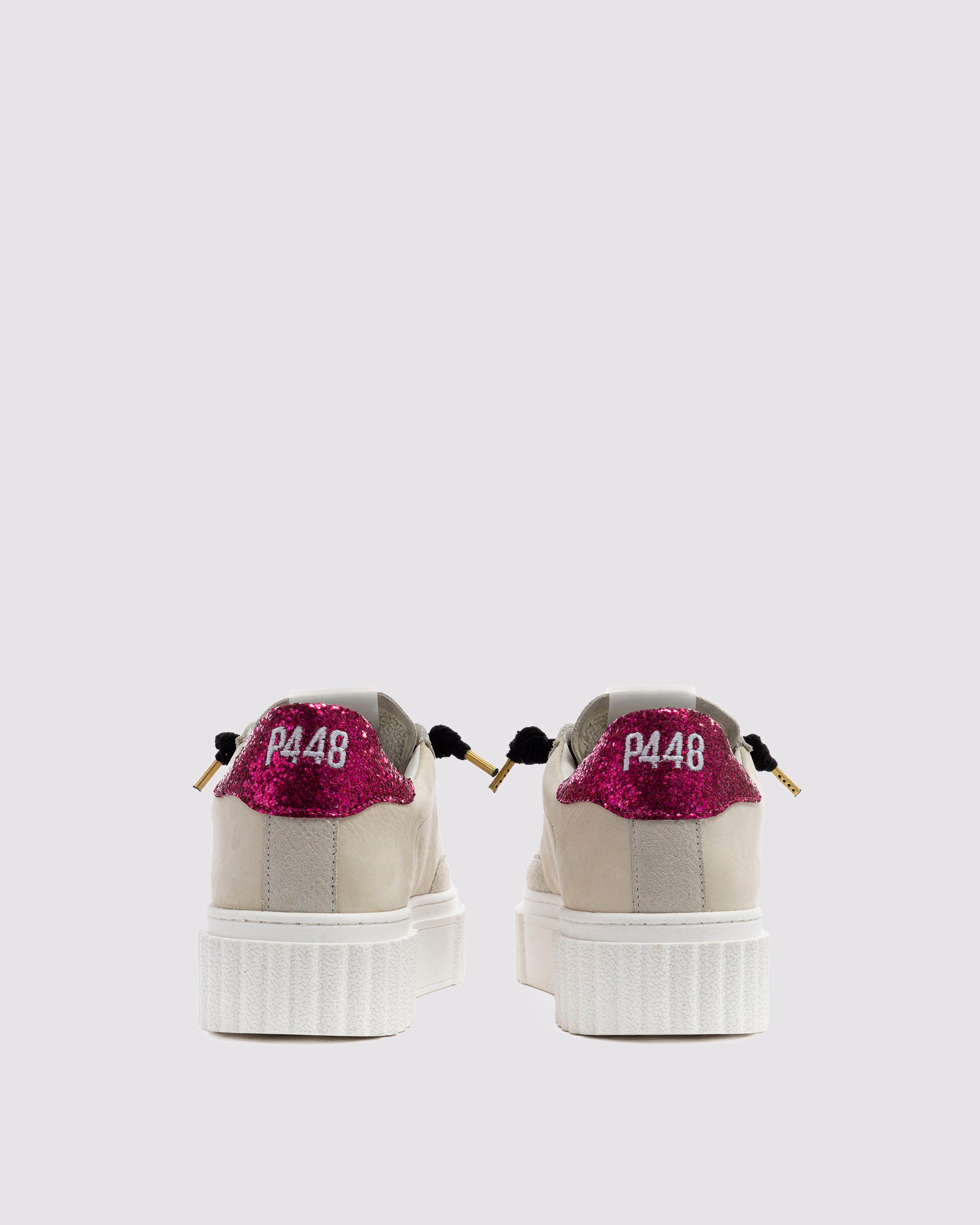 The Creeper Sand/Fuchsia is wrapped in cream nubuck leather and beige suede, accented by a fuchsia glitter heel tab and black laces. Our signature P448 white rubber sole gets a statement sneaker update with the bold platform crepe design.