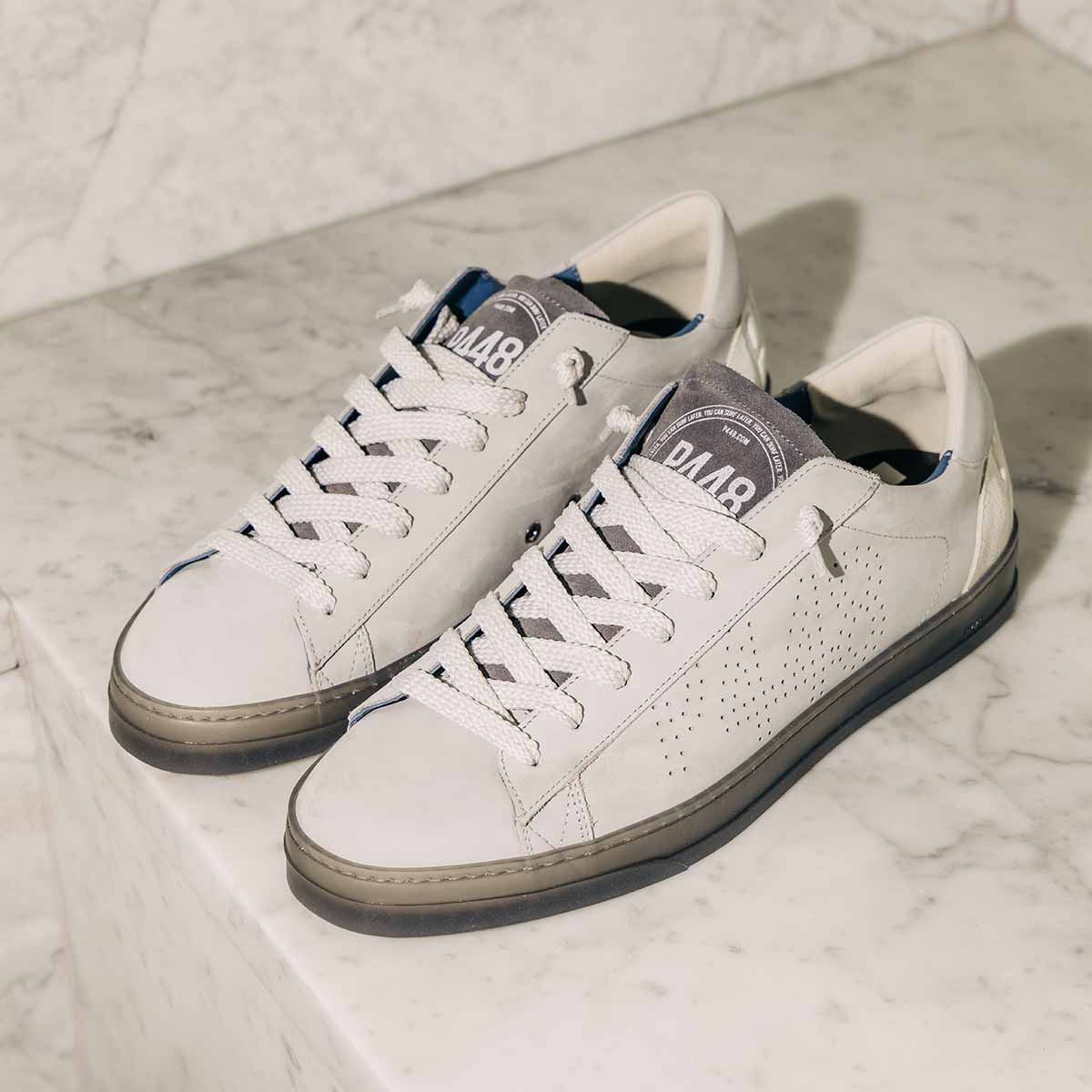 The Jack Shadow is wrapped in grey nubuck leather complemented by an dark grey suede tongue. White and silver laces and our P448 transparent grey rubber sole ground the look.