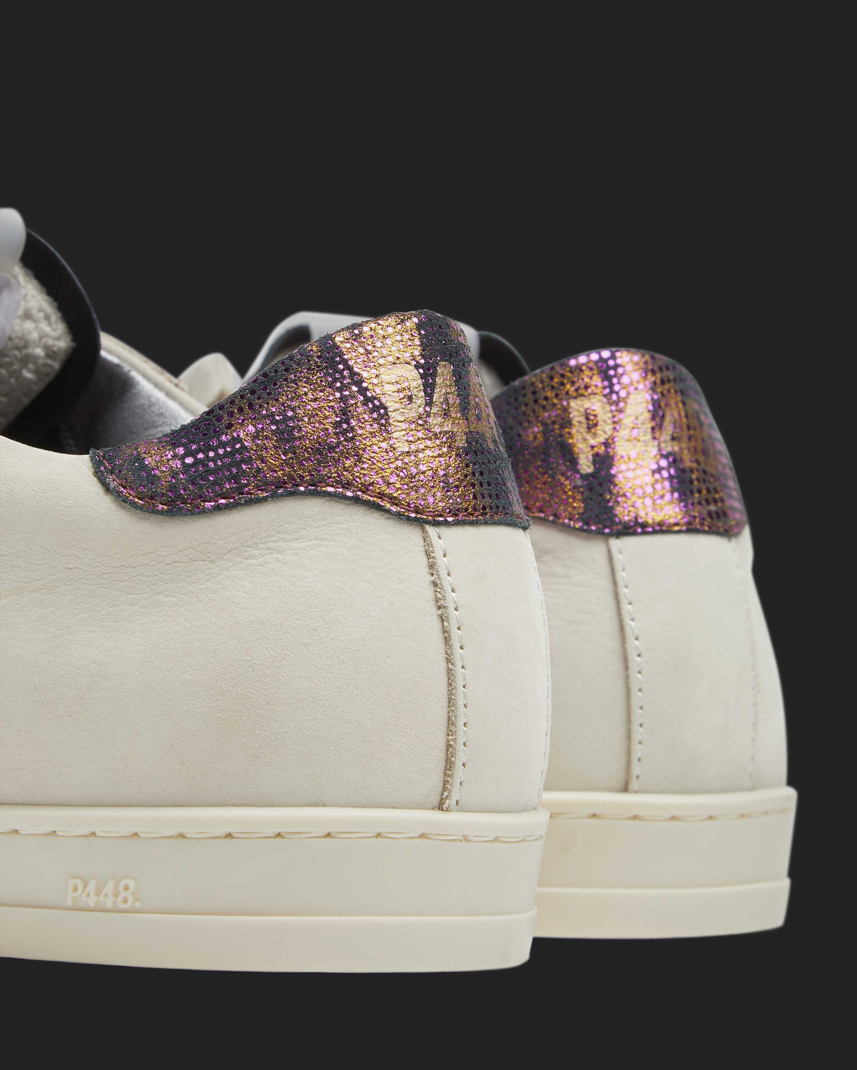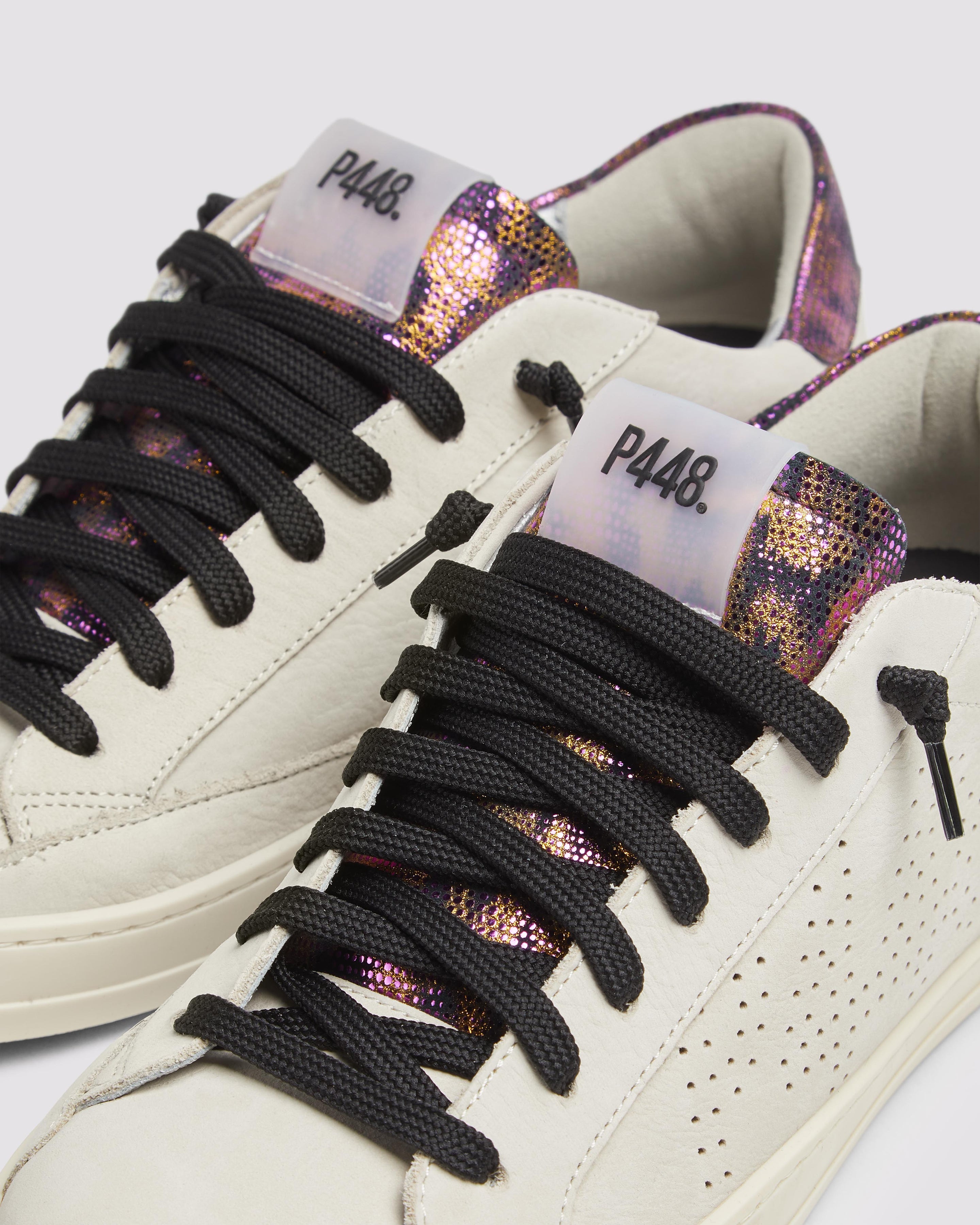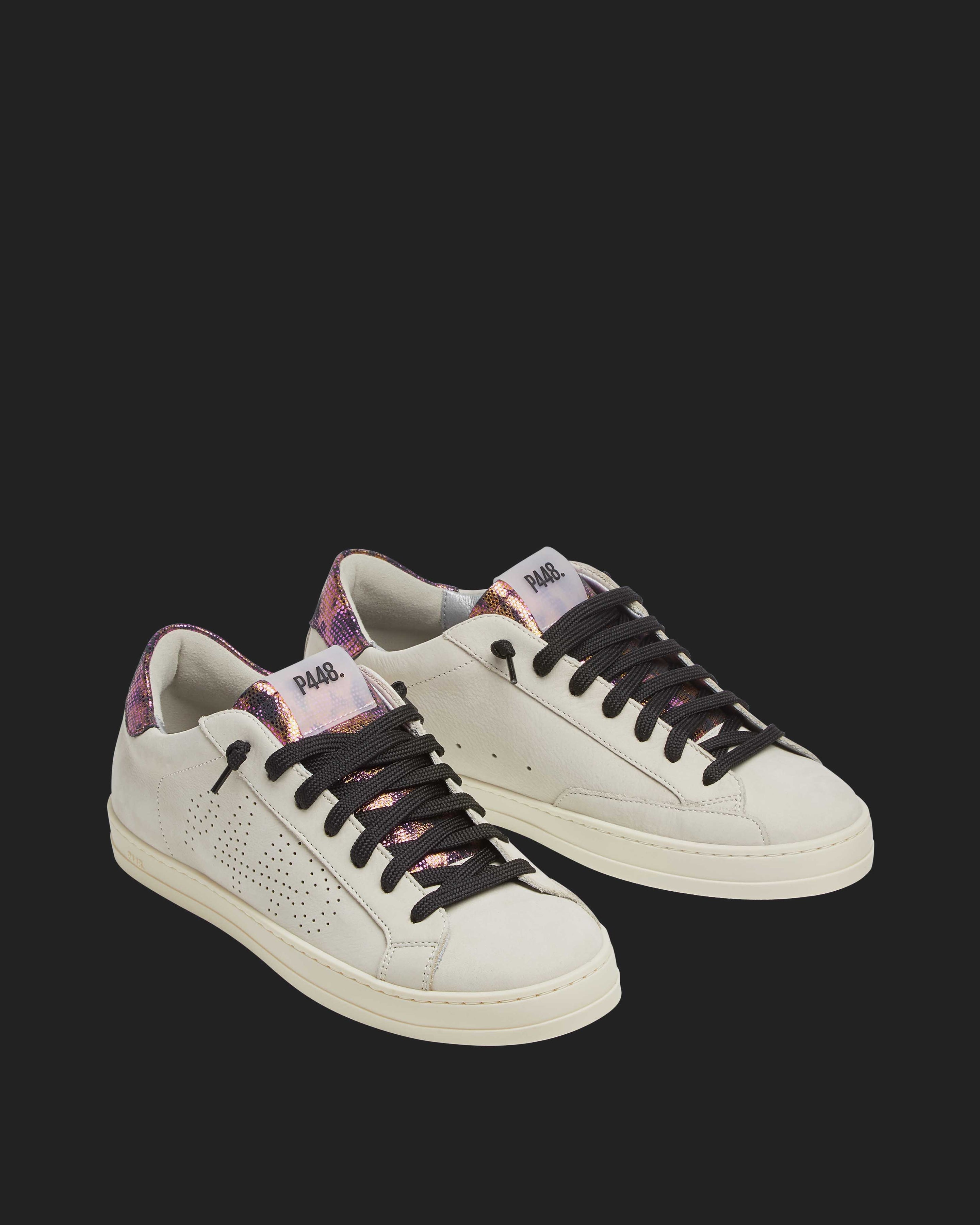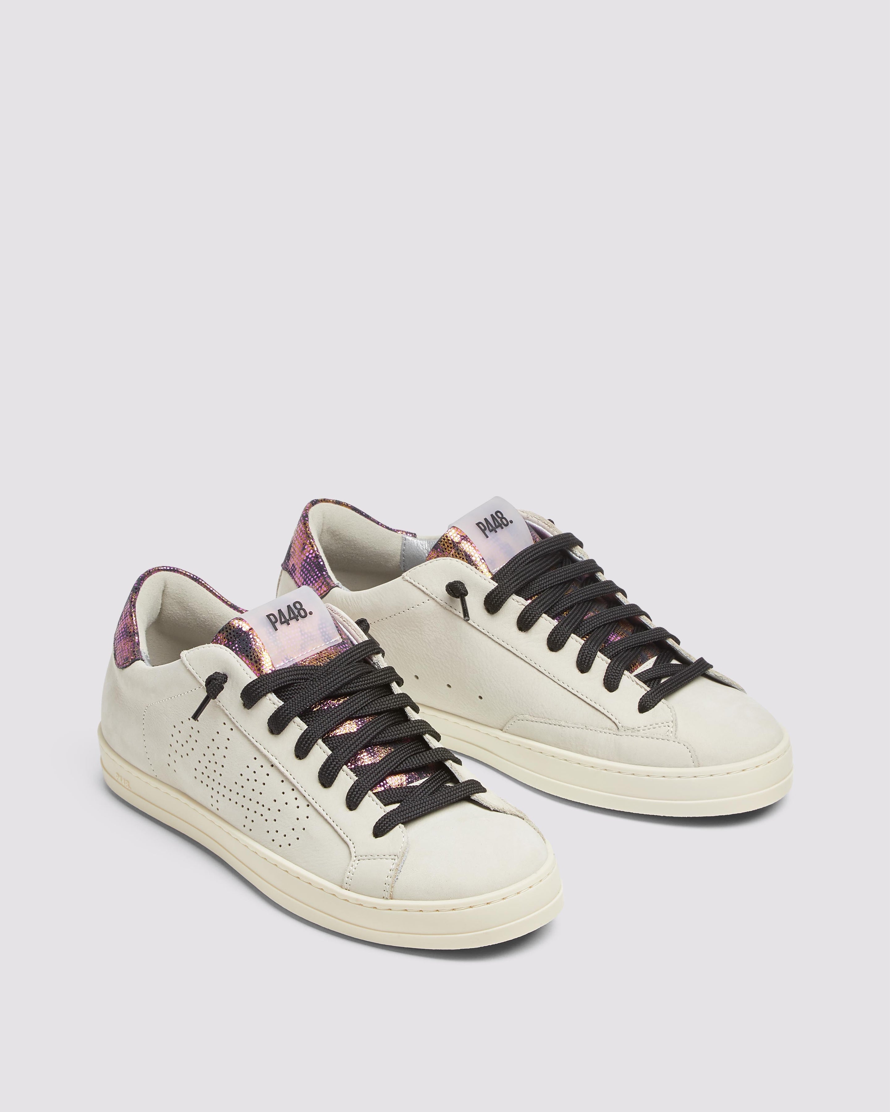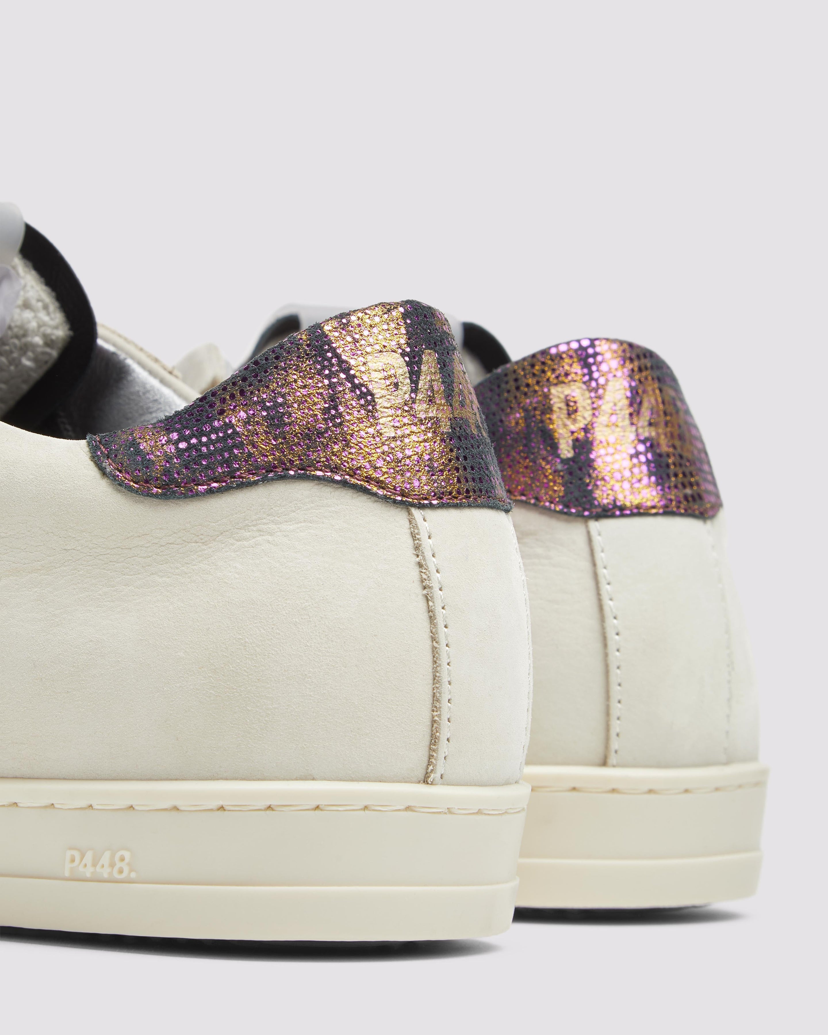 The John Nest/Sand features a cream nubuck leather upper with a perforated P448 logo, accented by a black suede tongue and heel tab detailed with gold and pink metallic dots. Black laces and our signature P448 rubber soles with black tread complete the look.