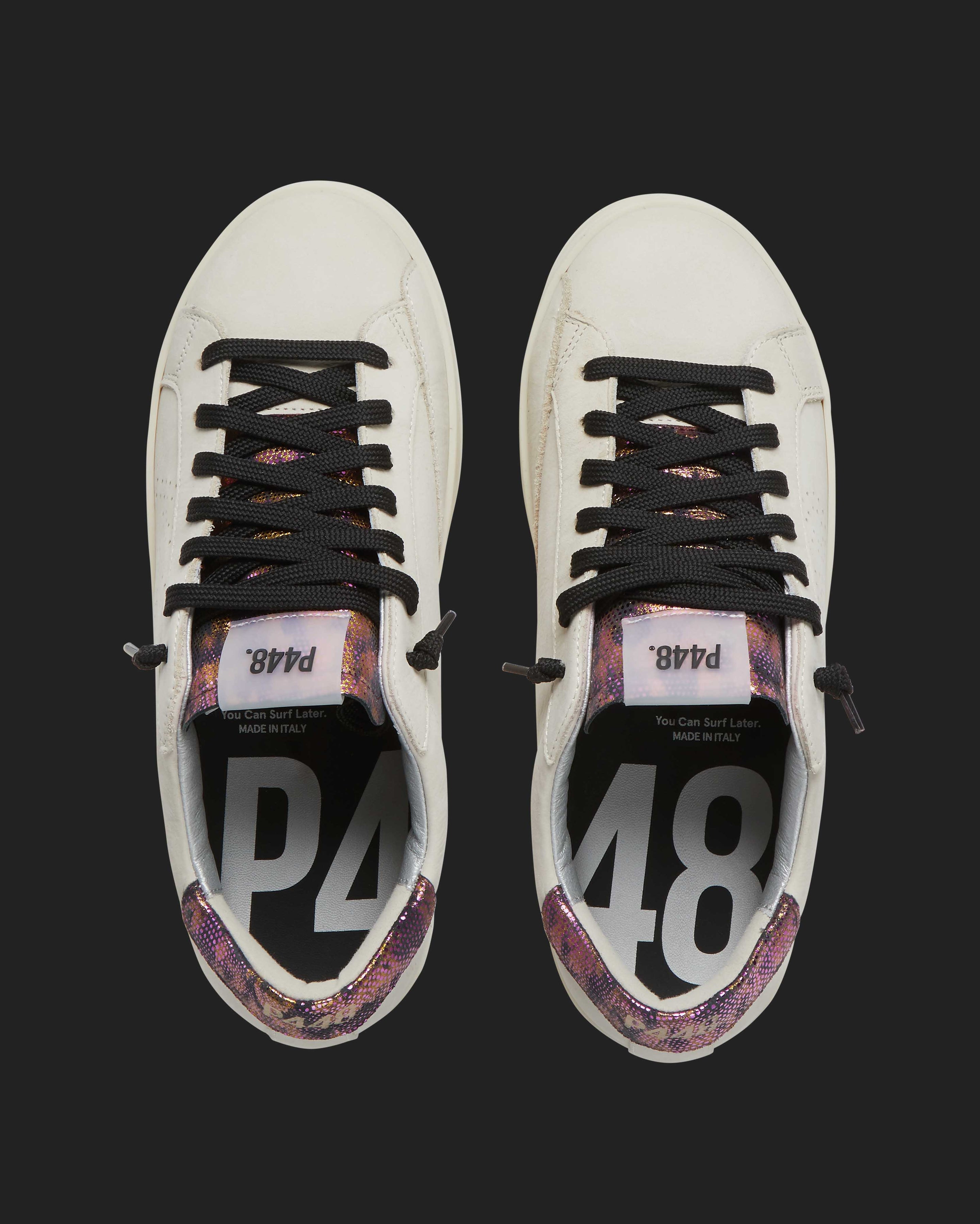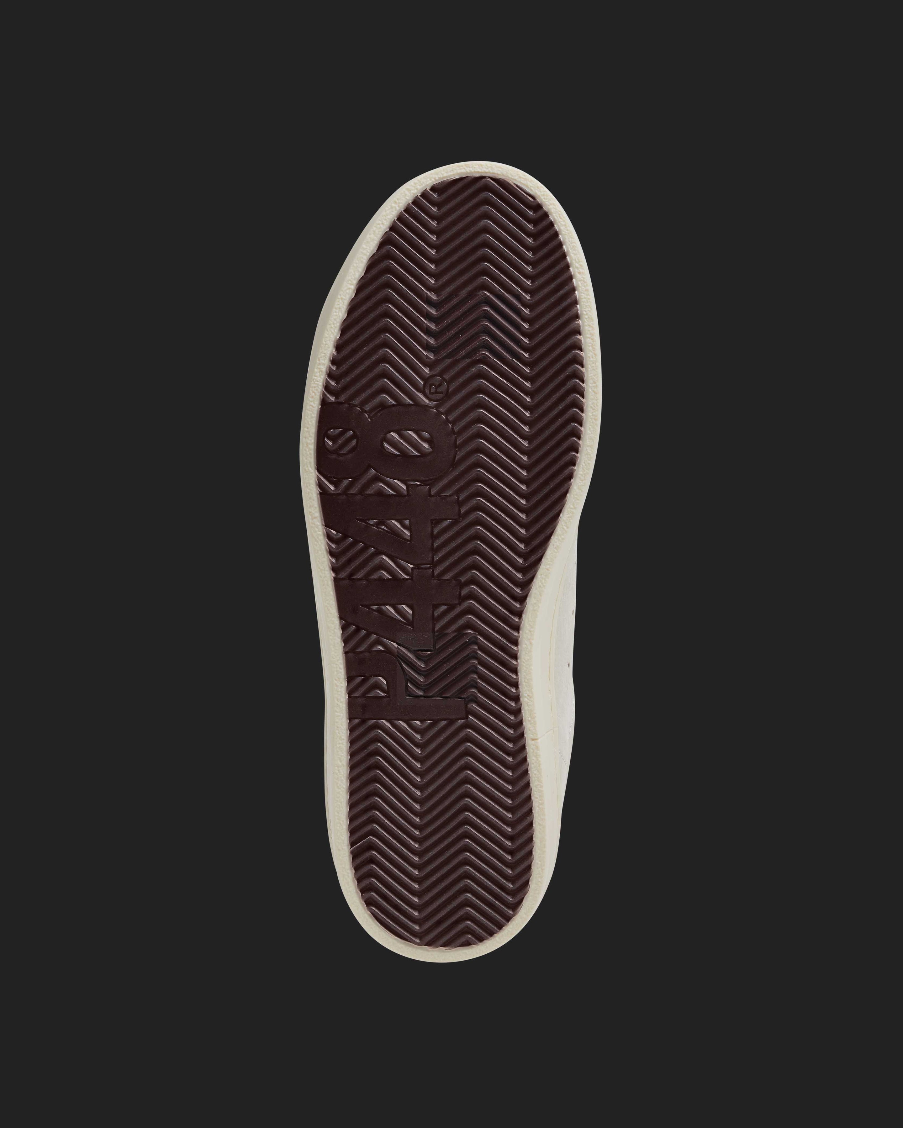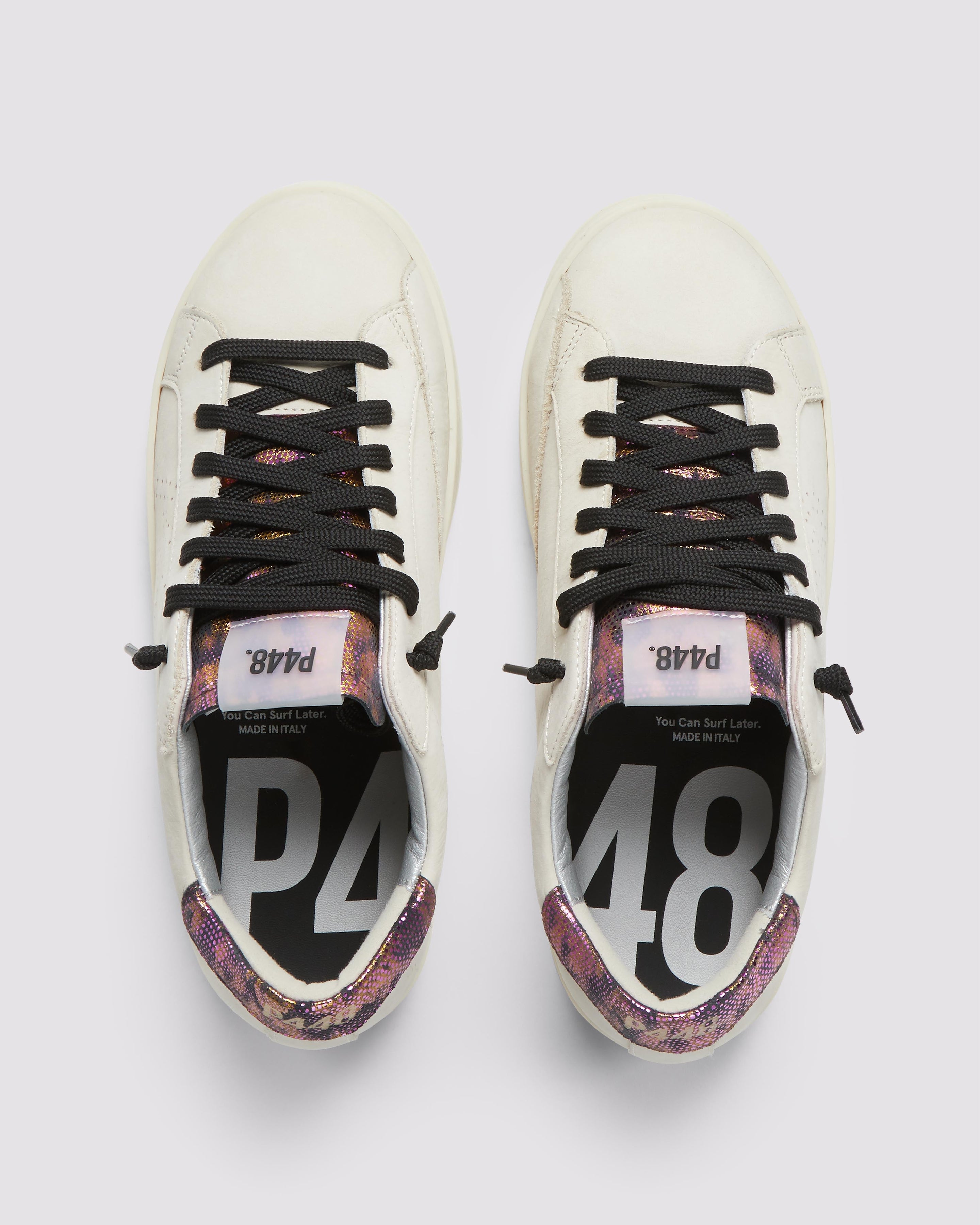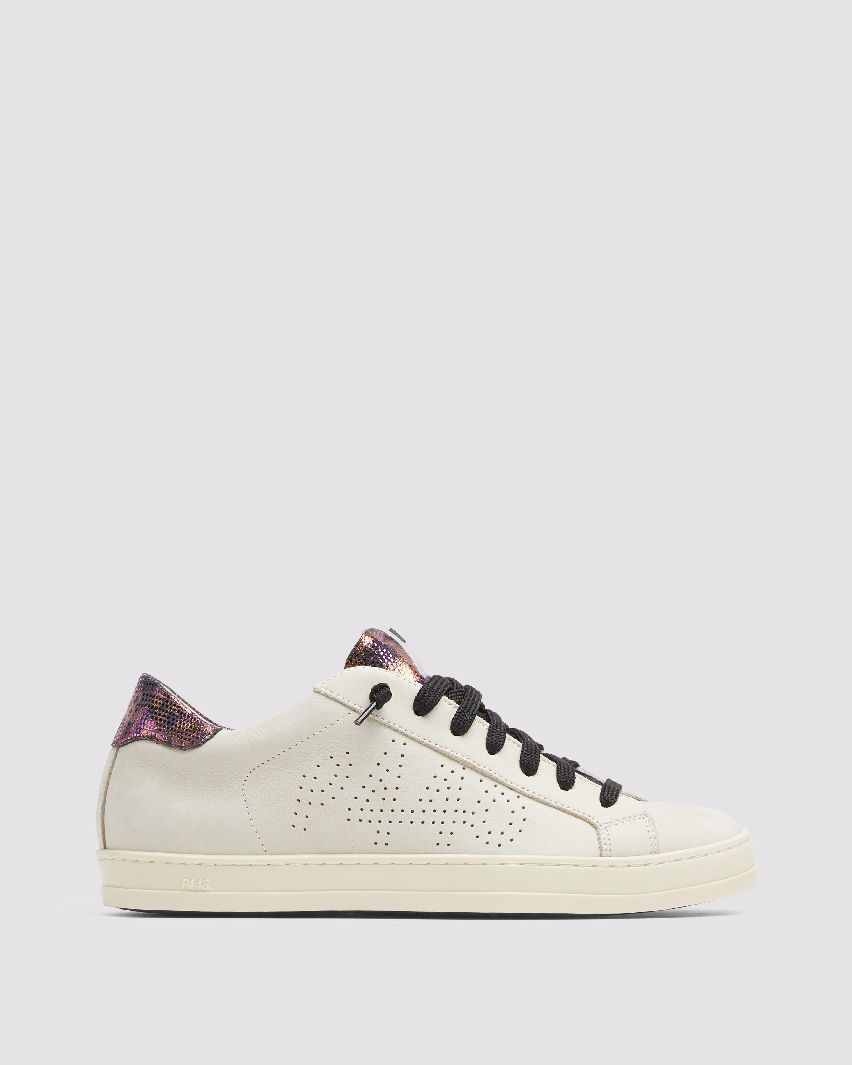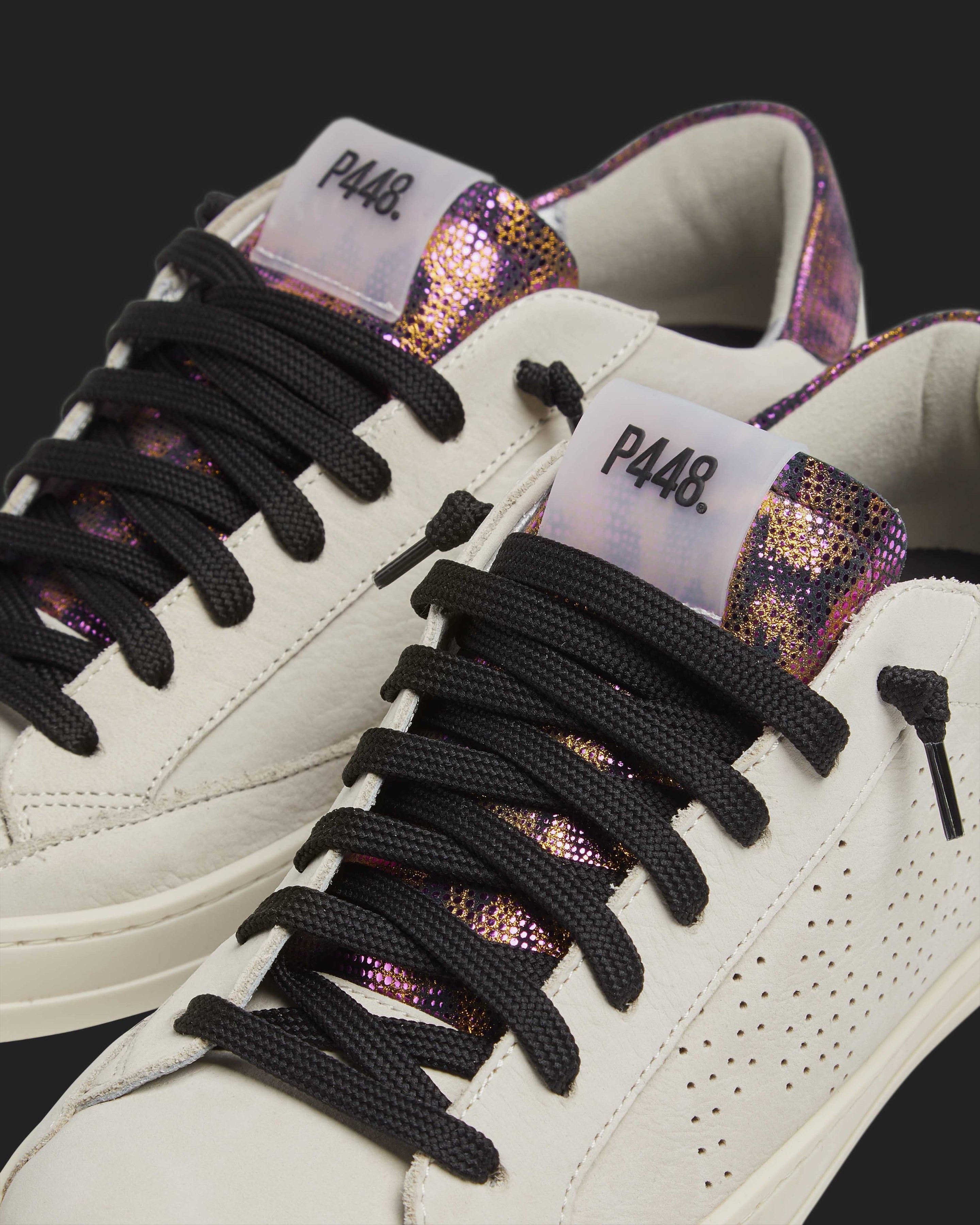 The John Nest/Sand features a cream nubuck leather upper with a perforated P448 logo, accented by a black suede tongue and heel tab detailed with gold and pink metallic dots. Black laces and our signature P448 rubber soles with black tread complete the look.