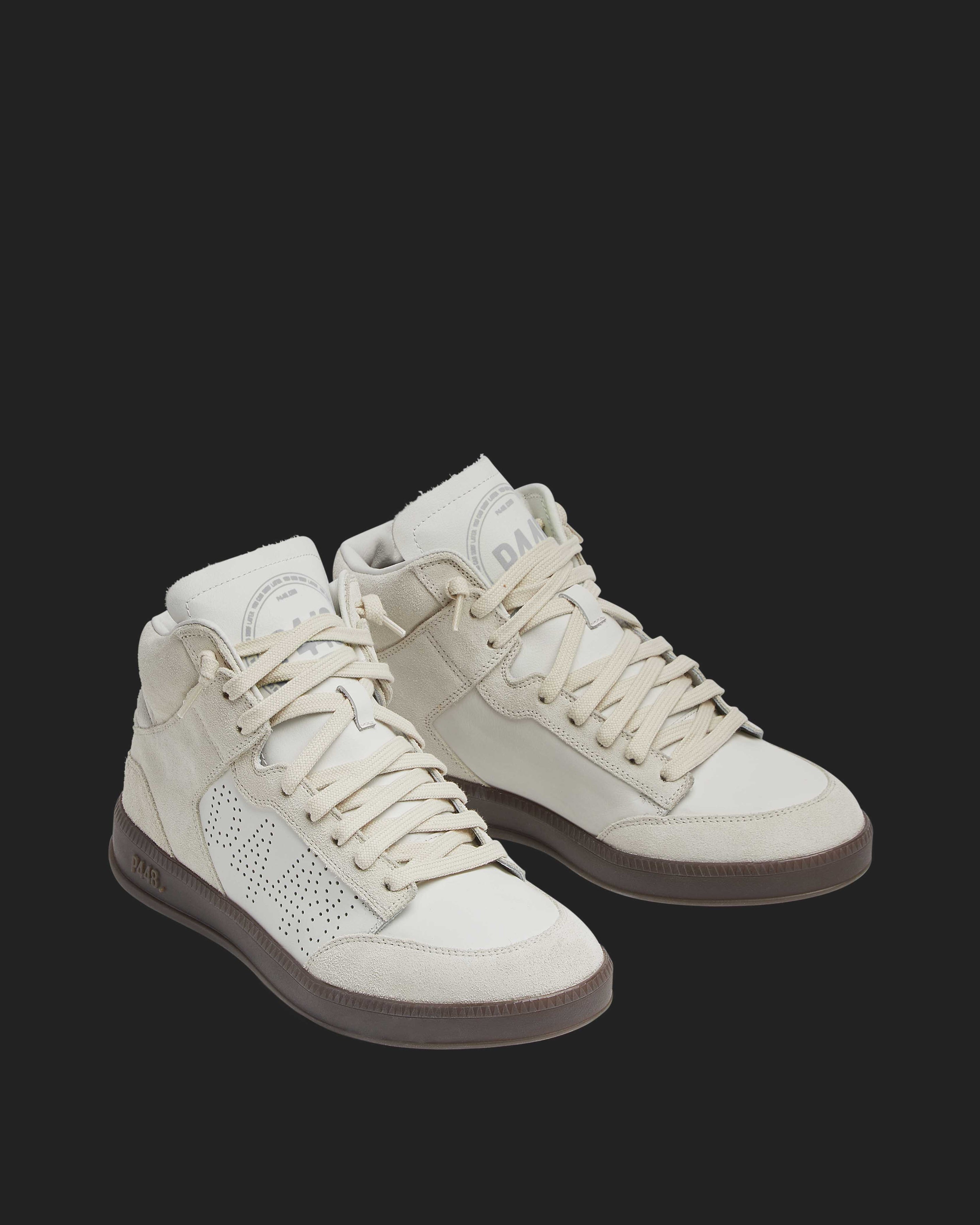 The London White features all-over white leather and beige suede accents. Beige cotton laces and our signature P448 dark brown...