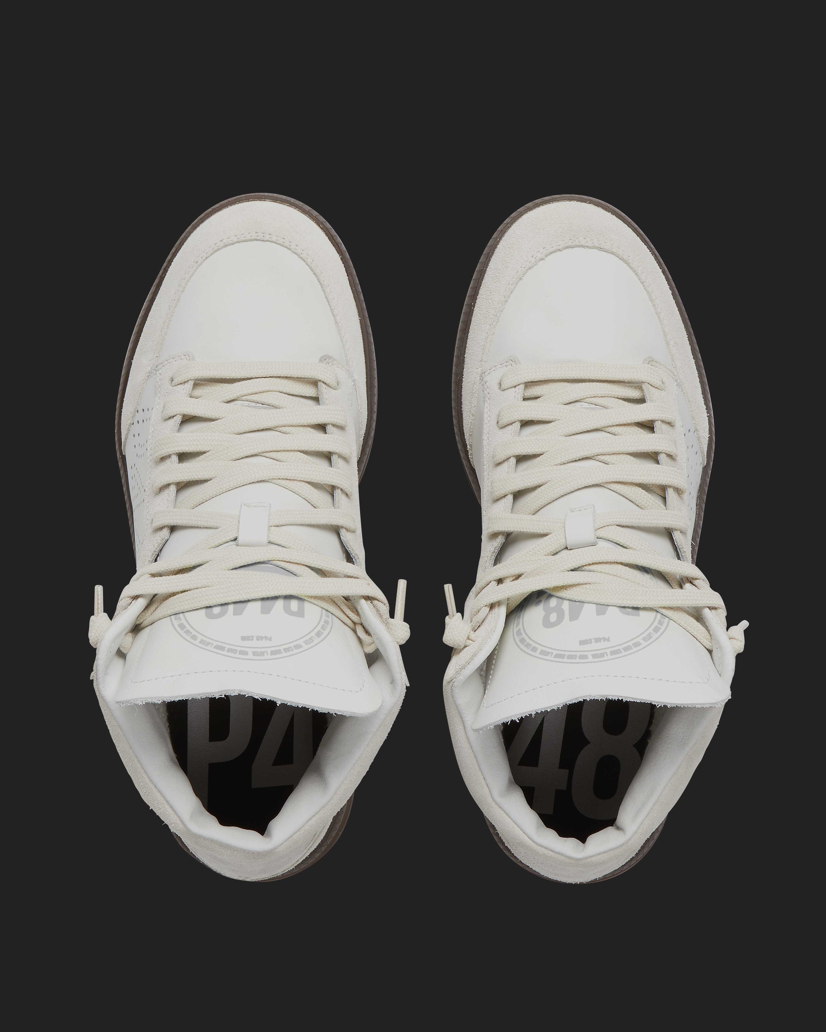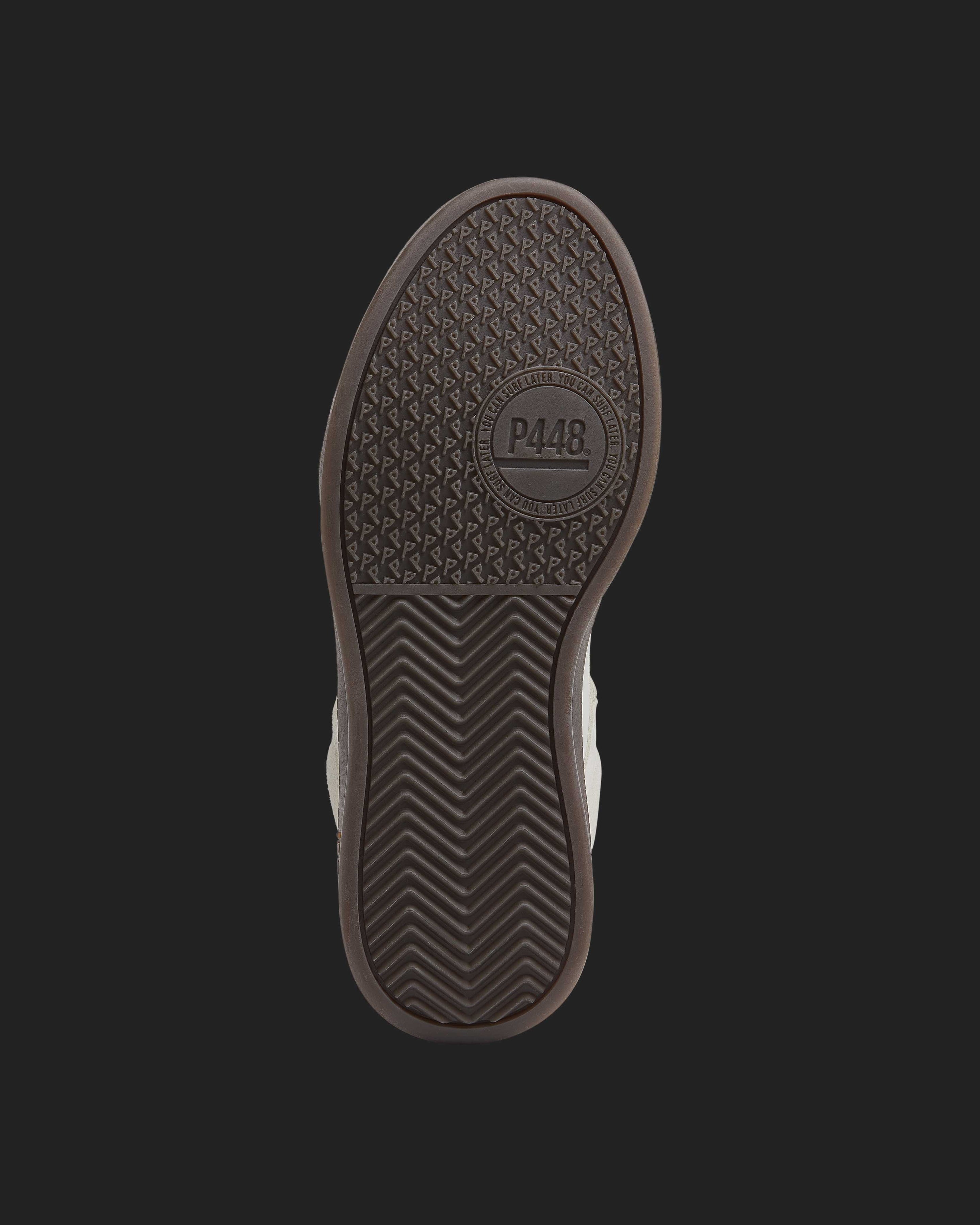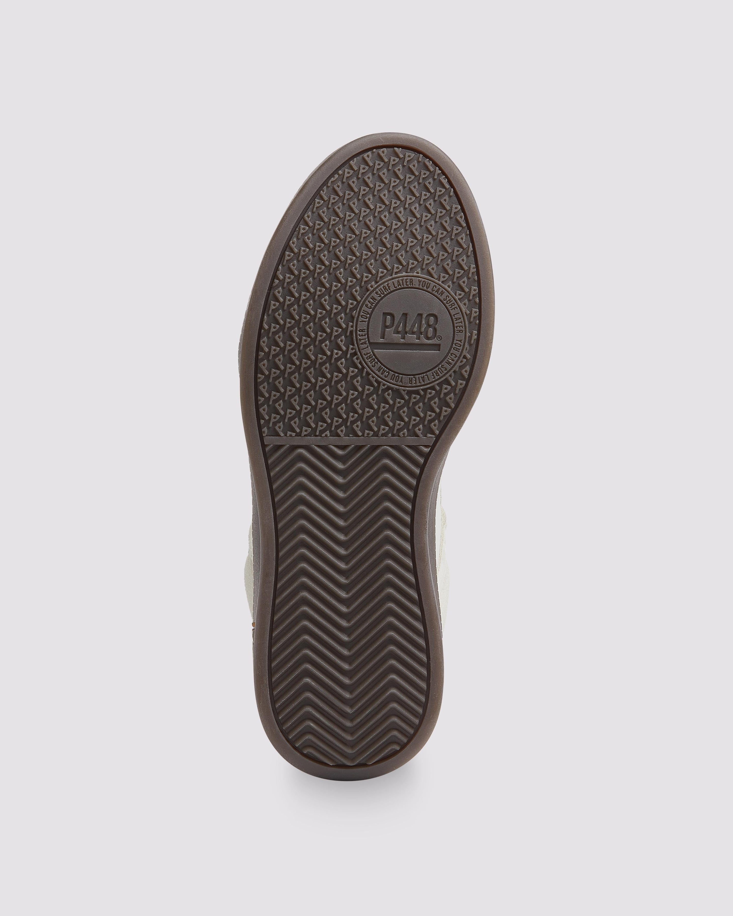 The London White features all-over white leather and beige suede accents. Beige cotton laces and our signature P448 dark brown rubber soles tie it all together.