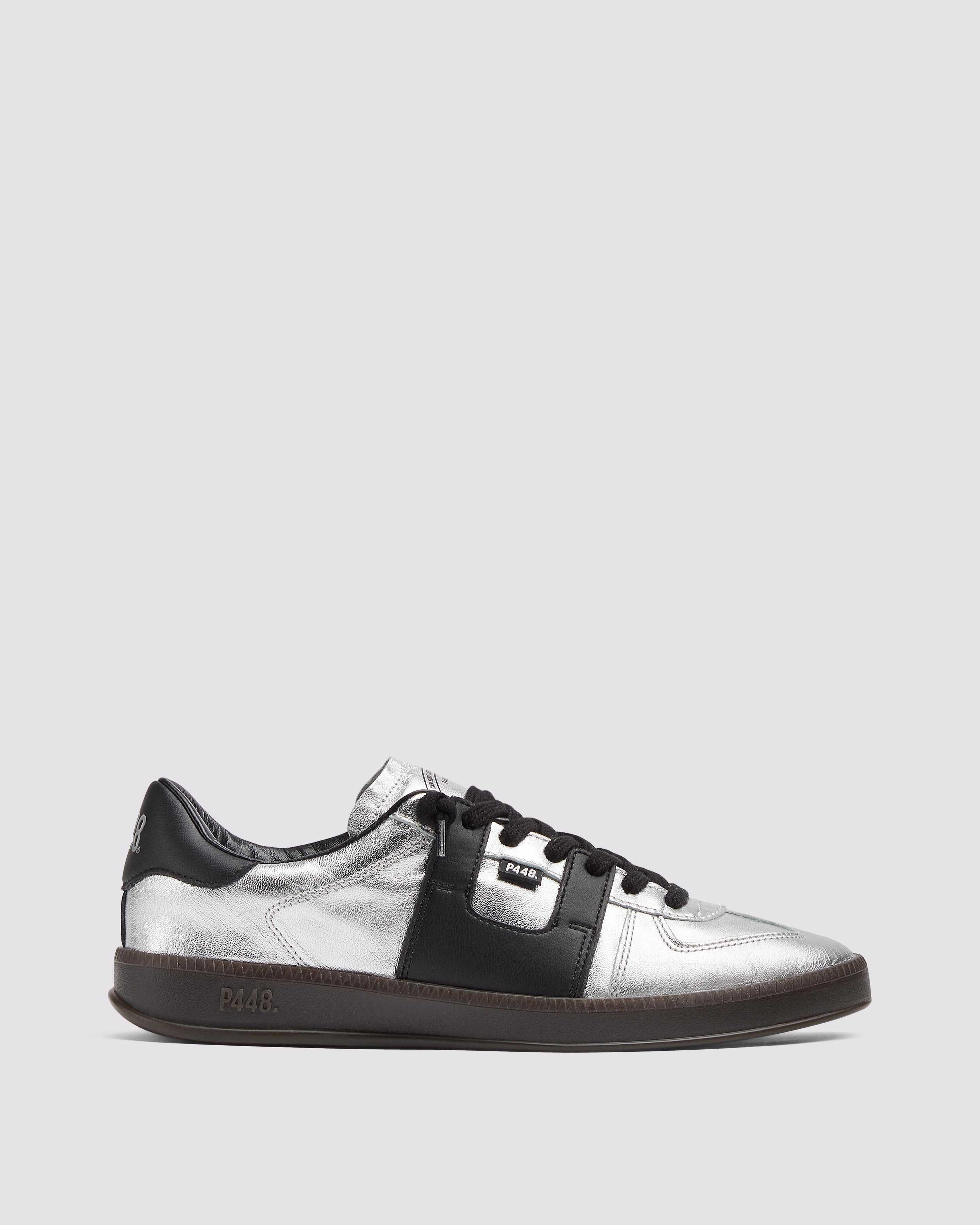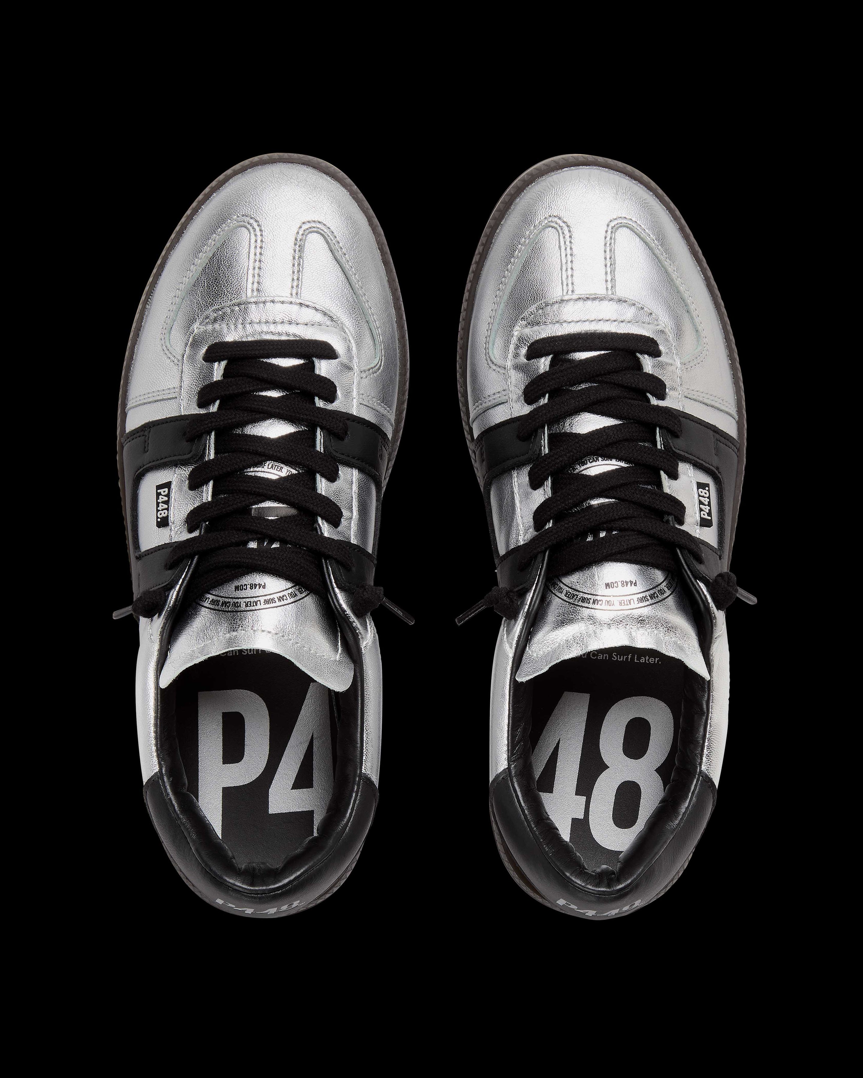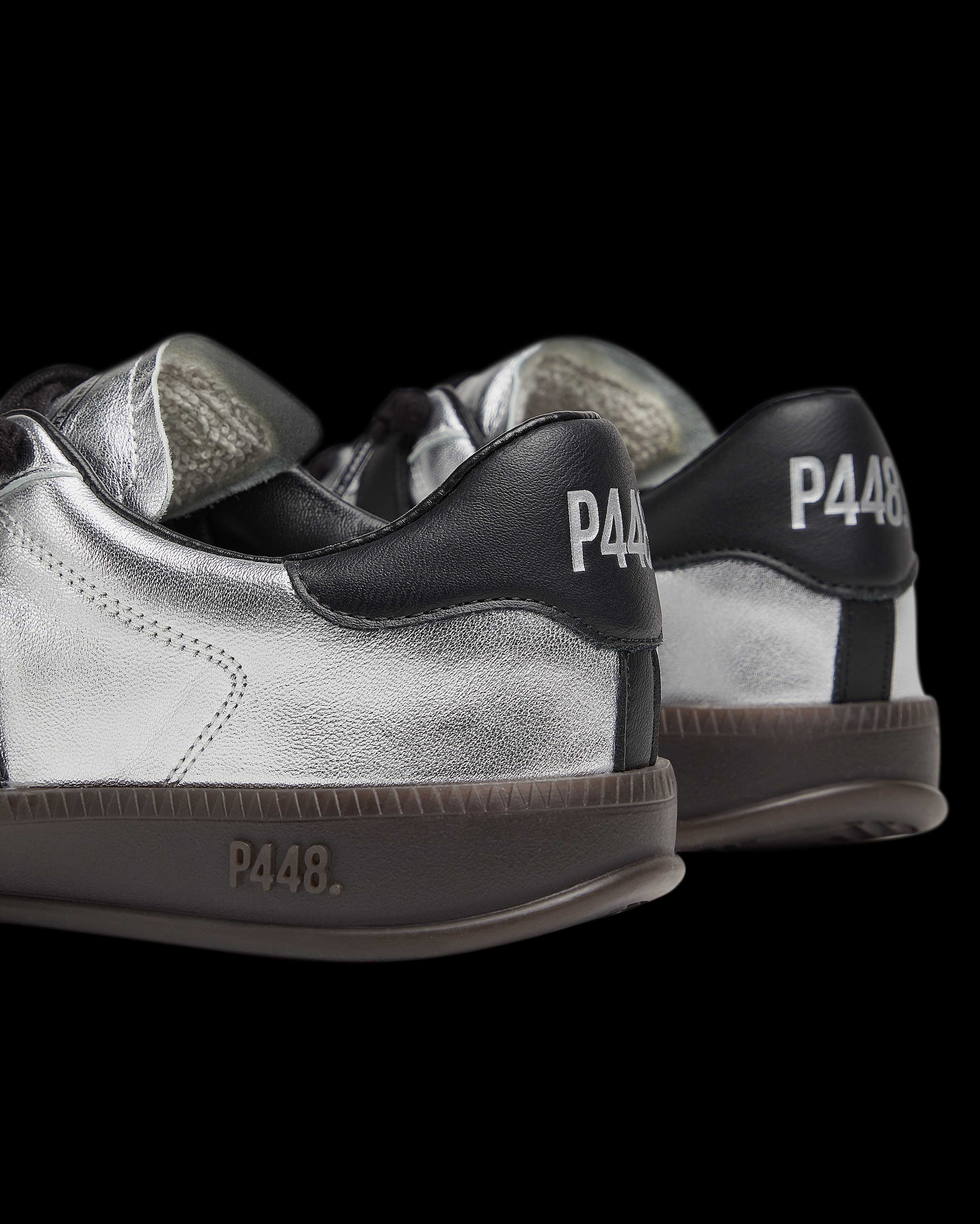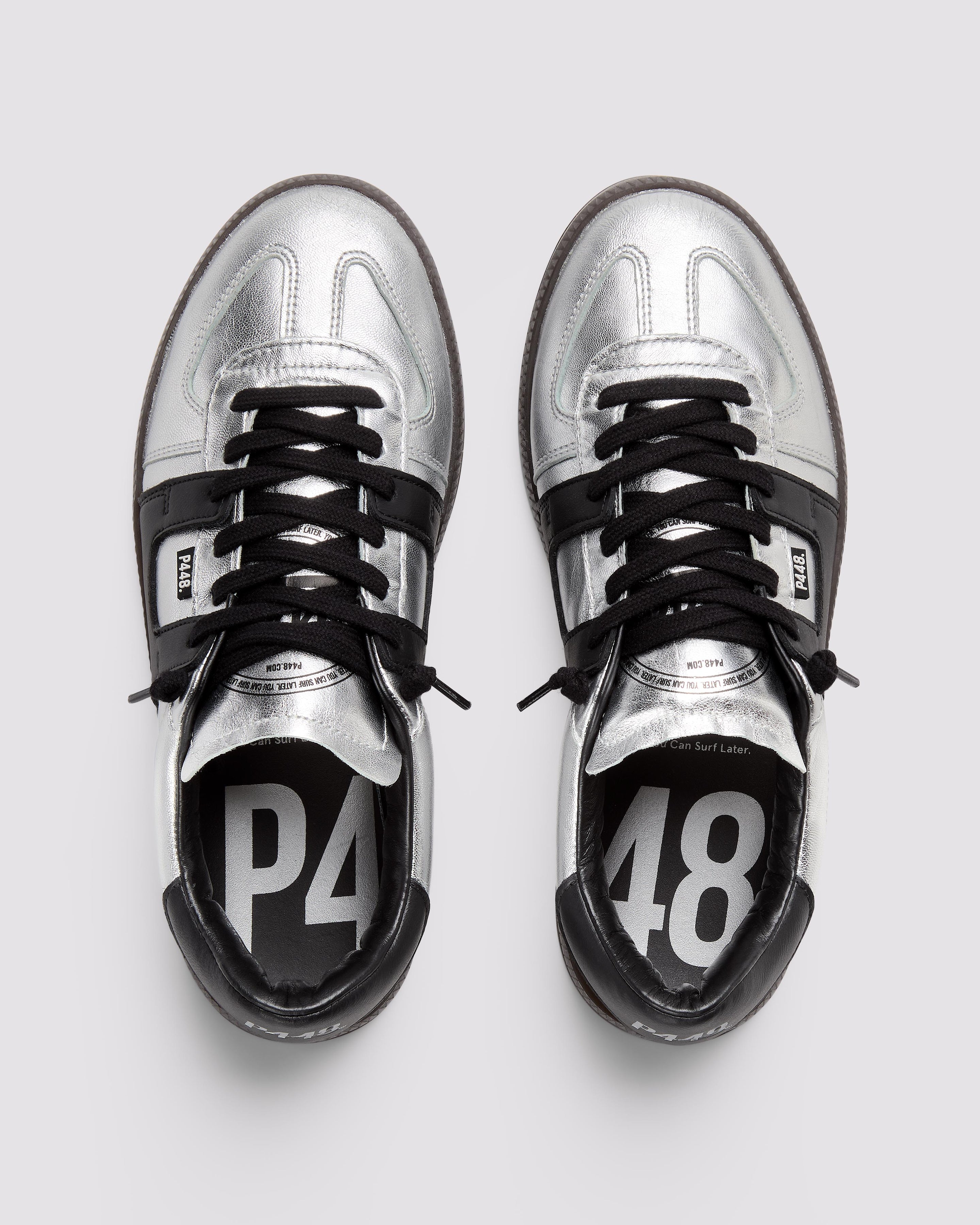 The Monza Silver features all-over silver leather accented by a black leather heel tab. Black cotton laces and our signature P448 dark brown rubber soles finish off the look.