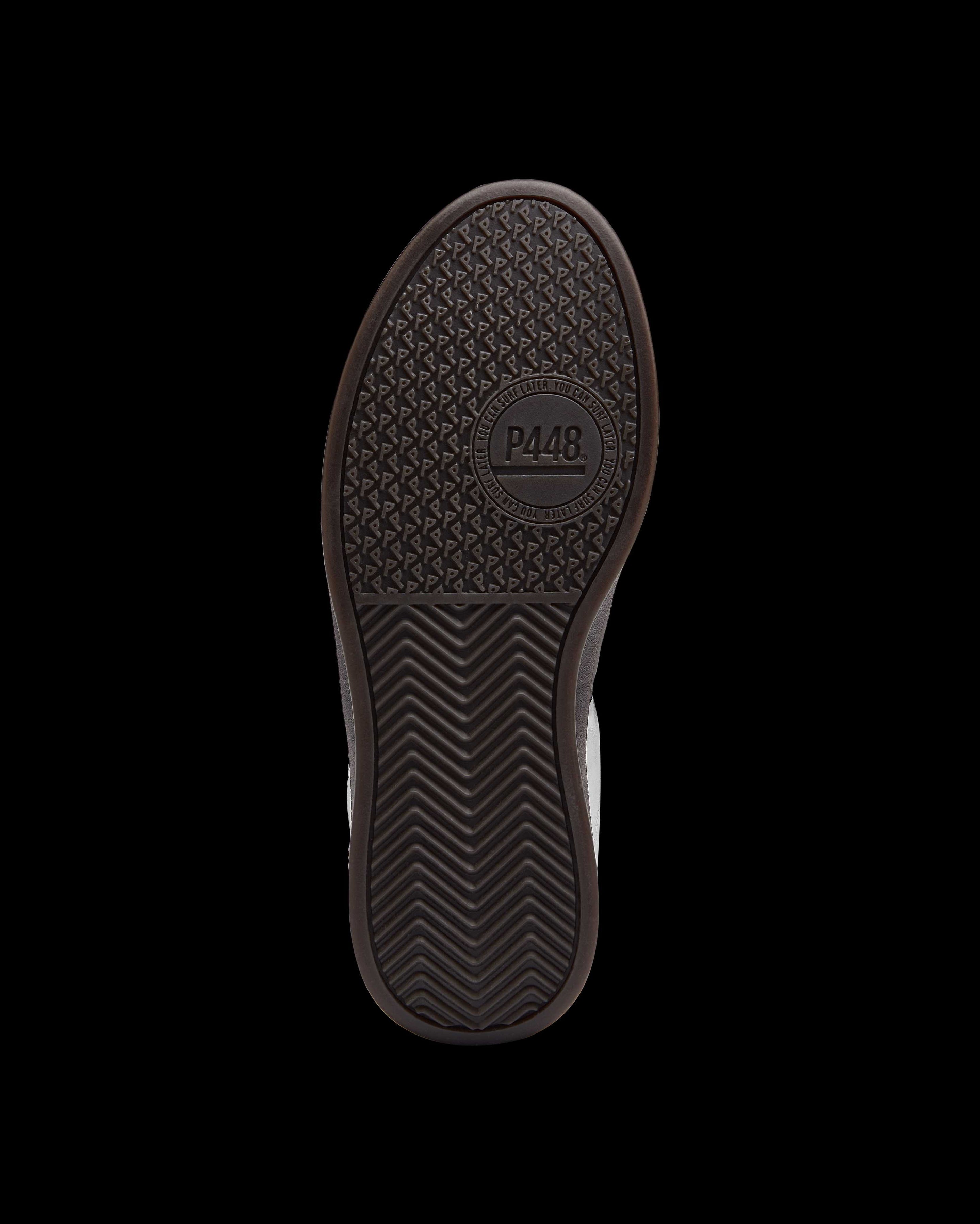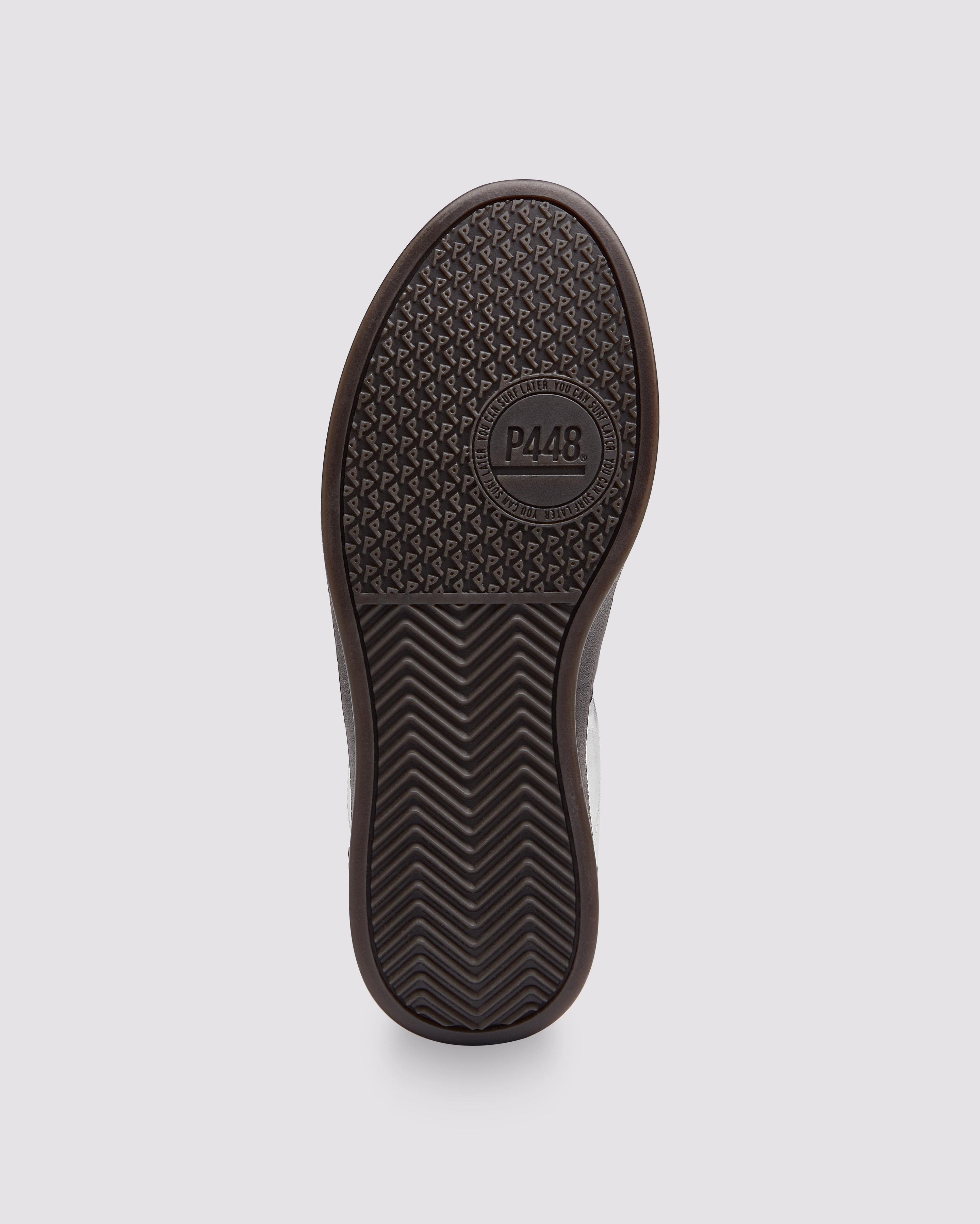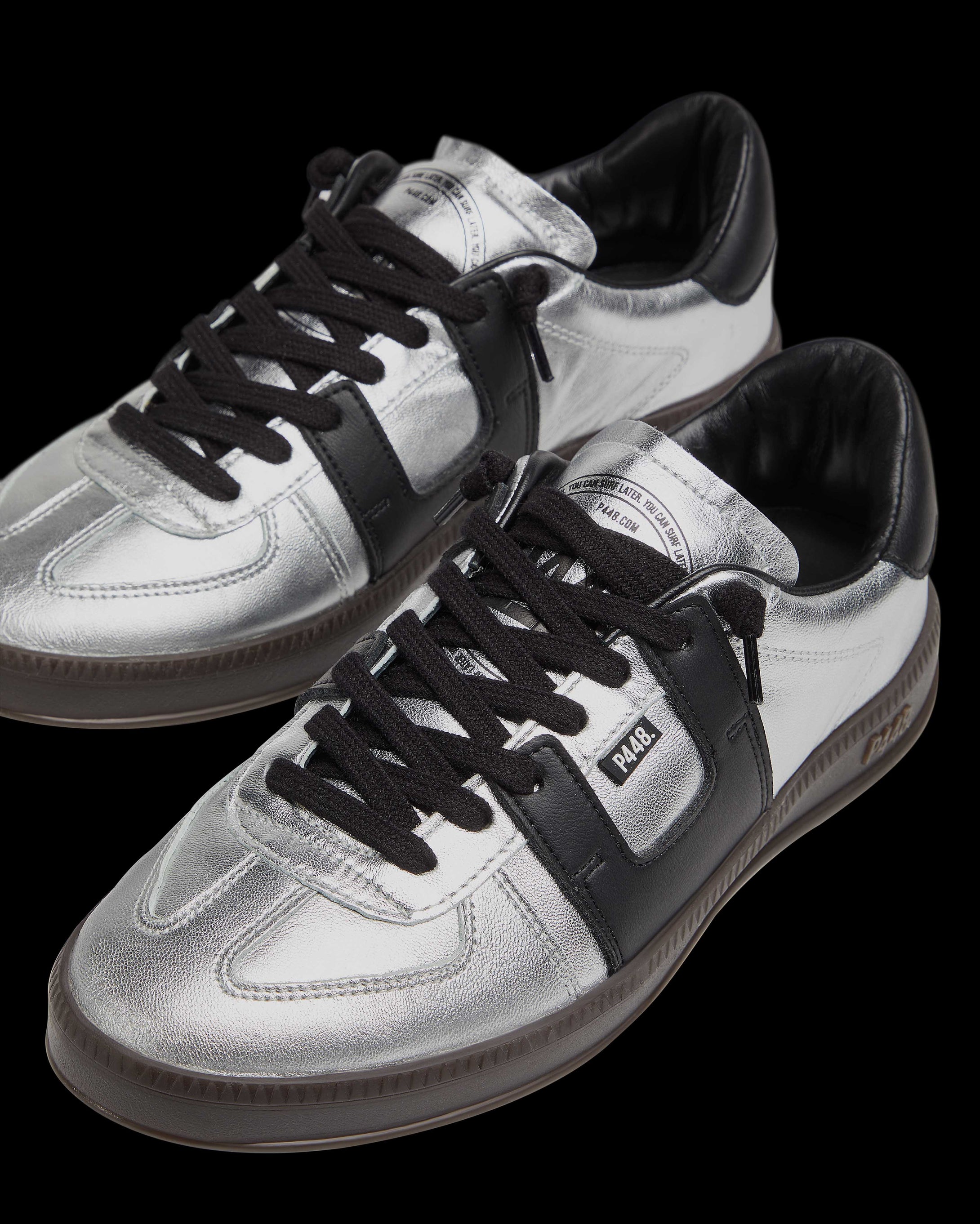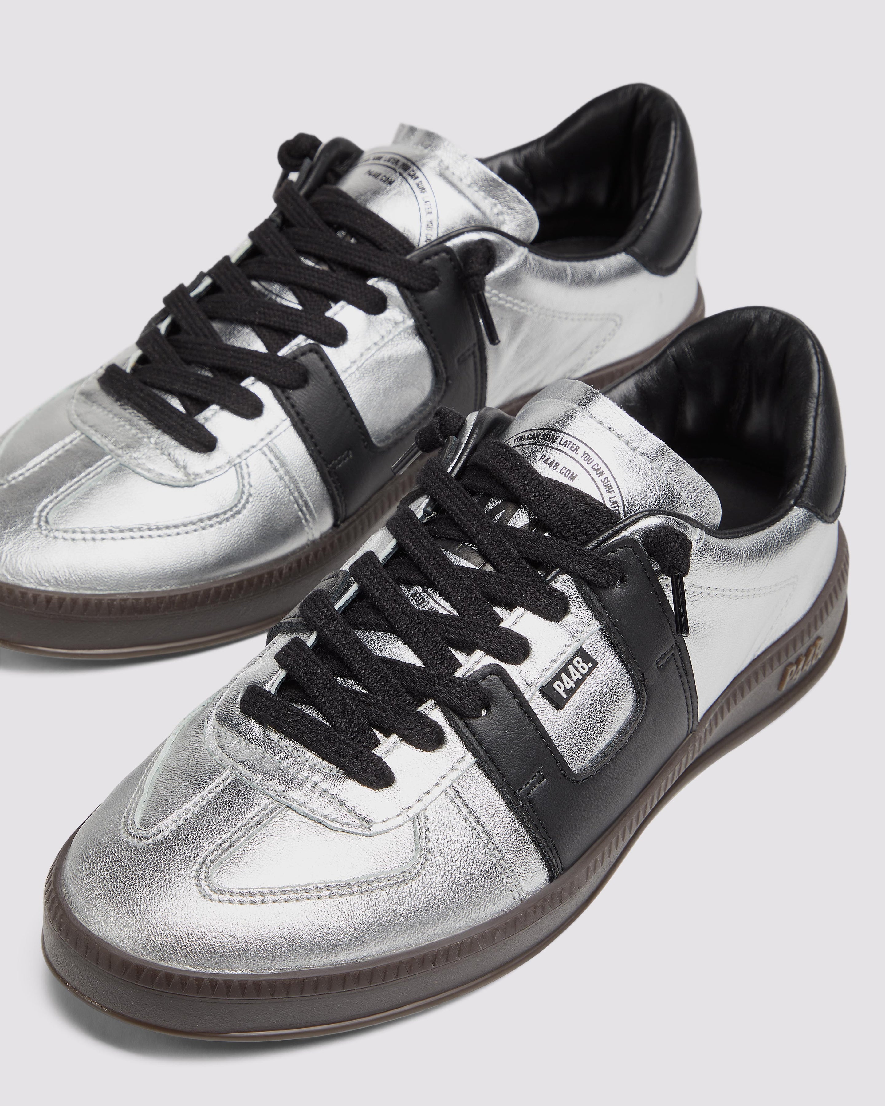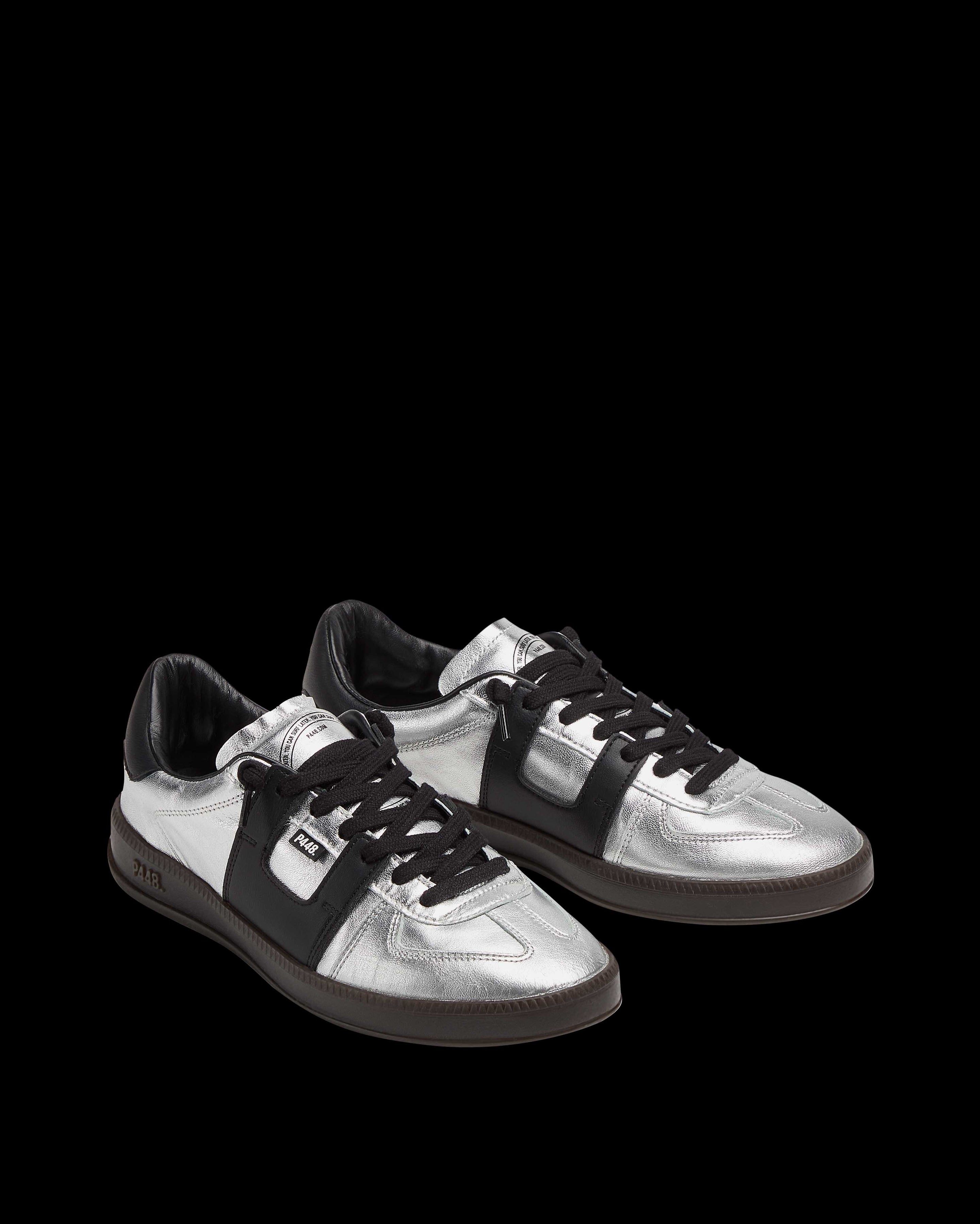 The Monza Silver features all-over silver leather accented by a black leather heel tab. Black cotton laces and our signature P448 dark brown rubber soles finish off the look.
