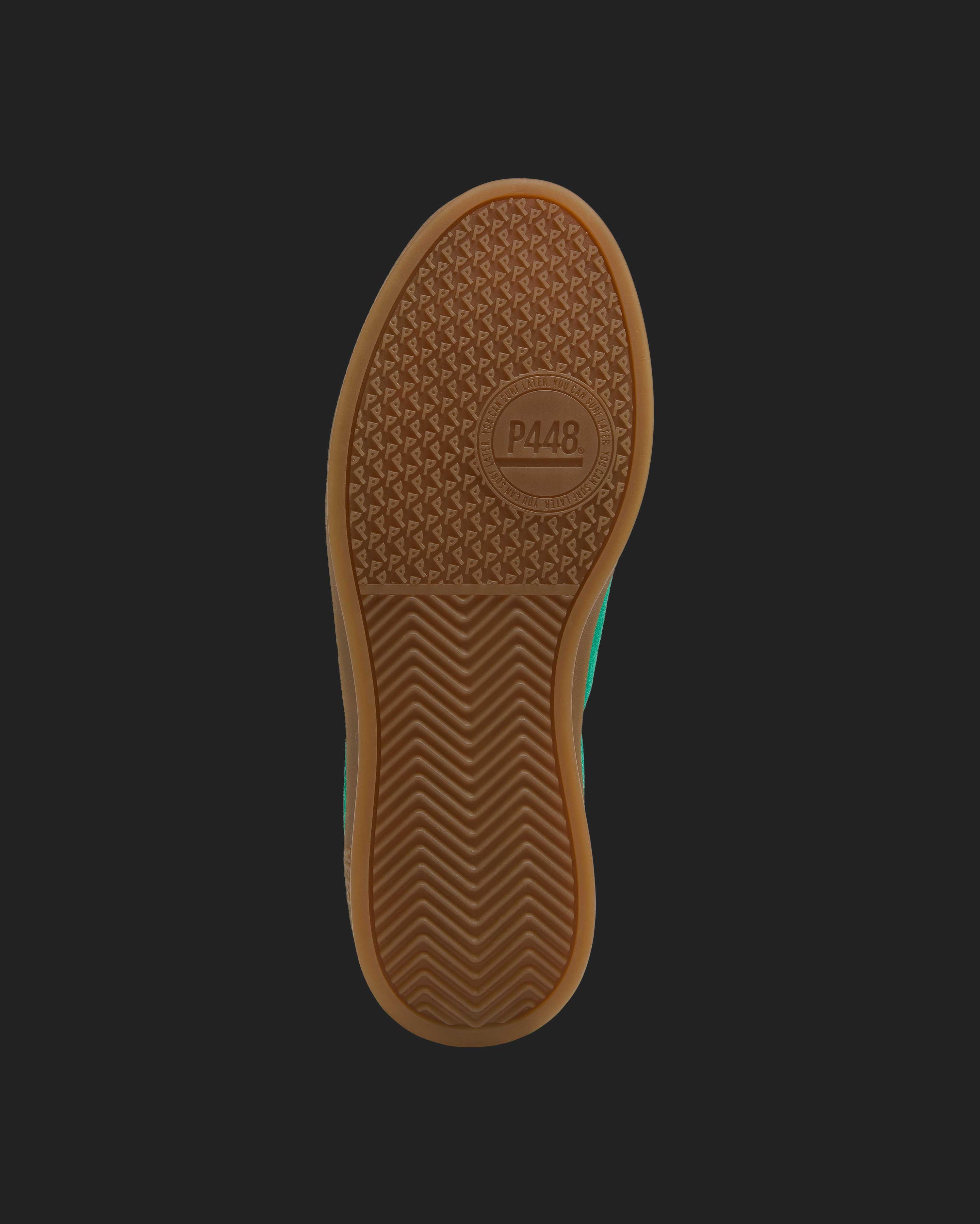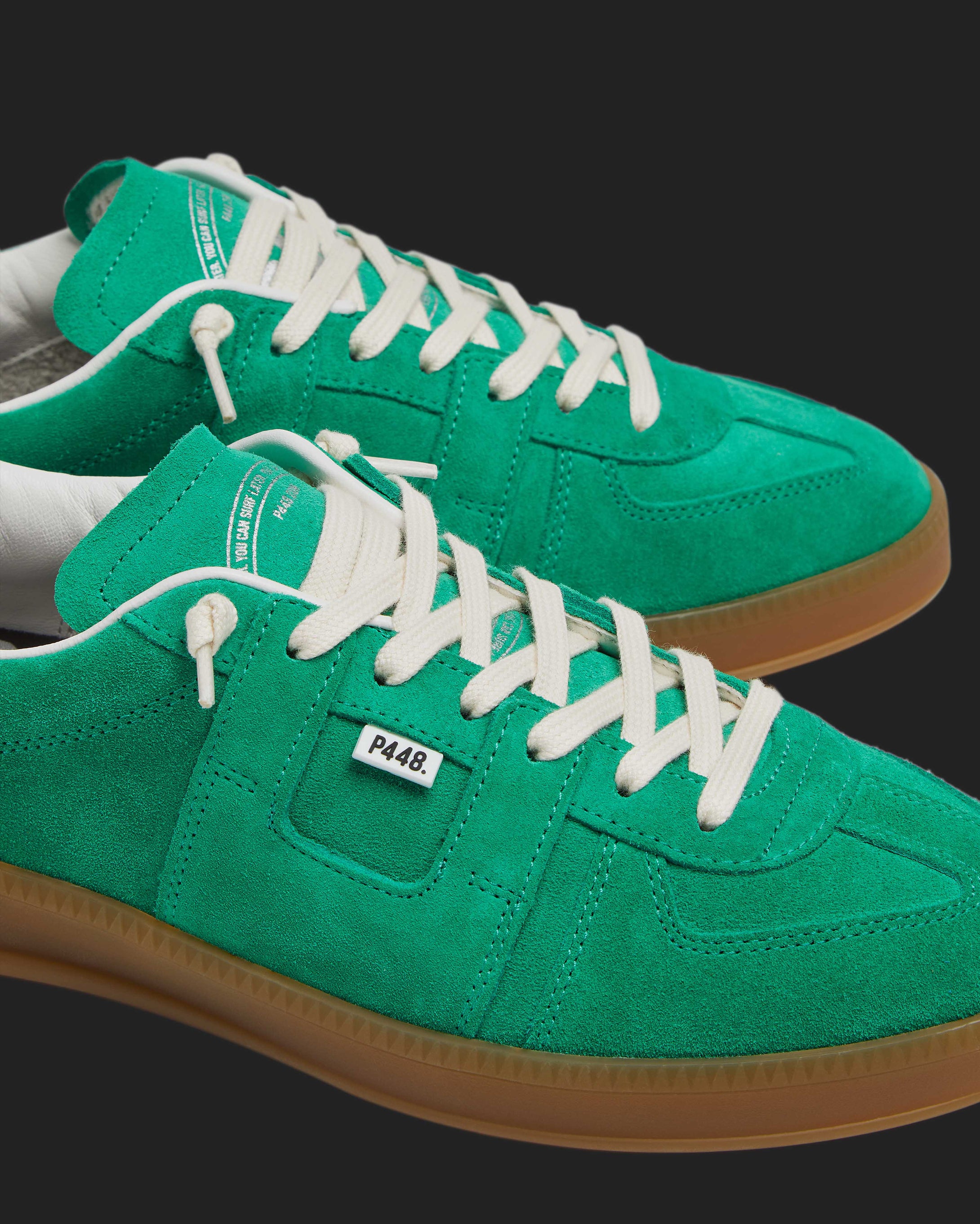 The Monza Green features all-over green suede finished with our signature P448 amber gum soles. Off-white cotton laces finish off the look.
