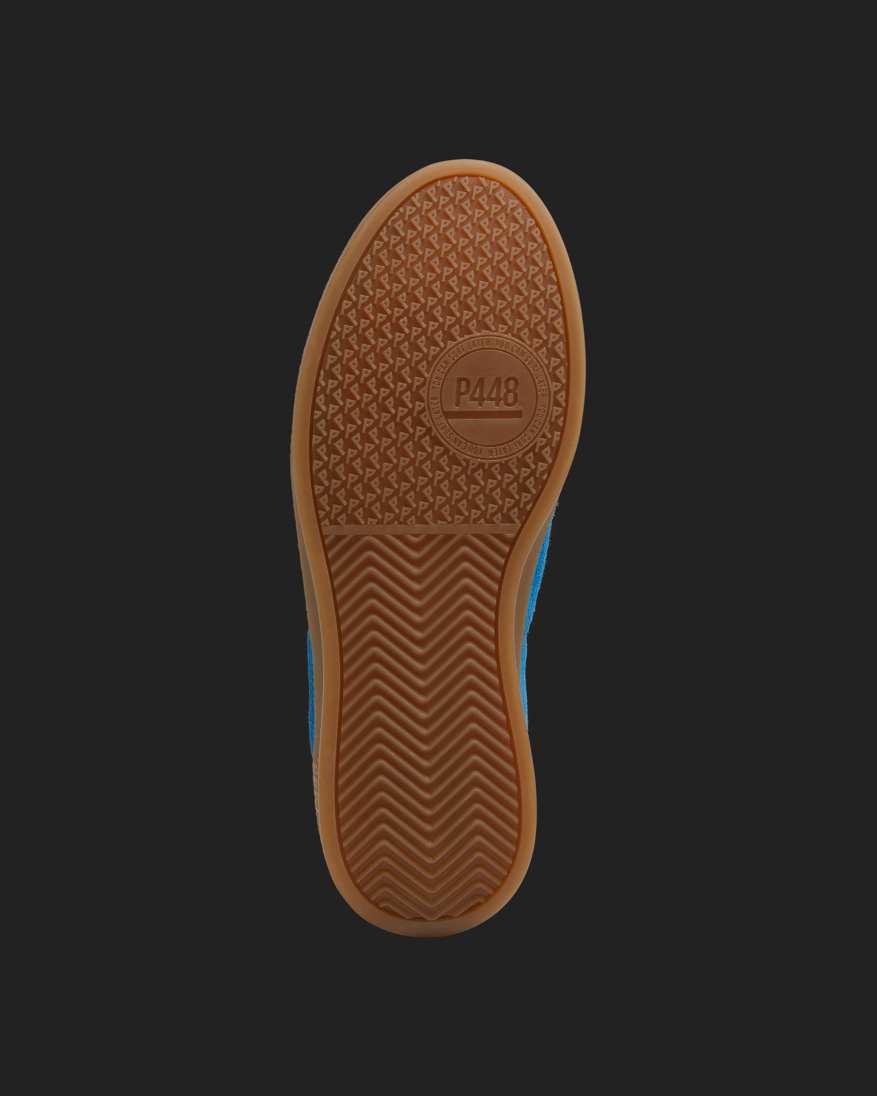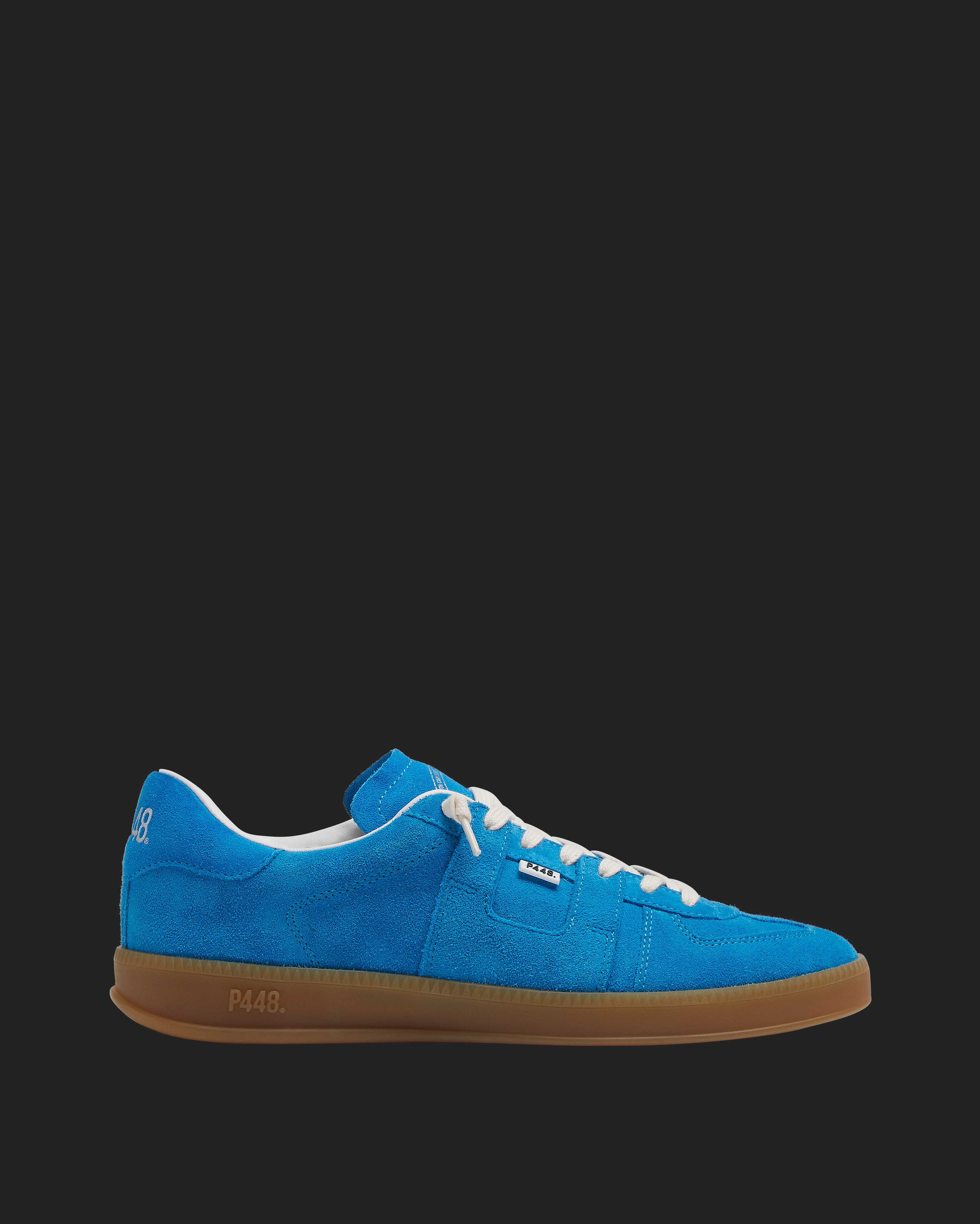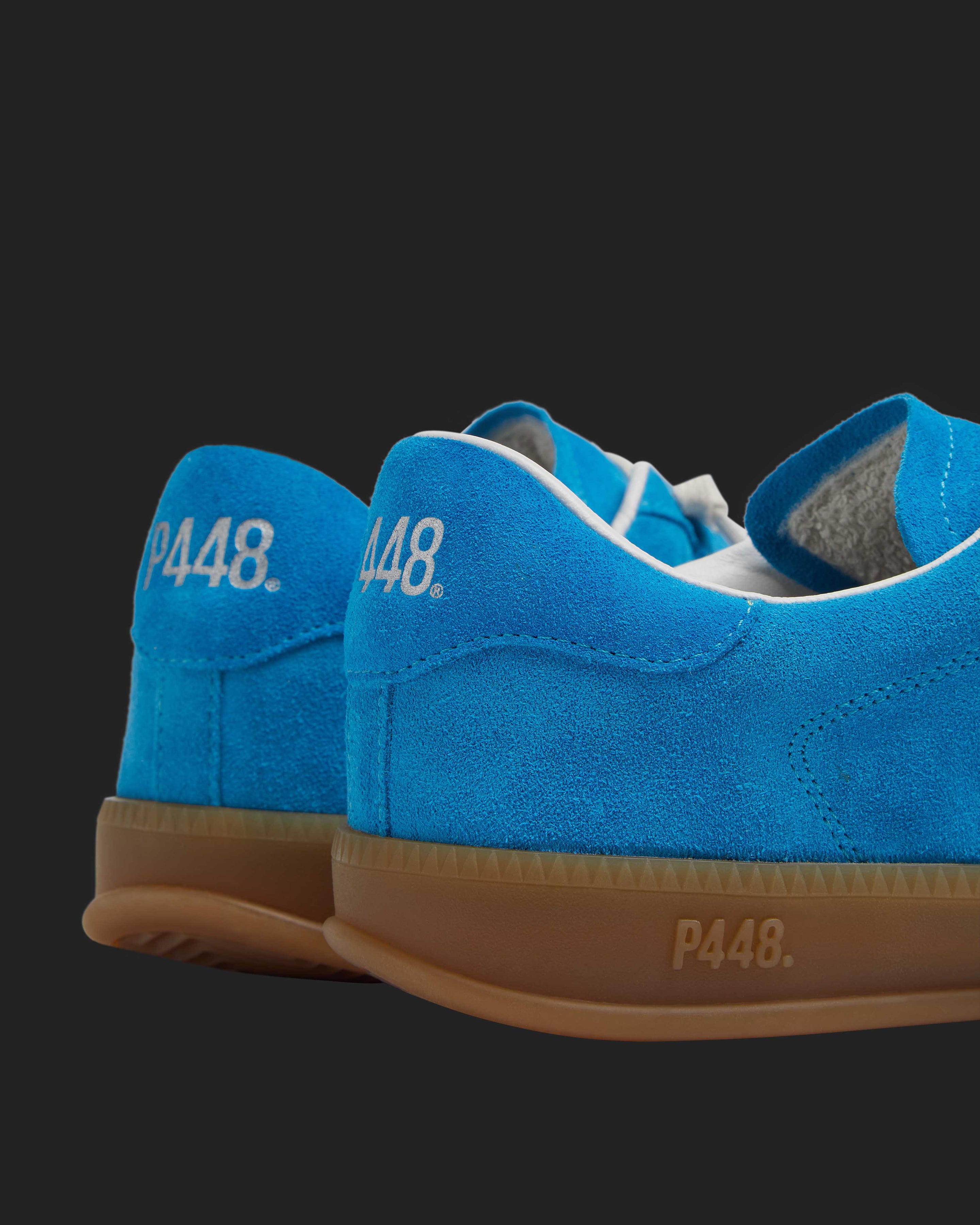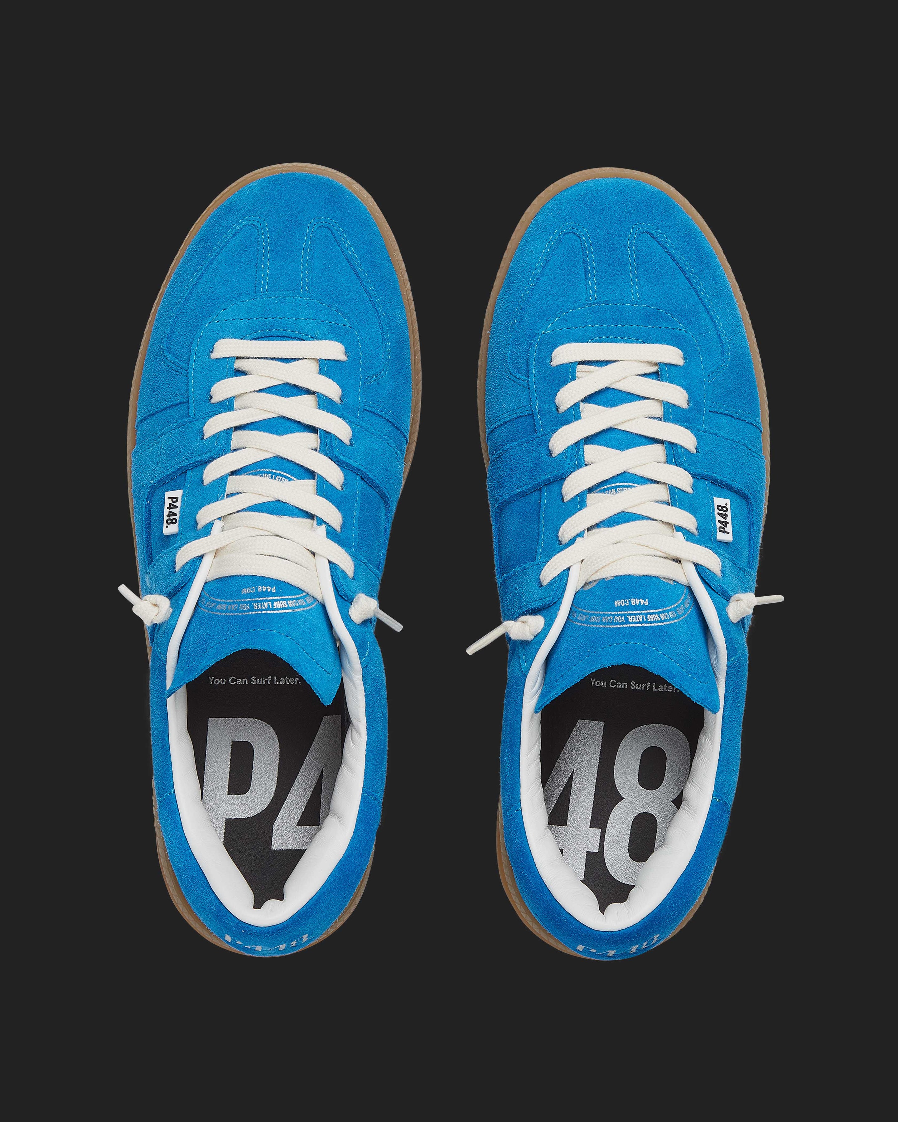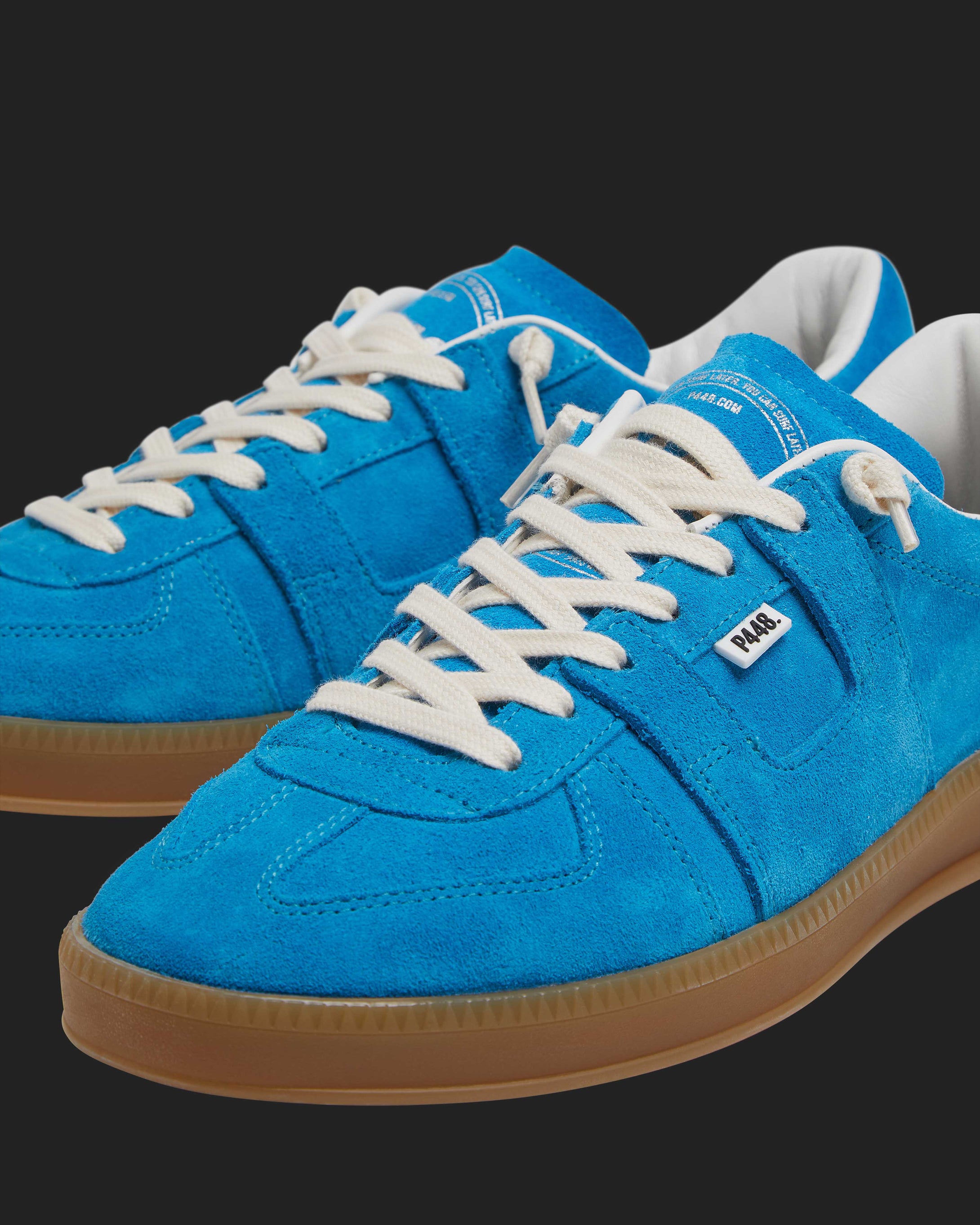 The Monza Sea features all-over electric blue suede suede finished with our signature P448 amber gum soles. Off-white cotton laces finish off the look.