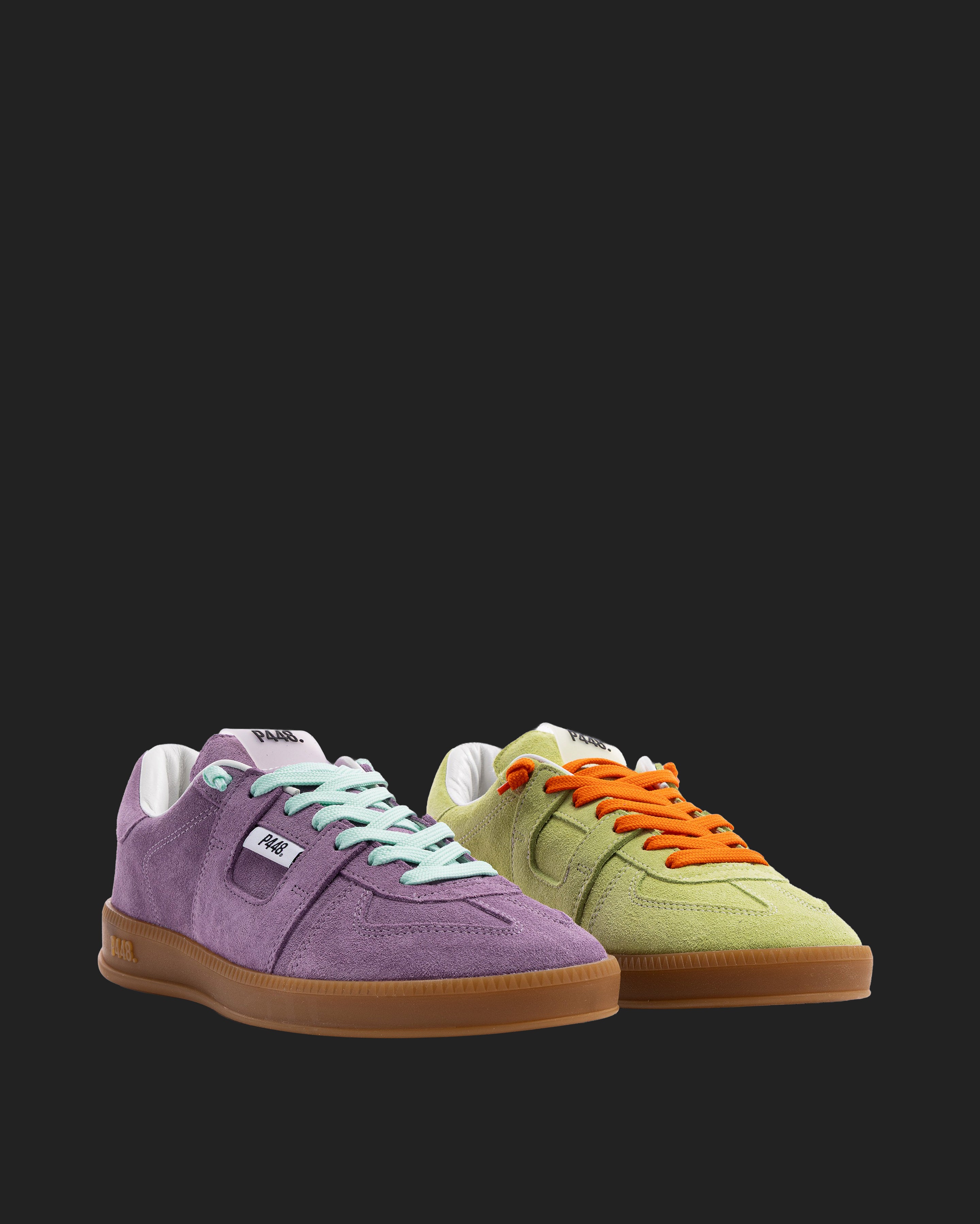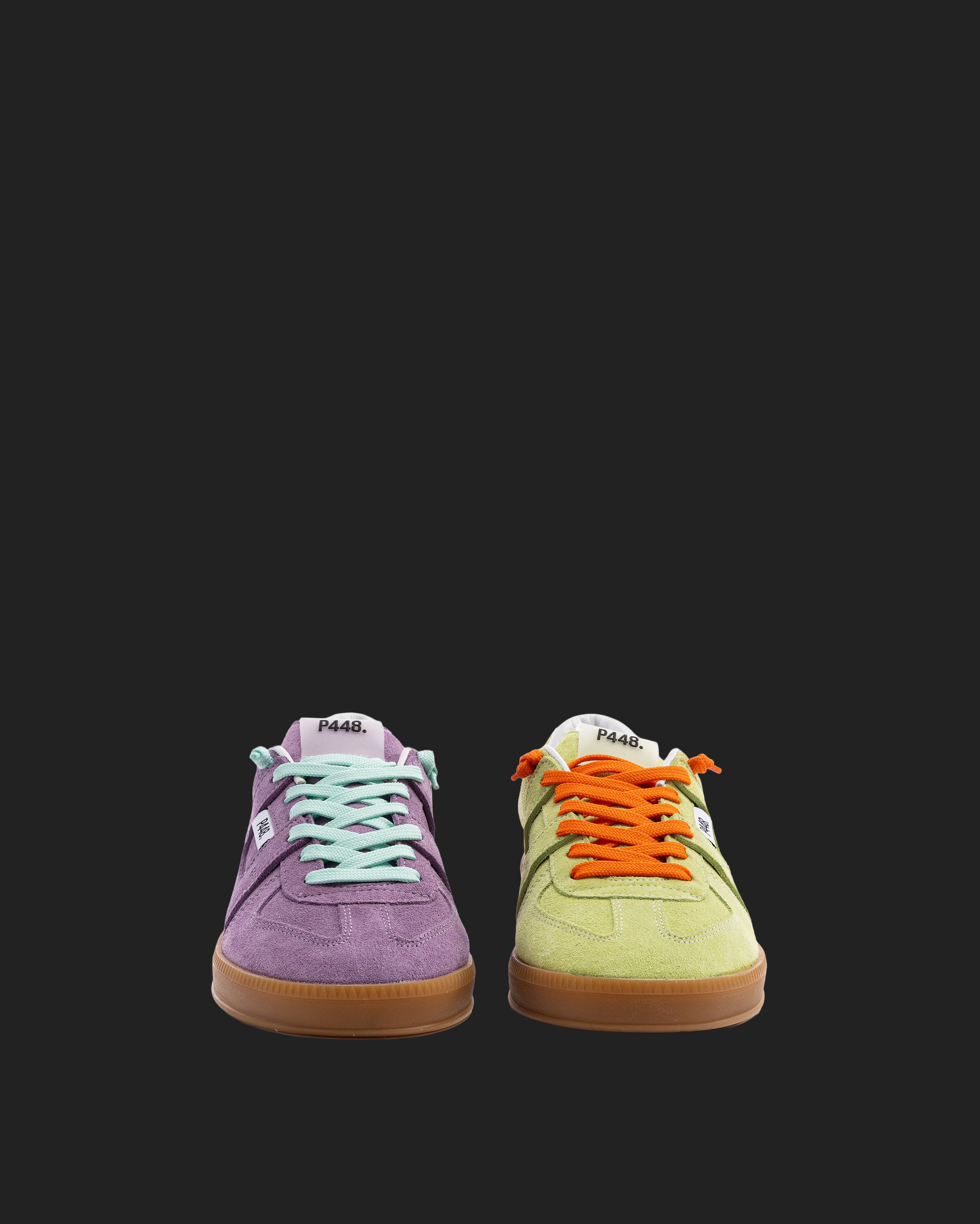 Both feature matching suede tongues, trims, toes, and heel accents. Light blue laces on one and orange laces on the other, along with our signature P448 rubber soles finished with black treads, tie it all together.