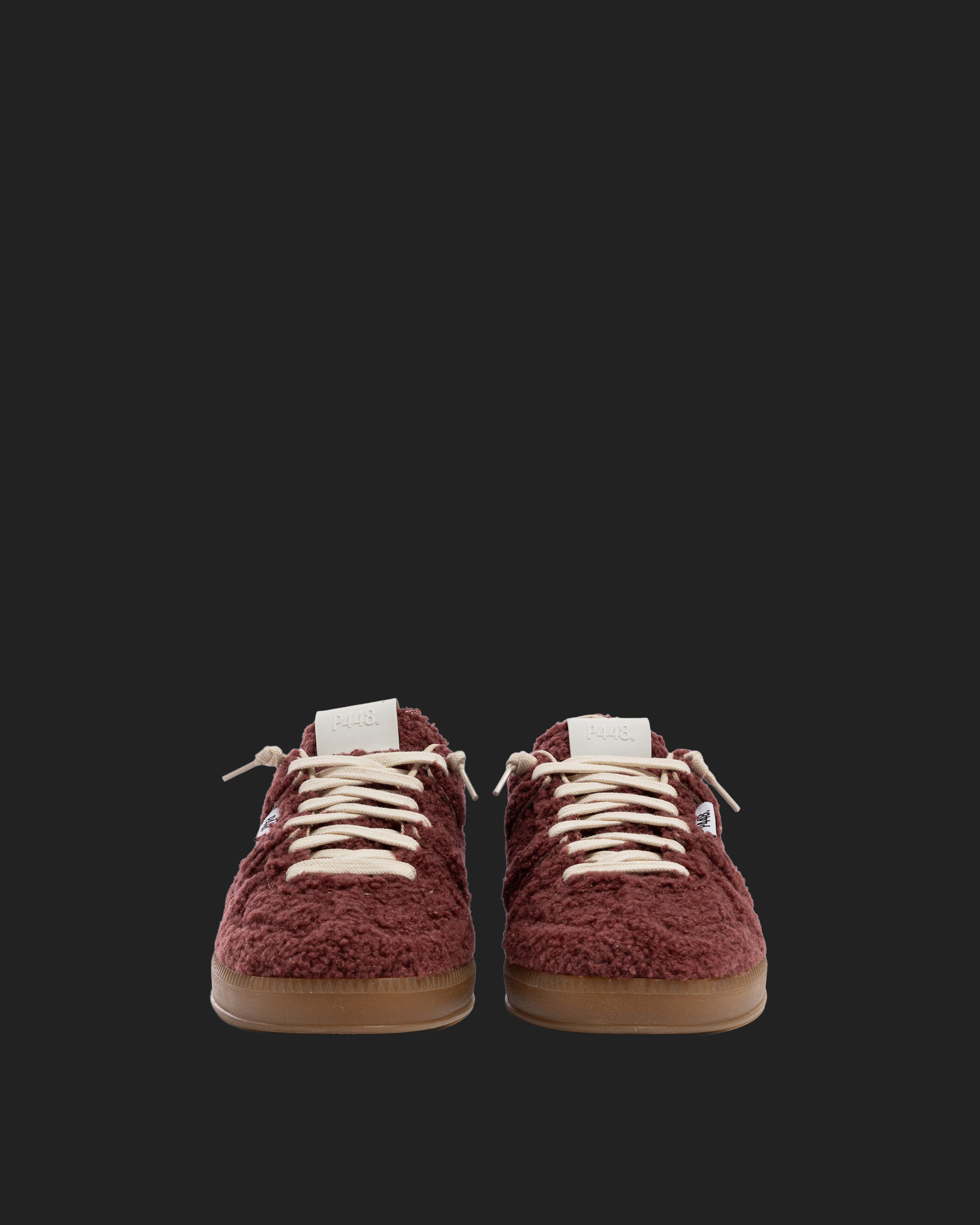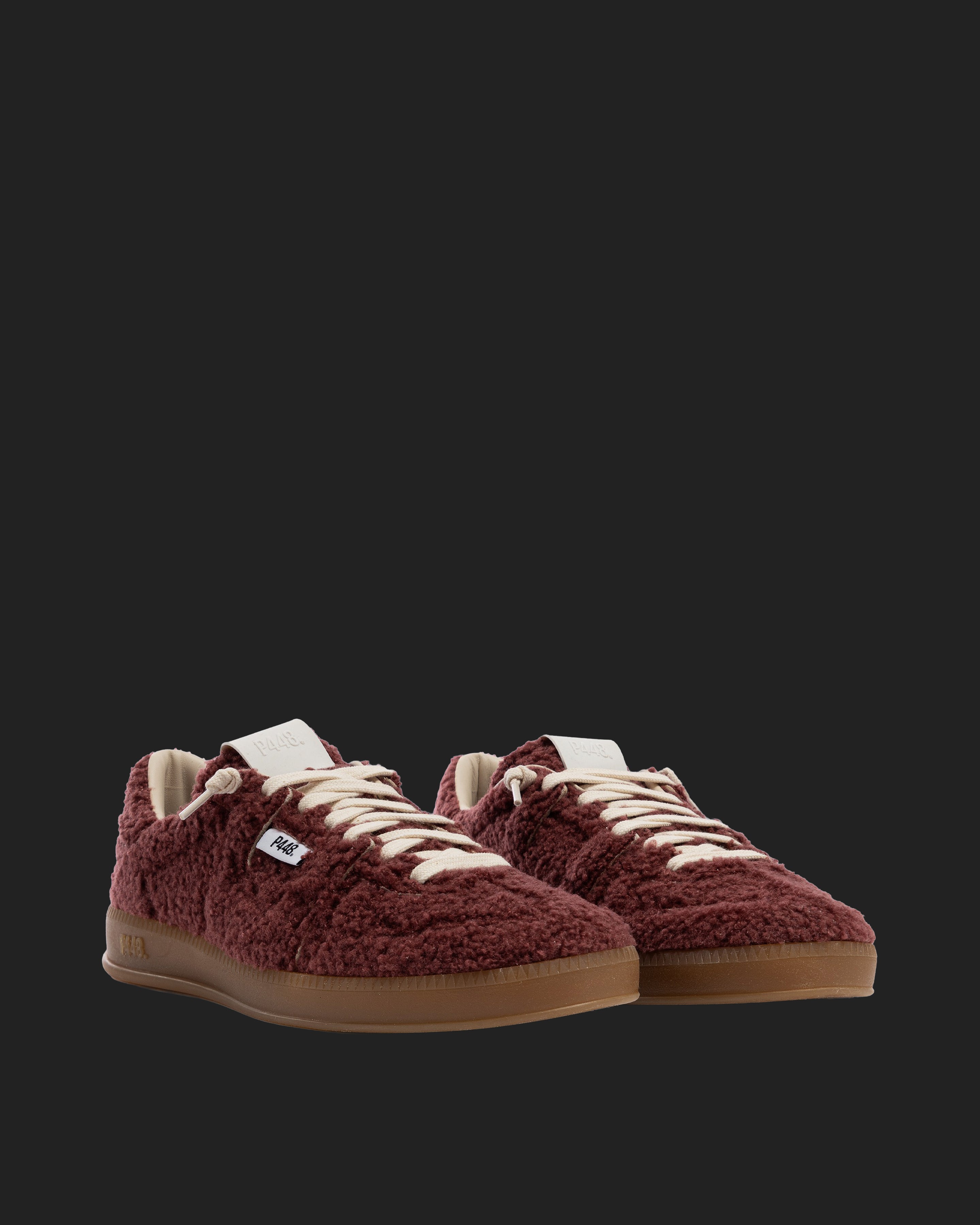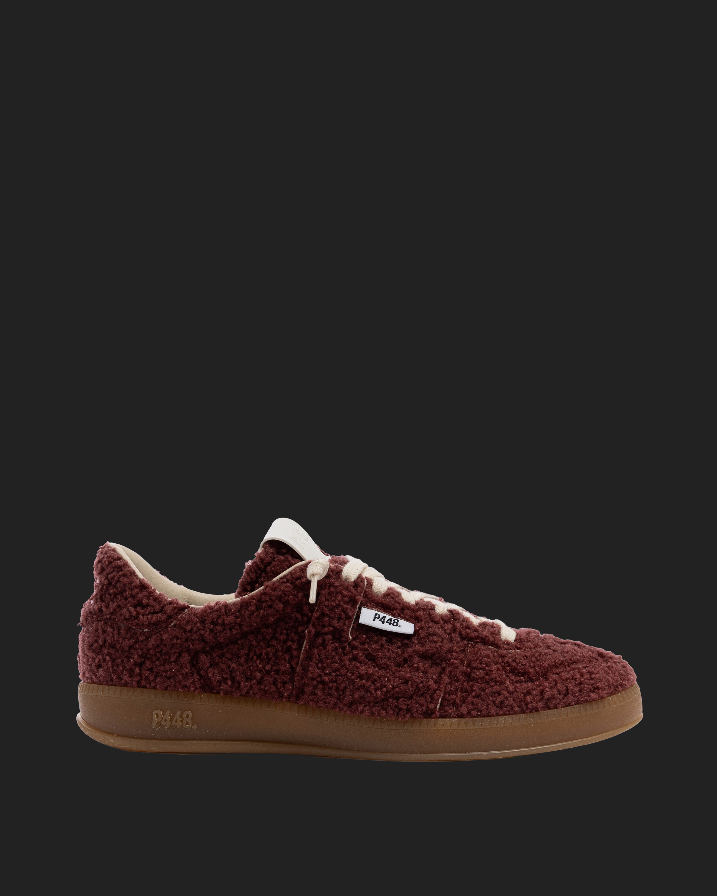 The Monza Currant features all-over soft burgundy sherpa finished with our signature P448 amber gum soles and treads. White cotton laces tie the look together.