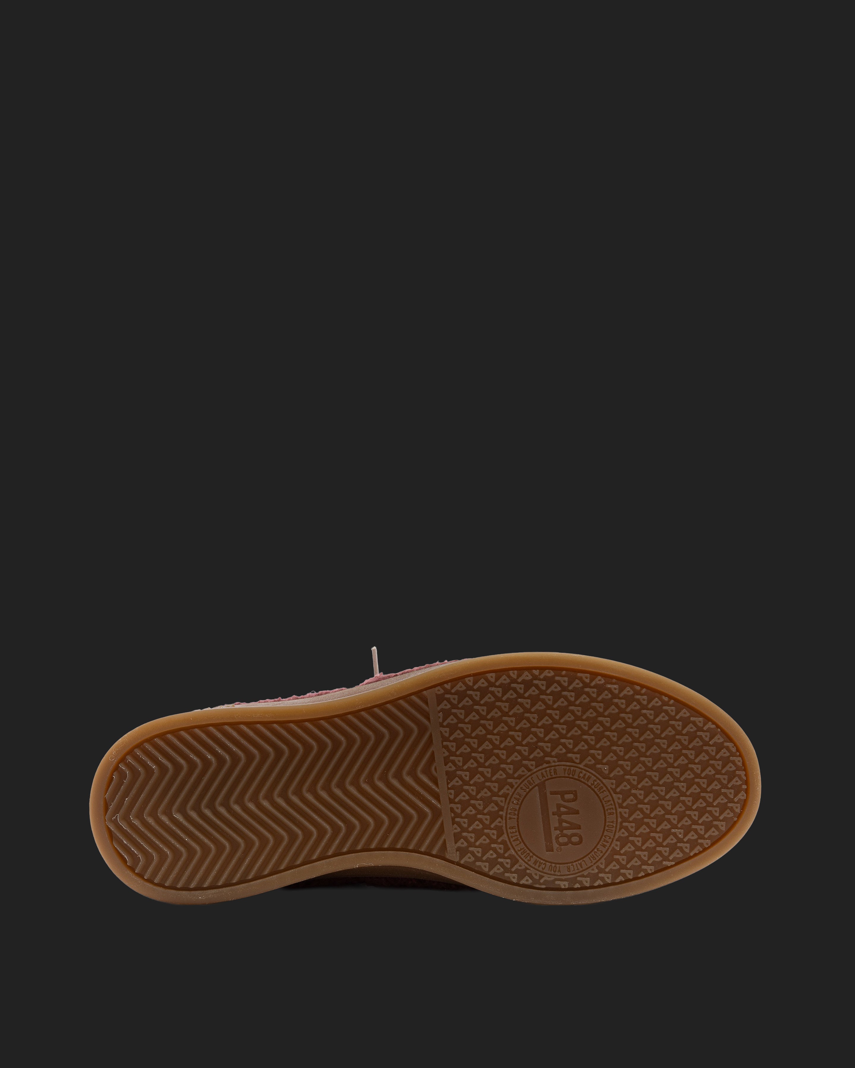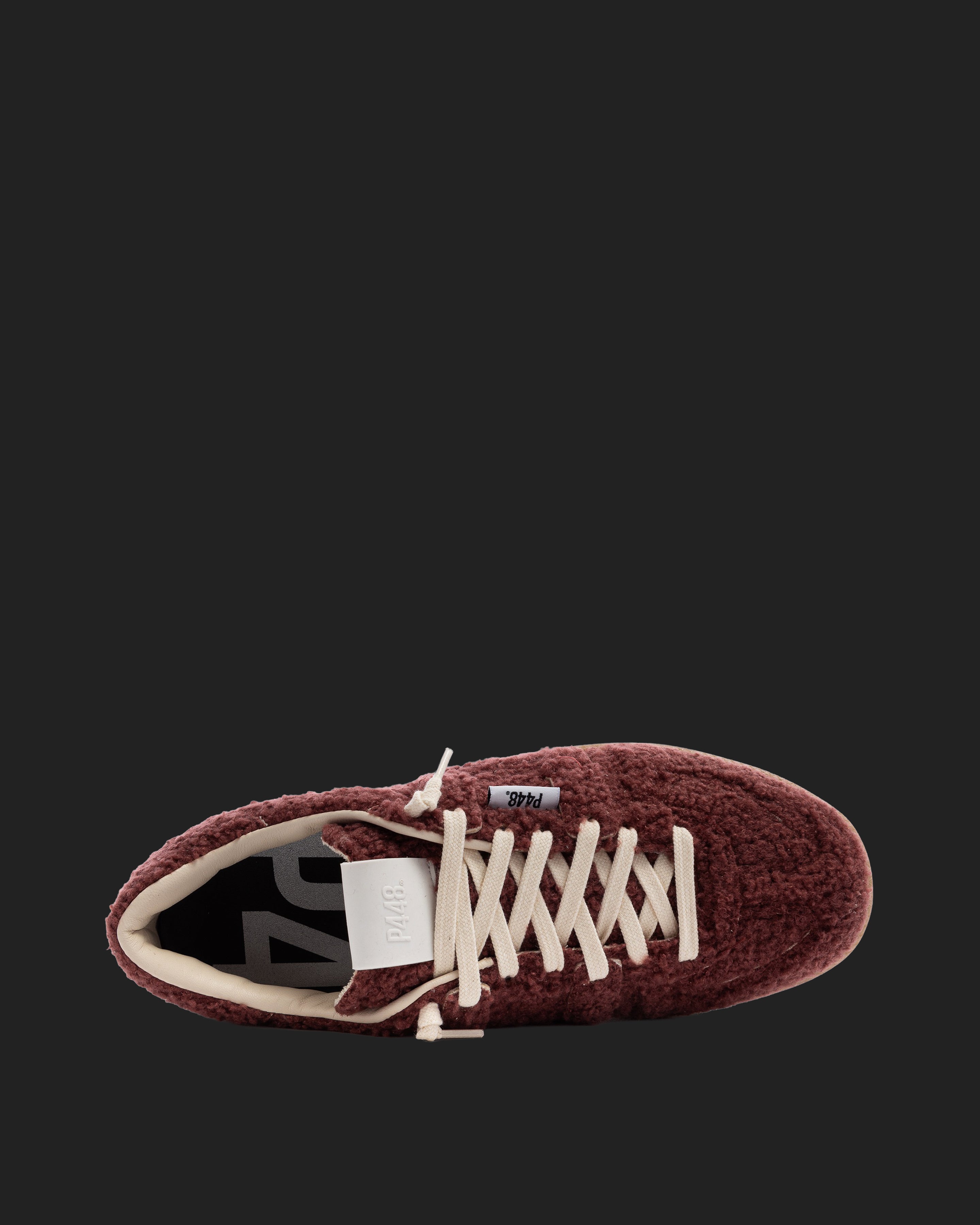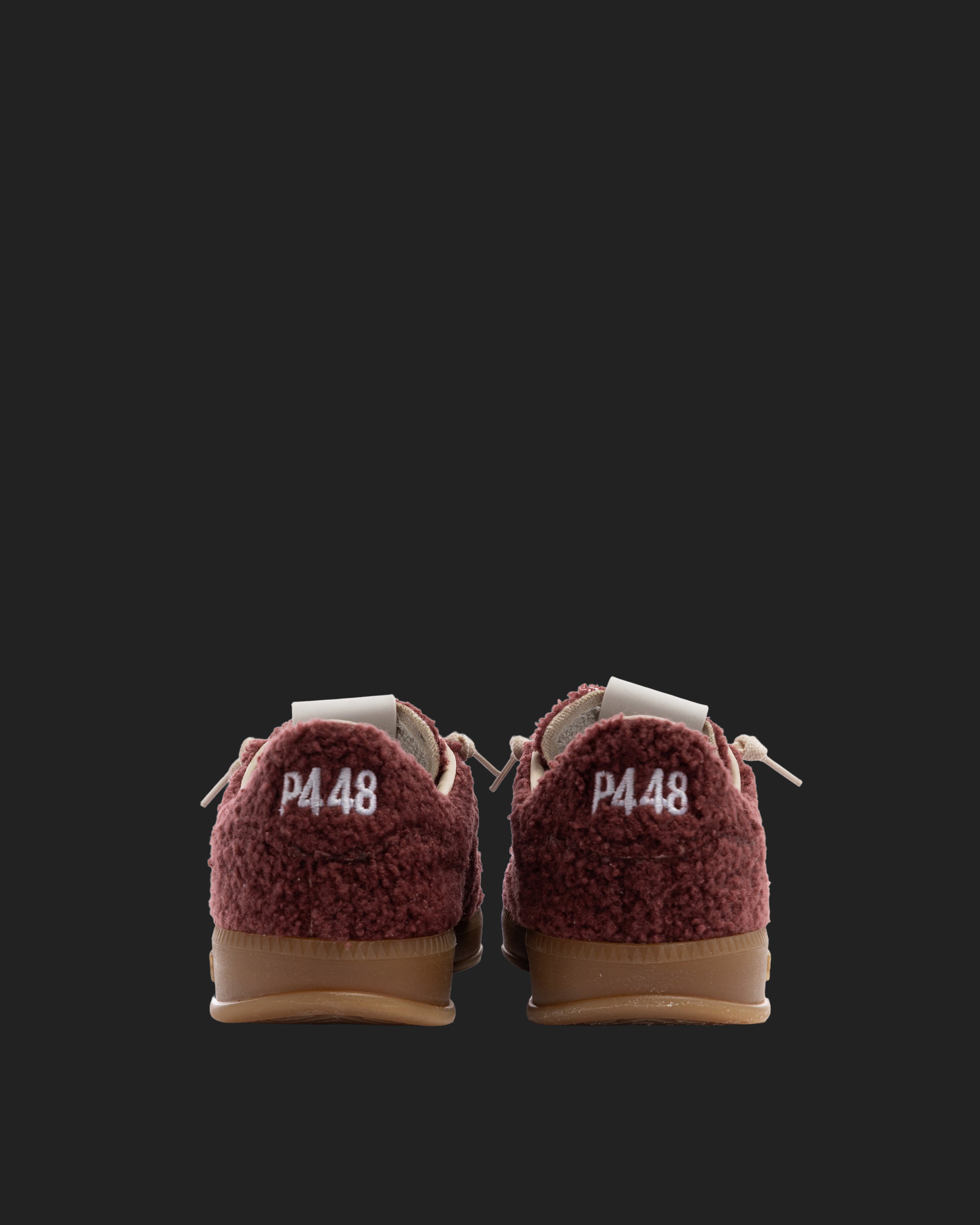 The Monza Currant features all-over soft burgundy sherpa finished with our signature P448 amber gum soles and treads. White cotton laces tie the look together.