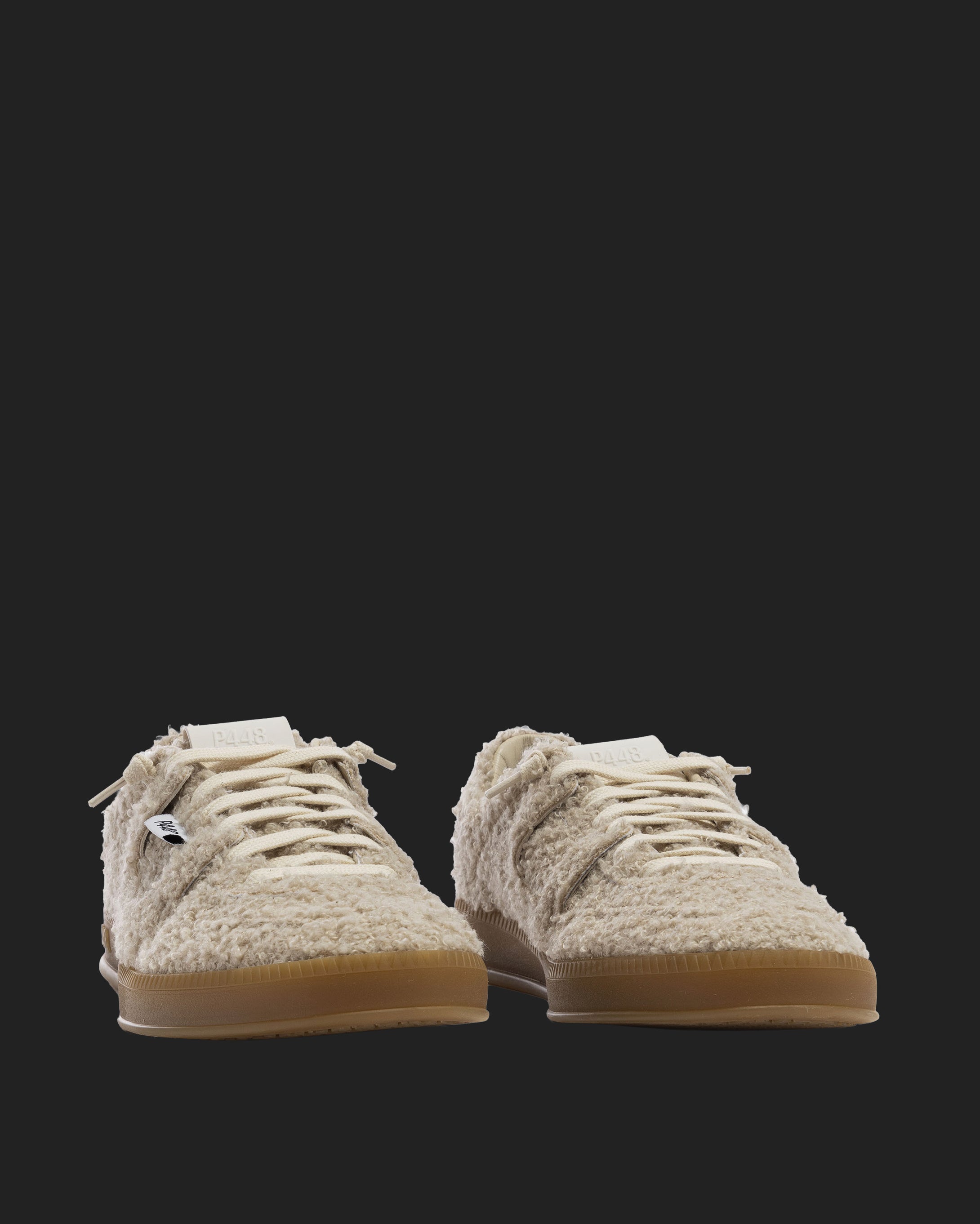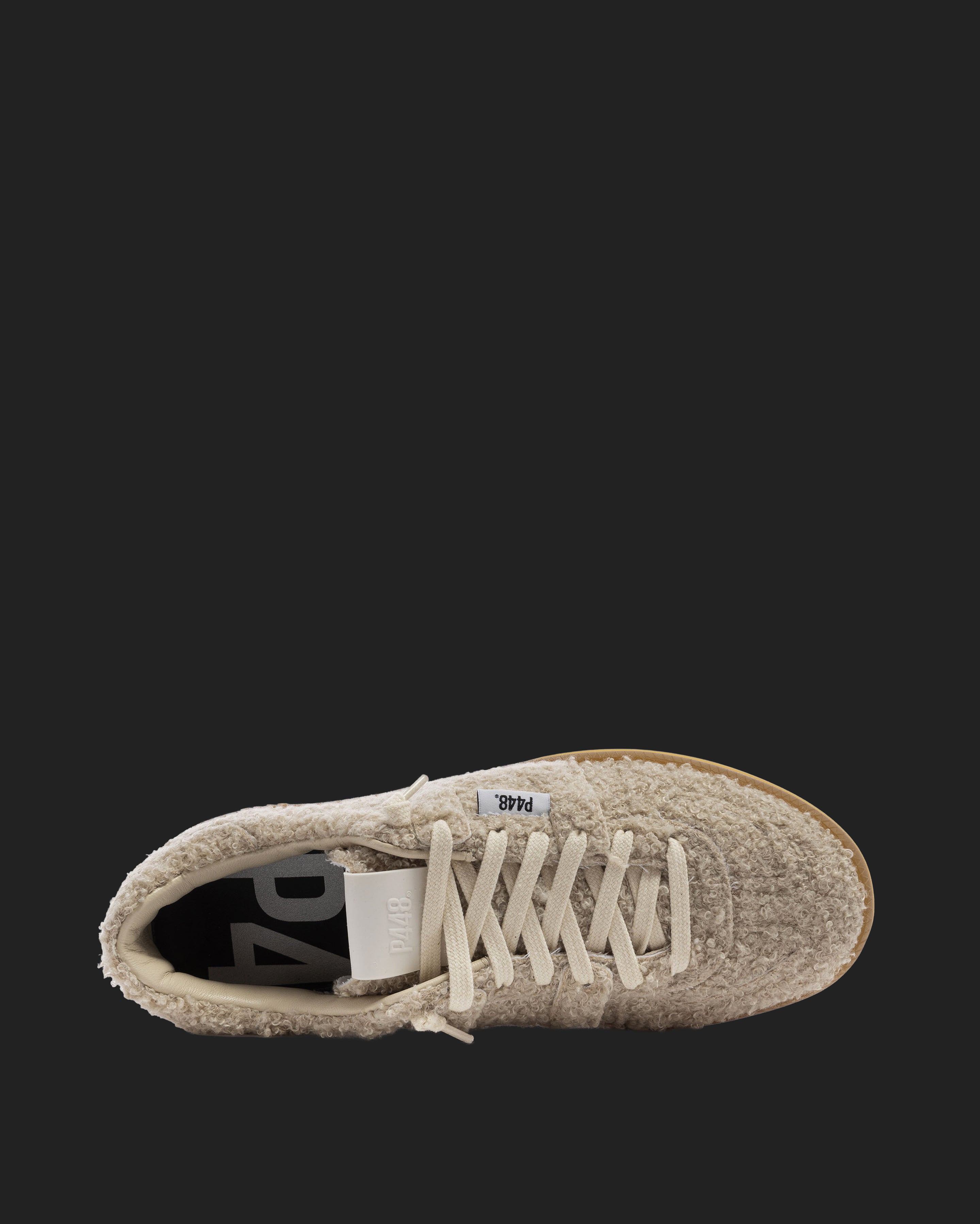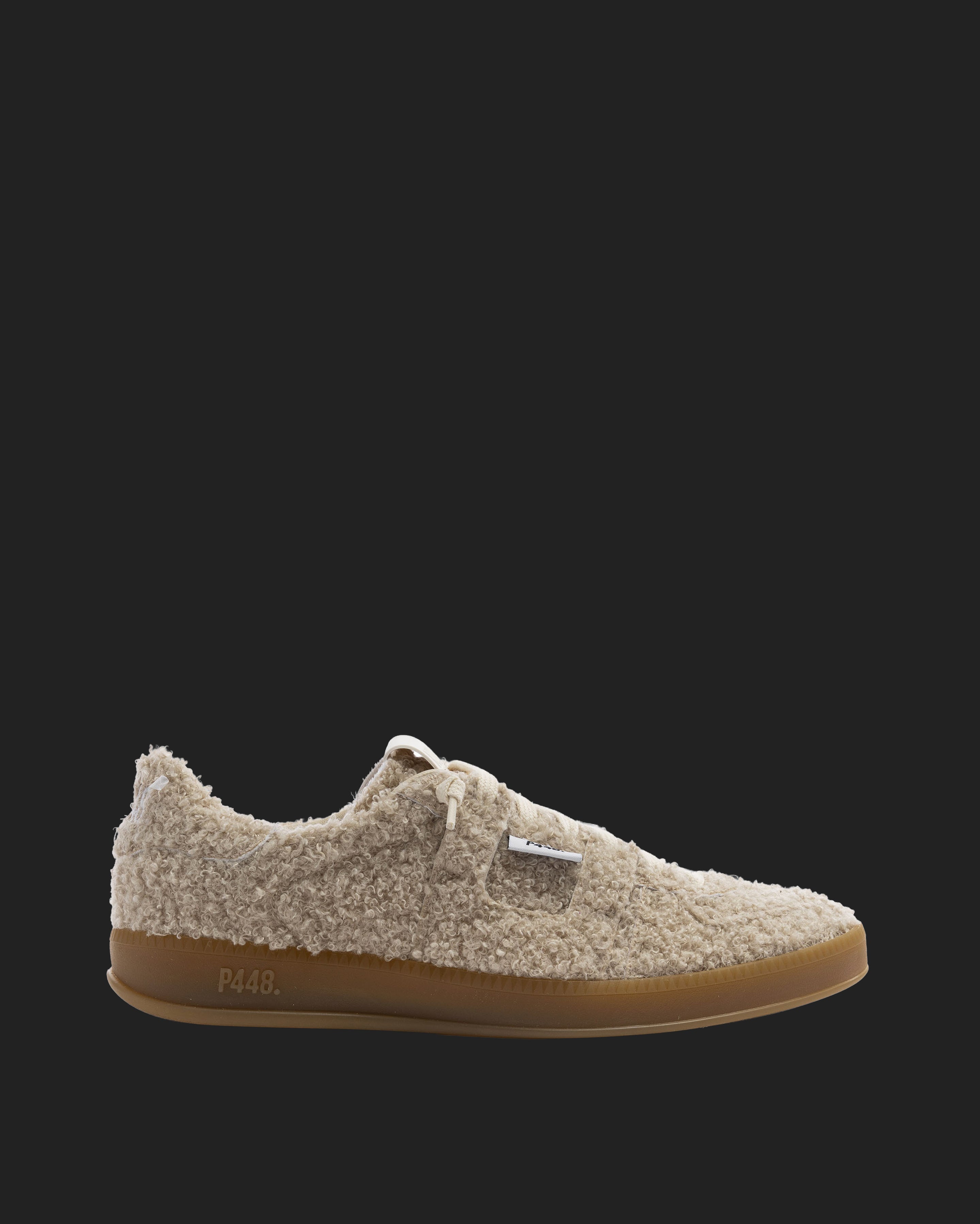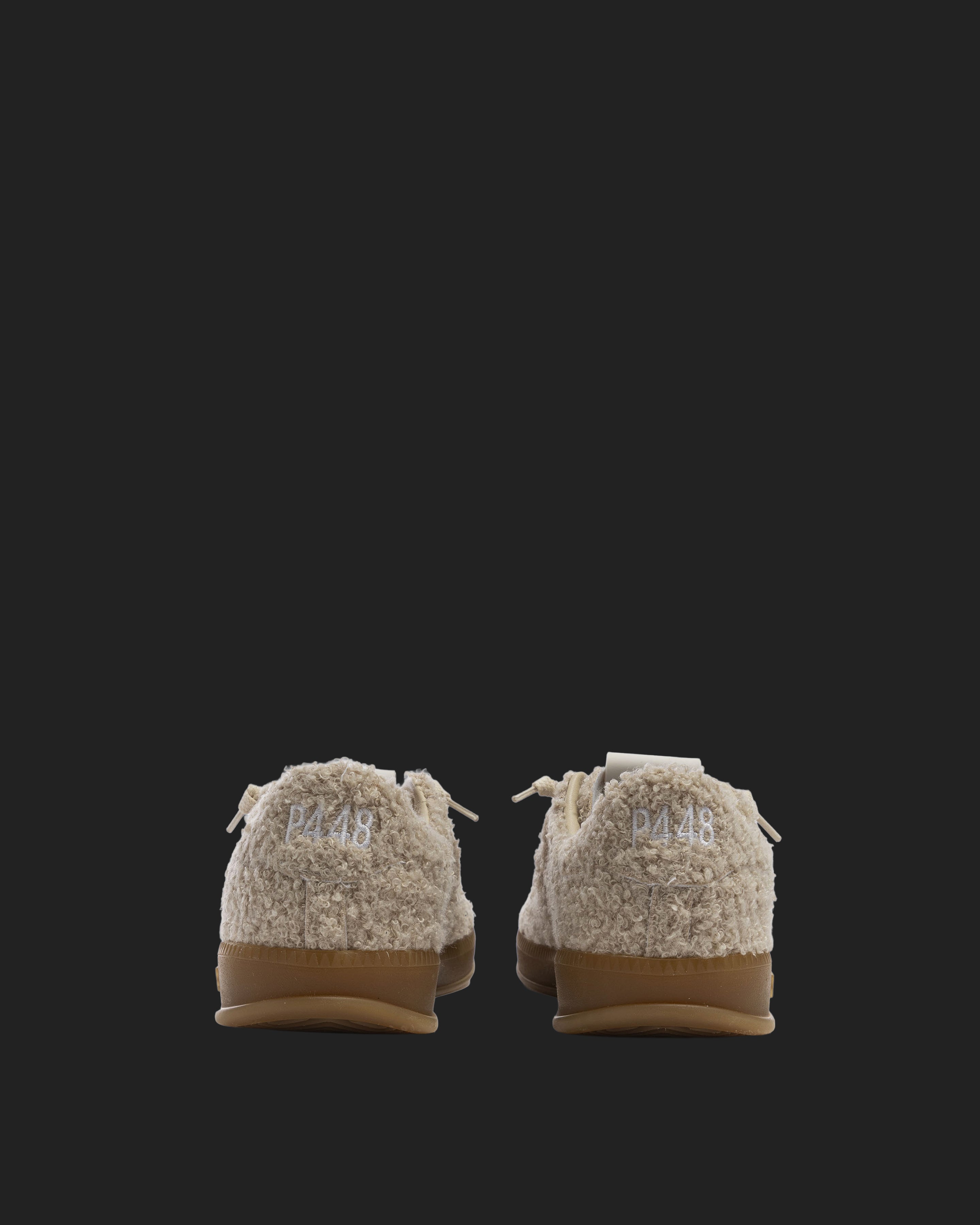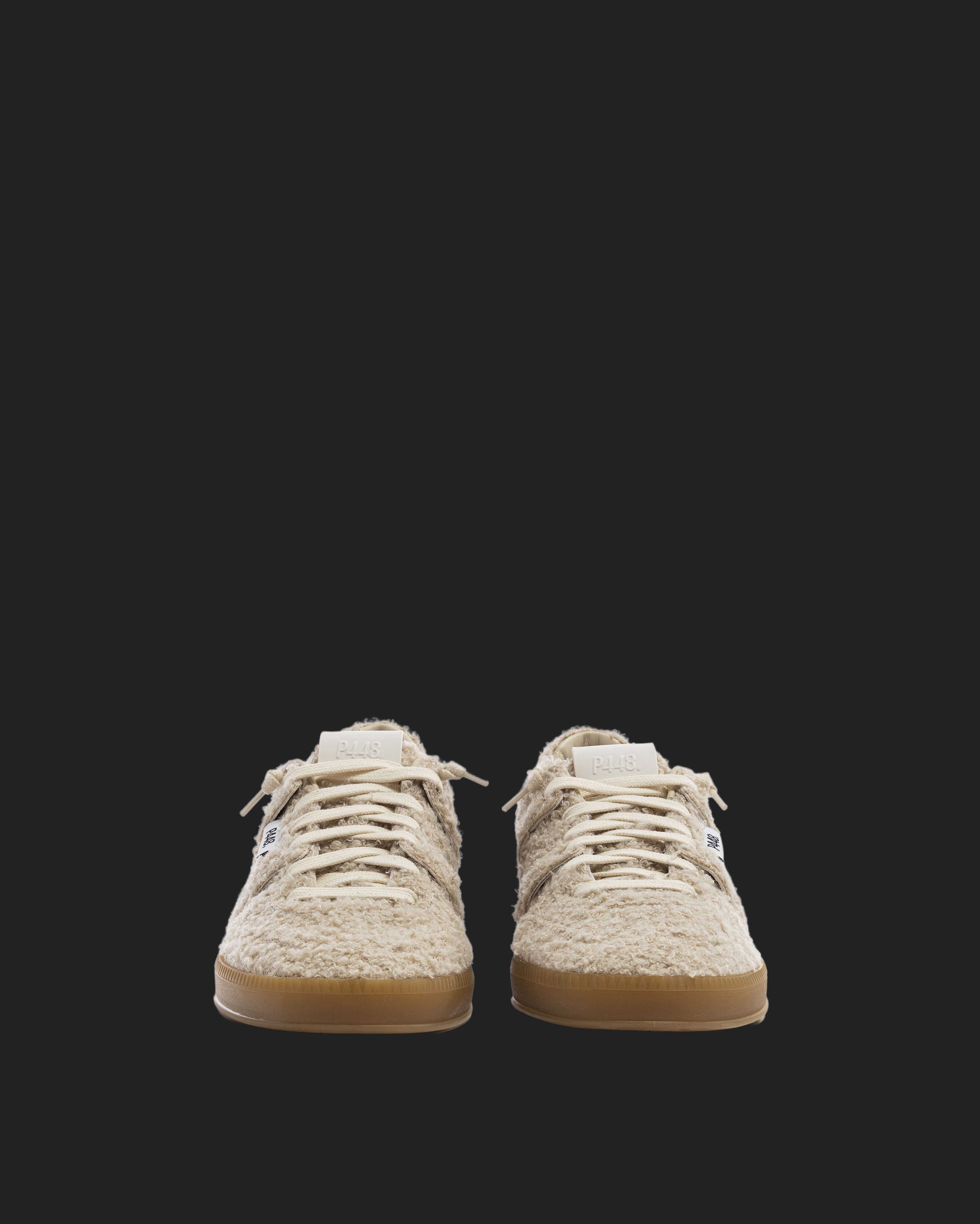 The Monza Teddy features all-over soft cream sherpa finished with our signature P448 amber gum soles and treads. White cotton laces tie the look together.