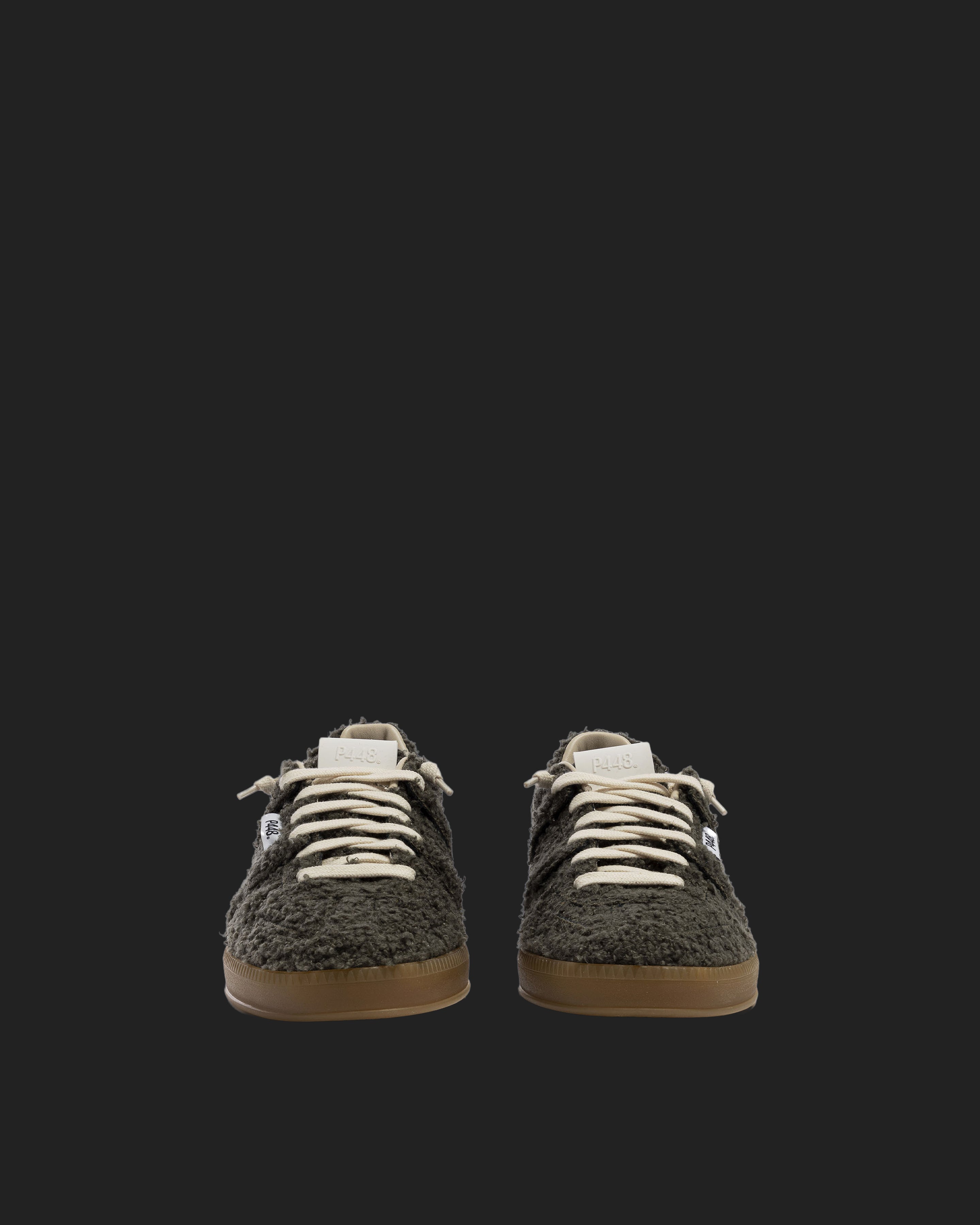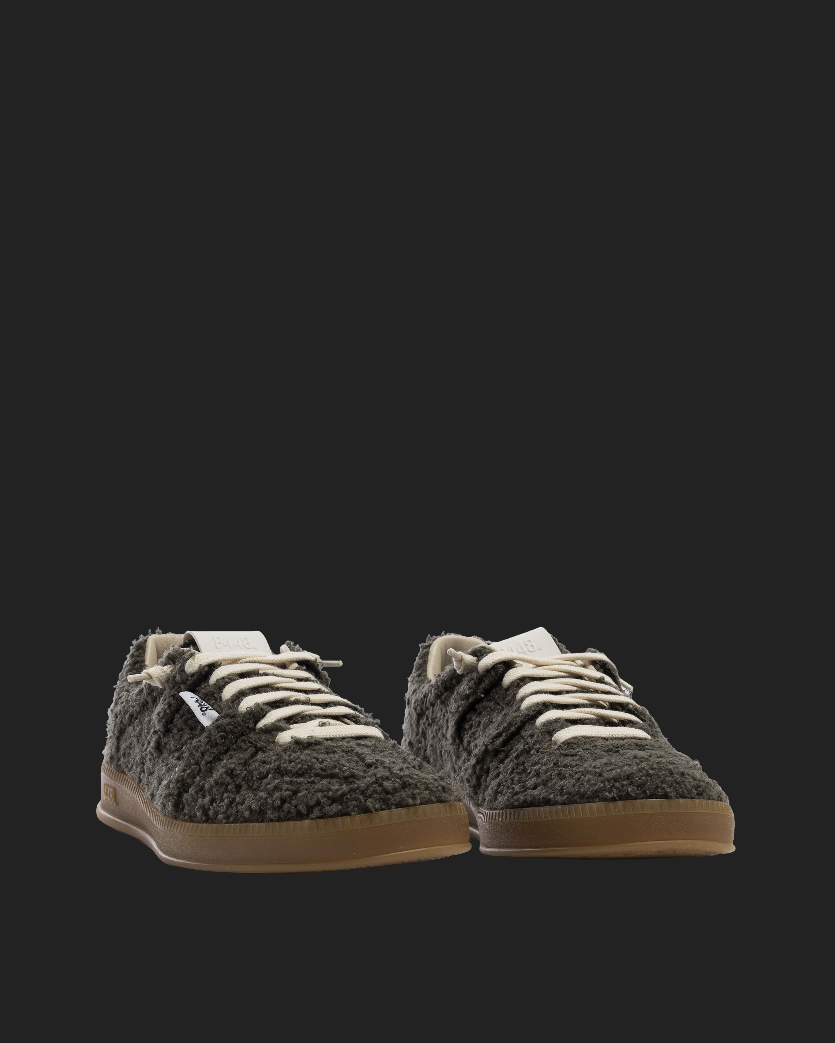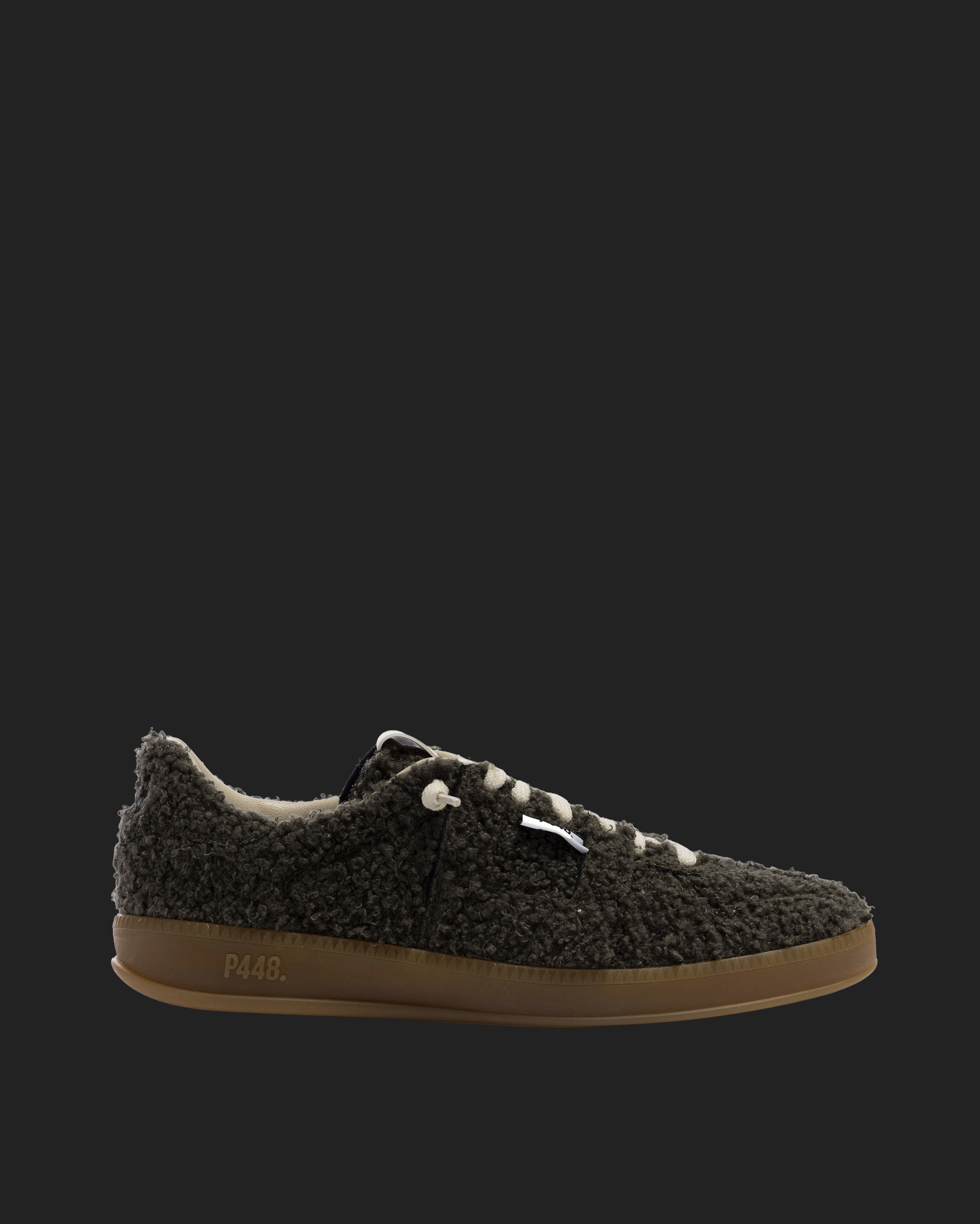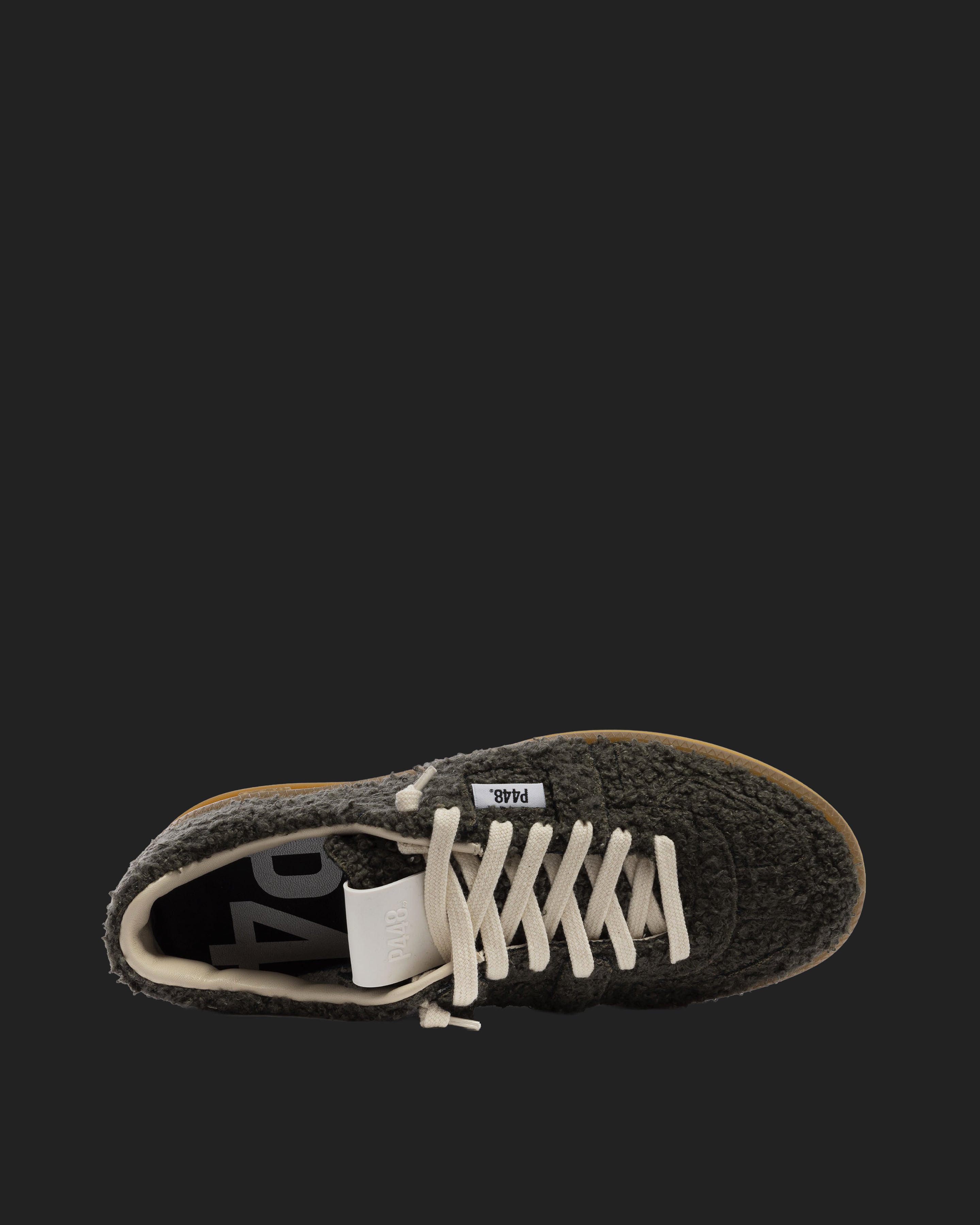 The Monza Forest features all-over soft olive green sherpa finished with our signature P448 amber gum soles and treads. White cotton laces tie the look together.