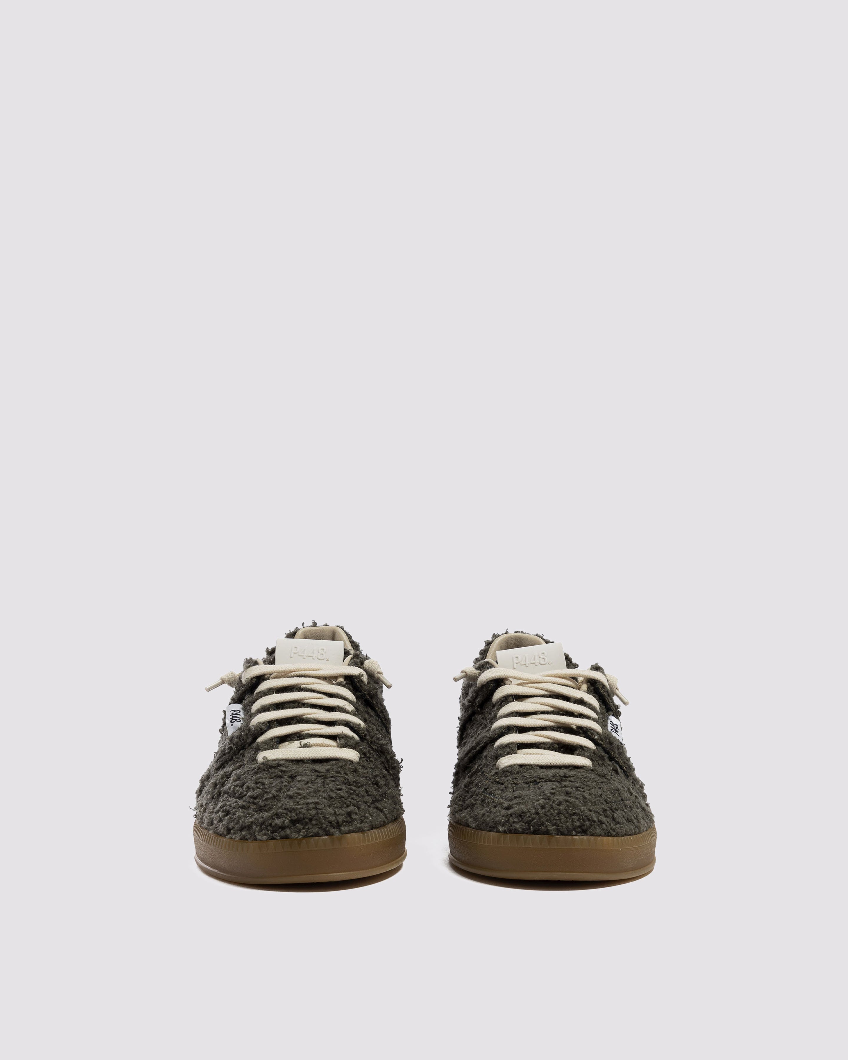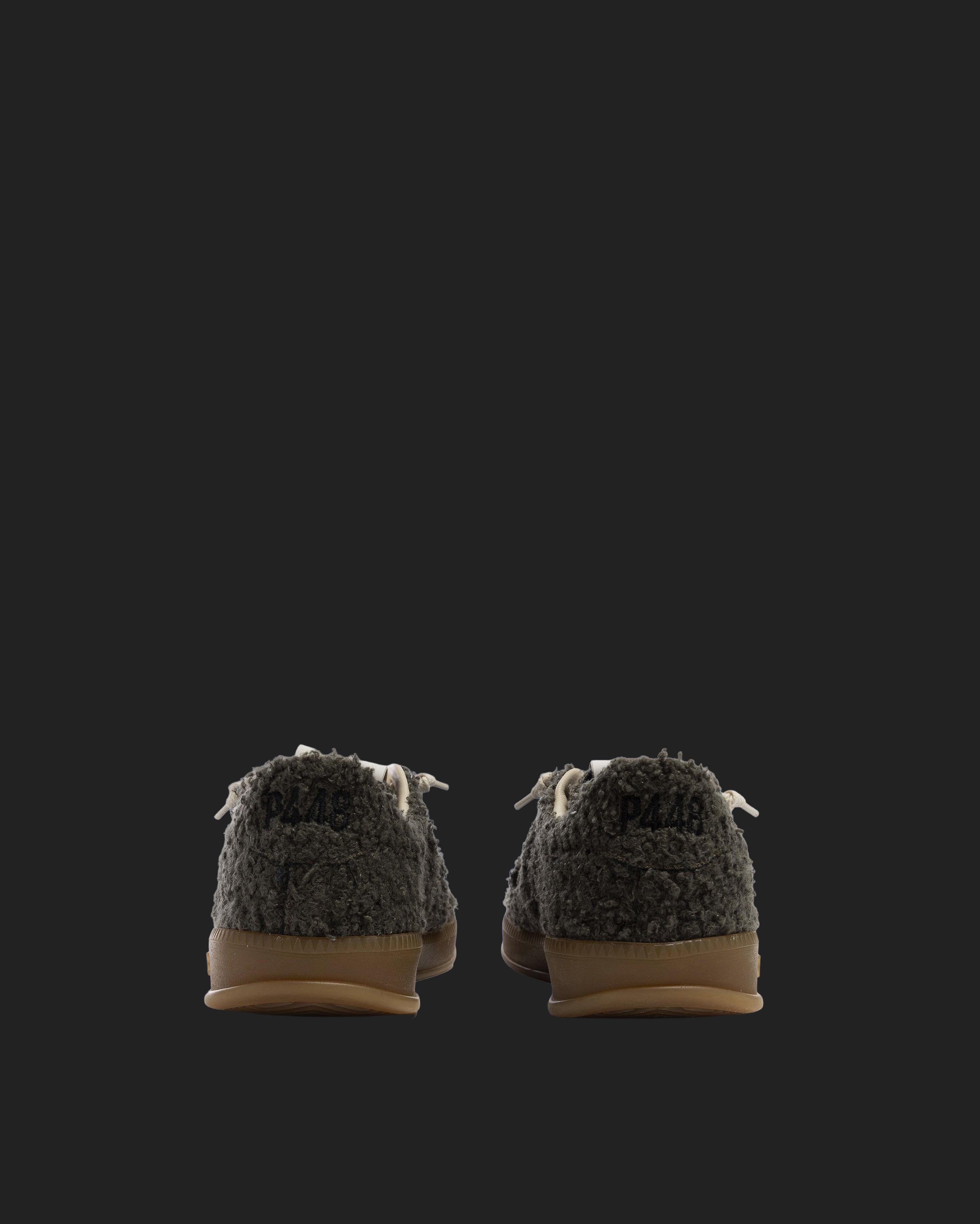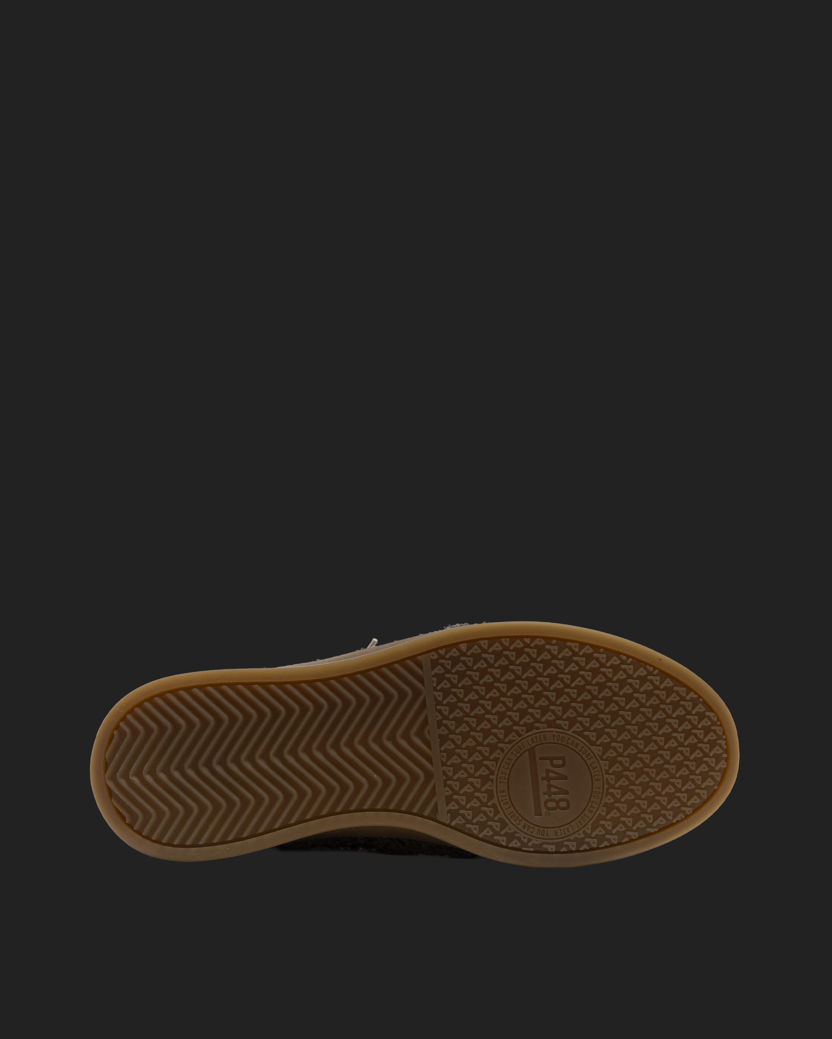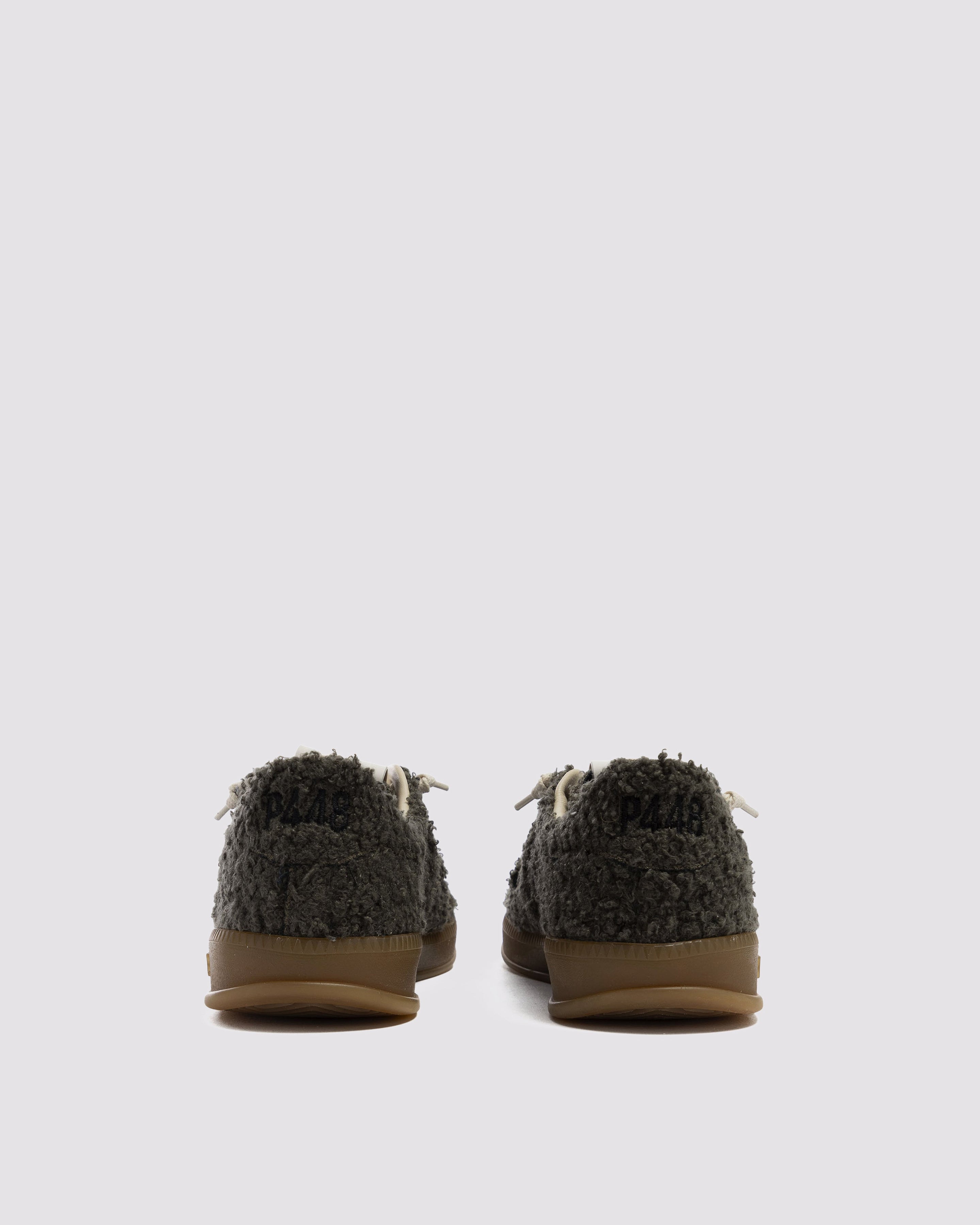 The Monza Forest features all-over soft olive green sherpa finished with our signature P448 amber gum soles and treads. White cotton laces tie the look together.