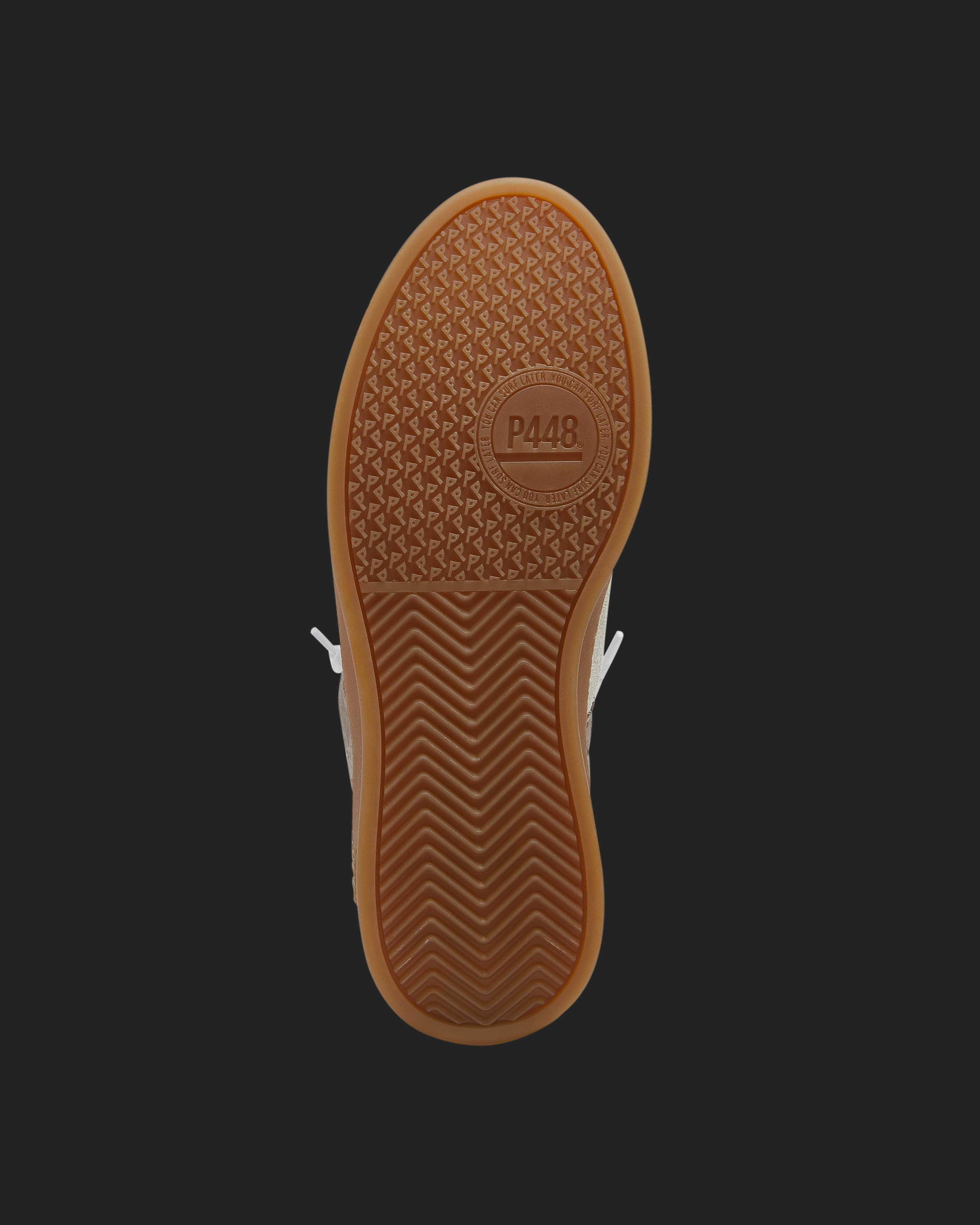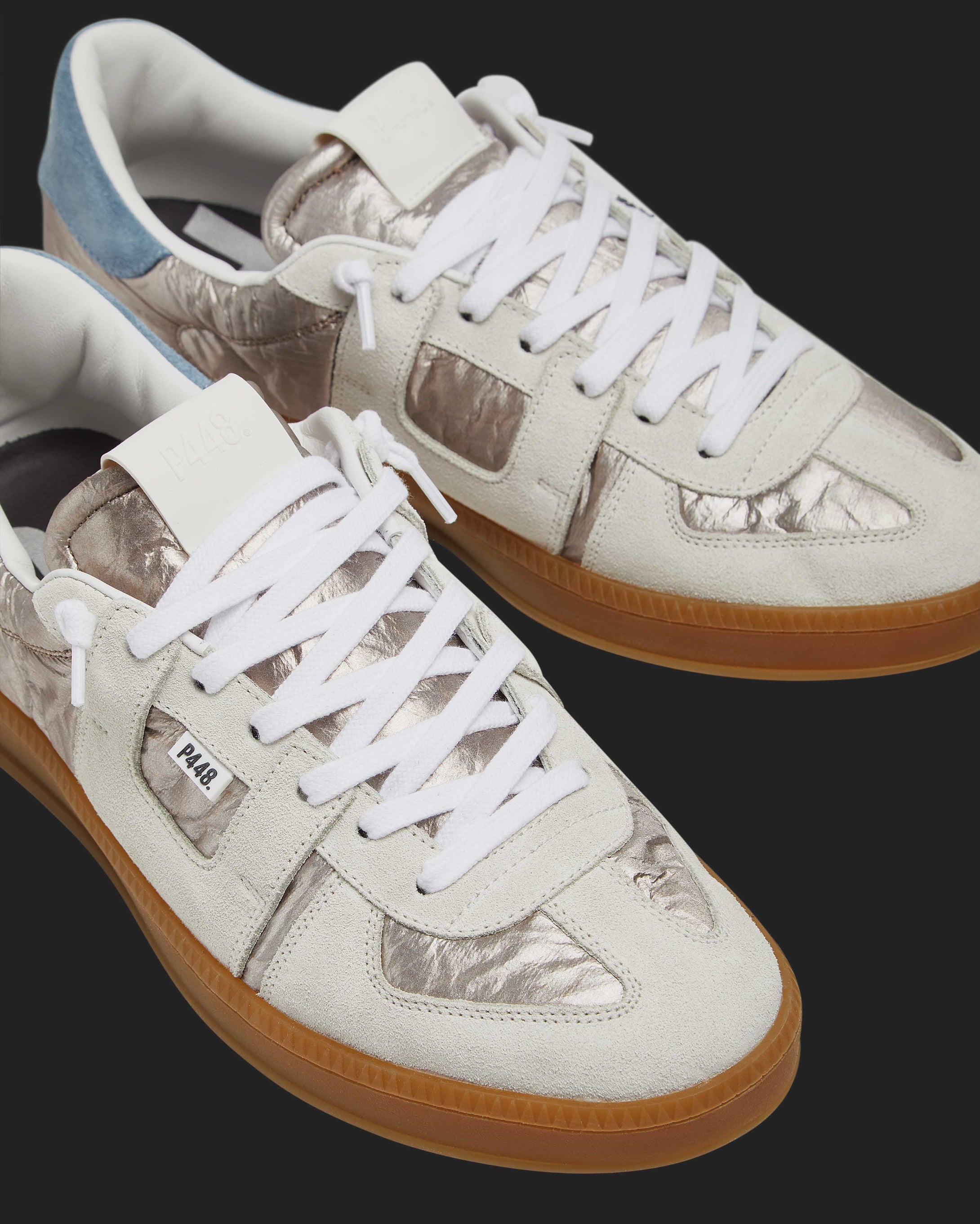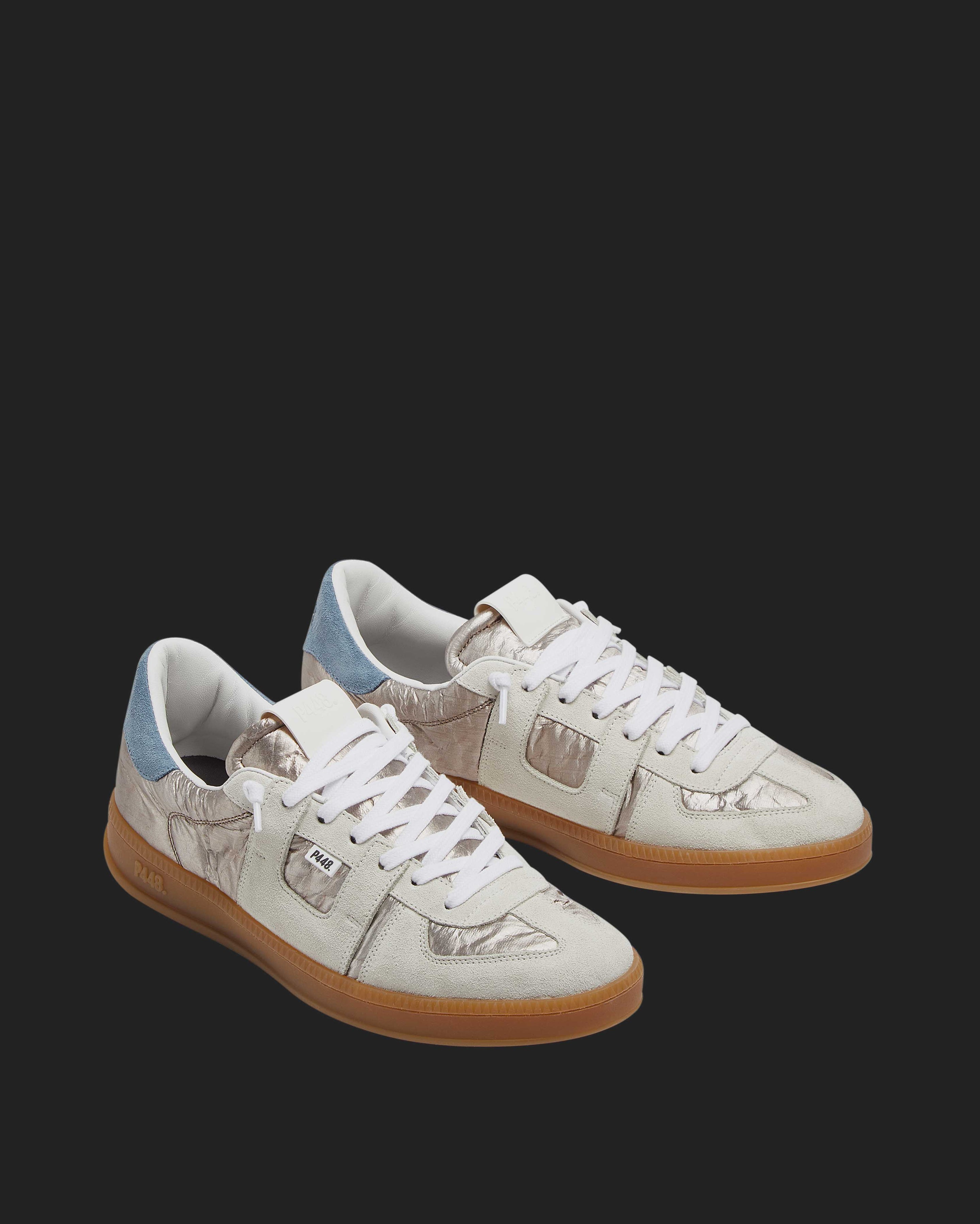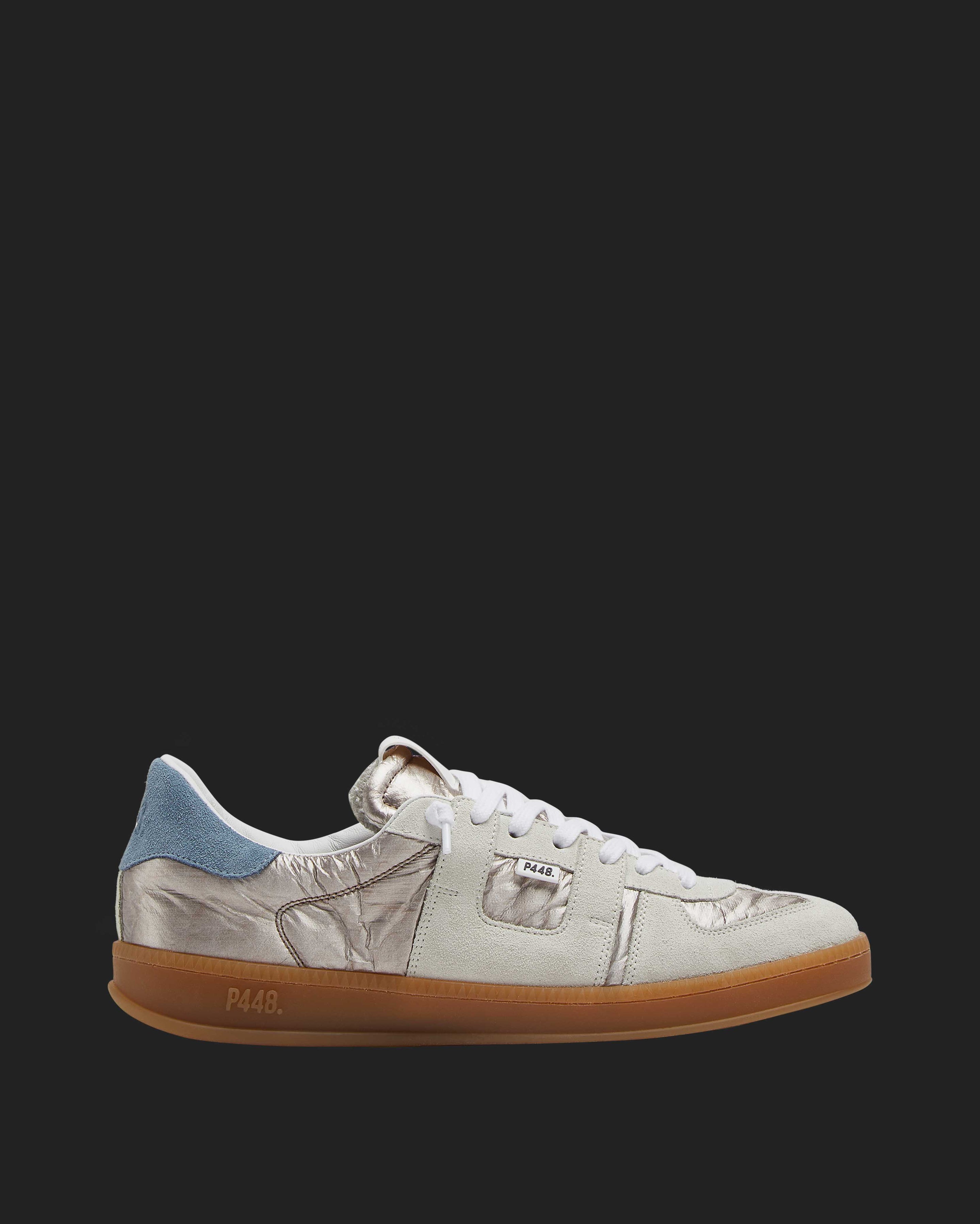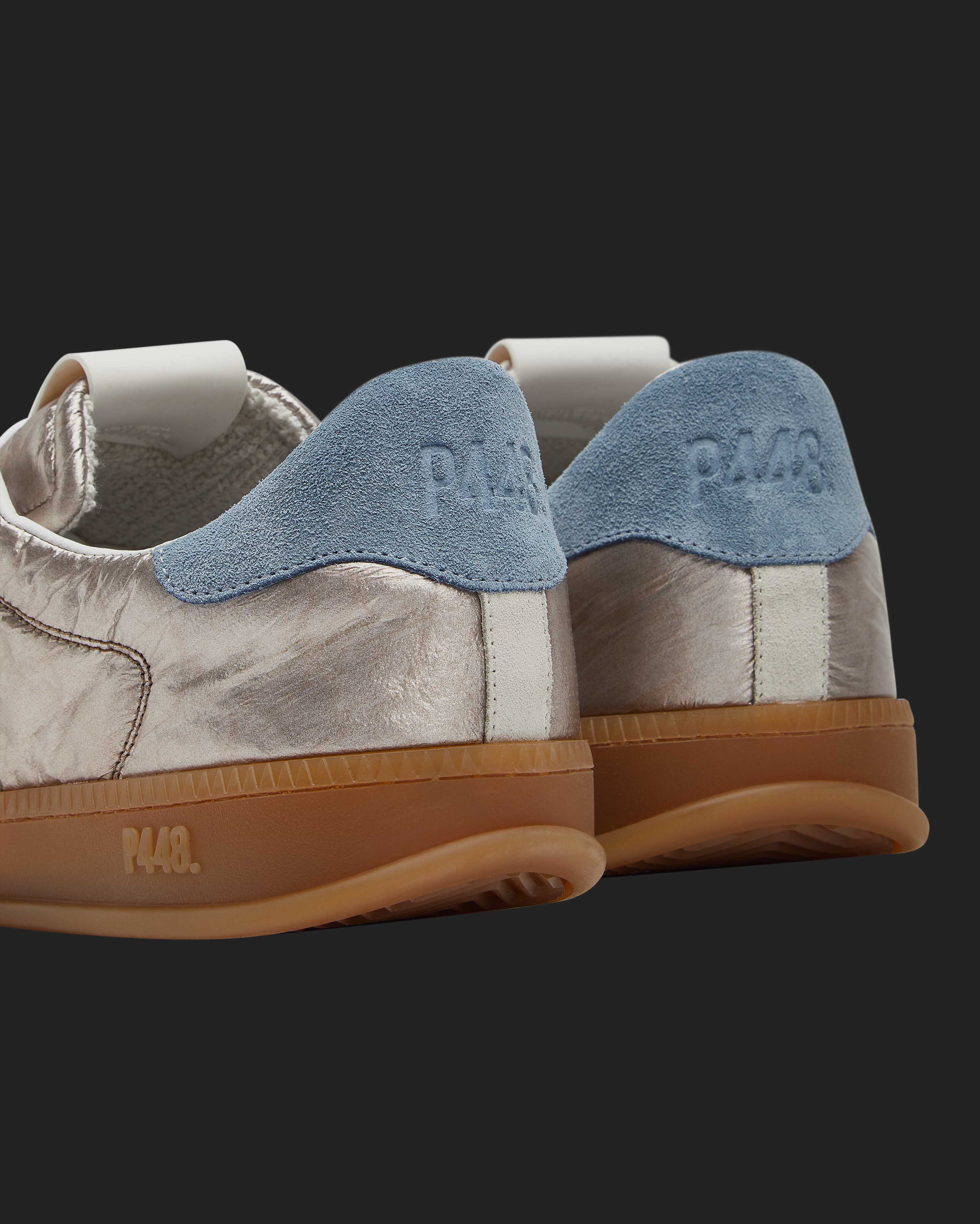 The Monza Galaxy/Grey features all-over silver padded nylon with cream suede trims, all accented by a steel blue suede heel tab. White cotton laces and our signature P448 amber gum soles finish off the look.