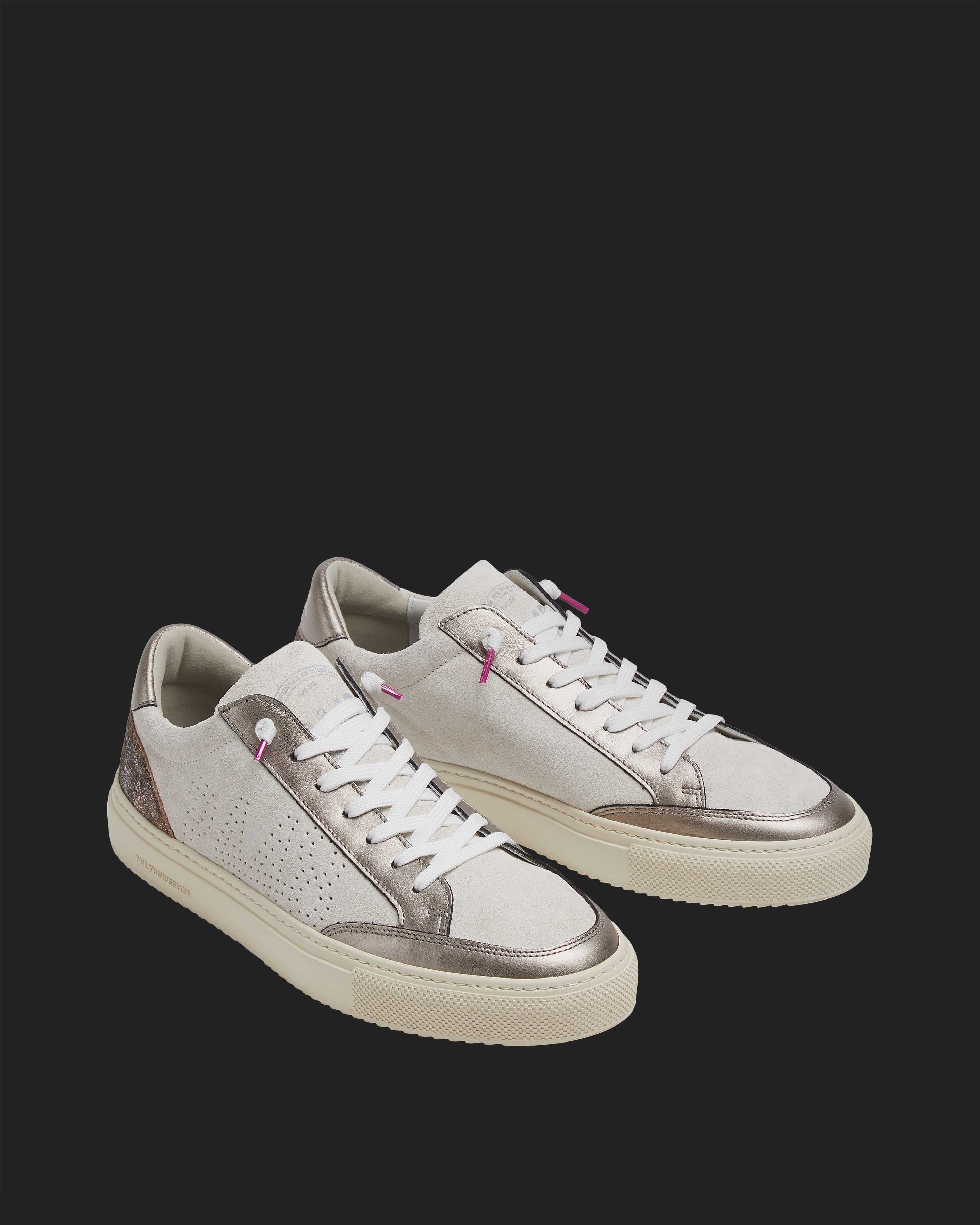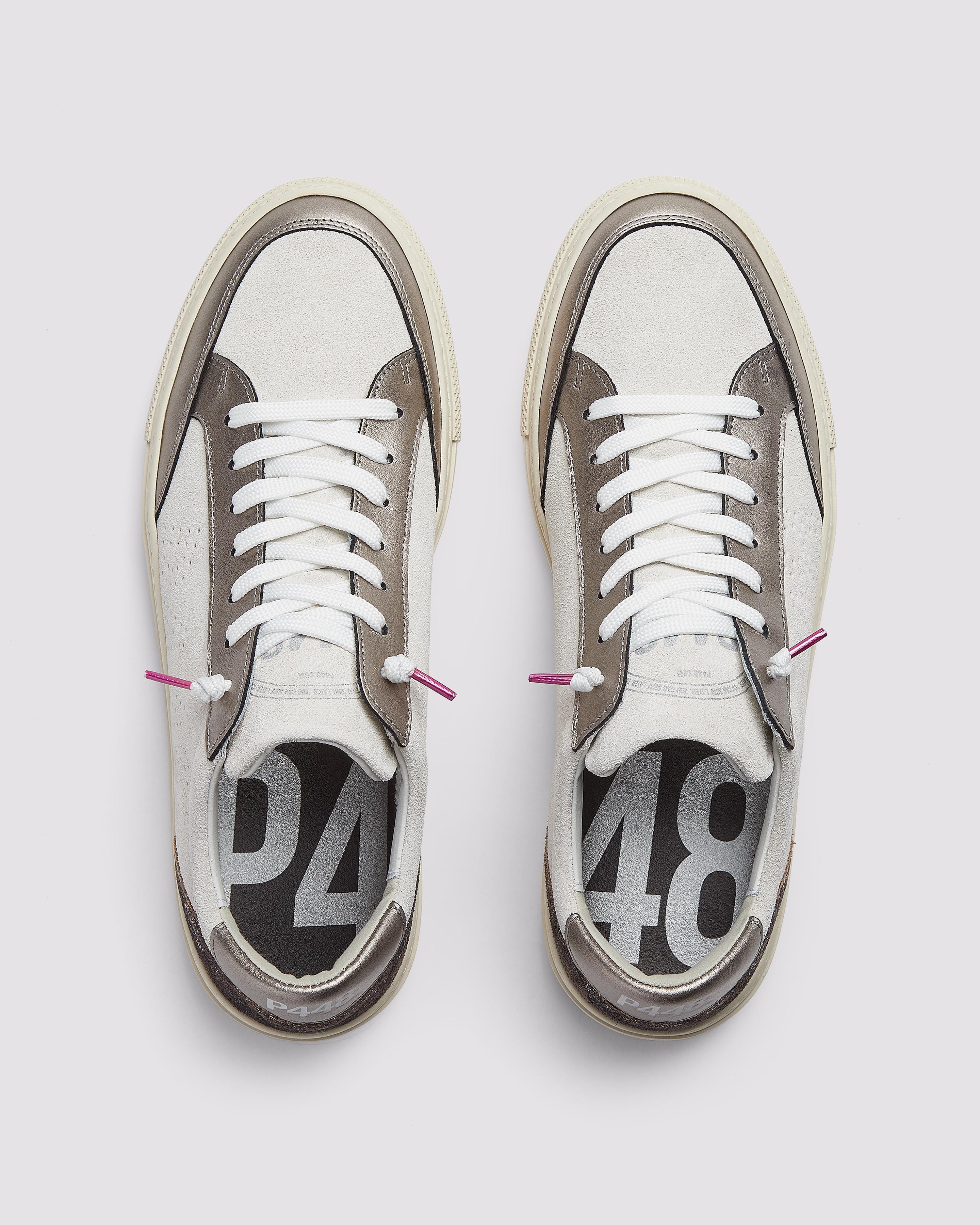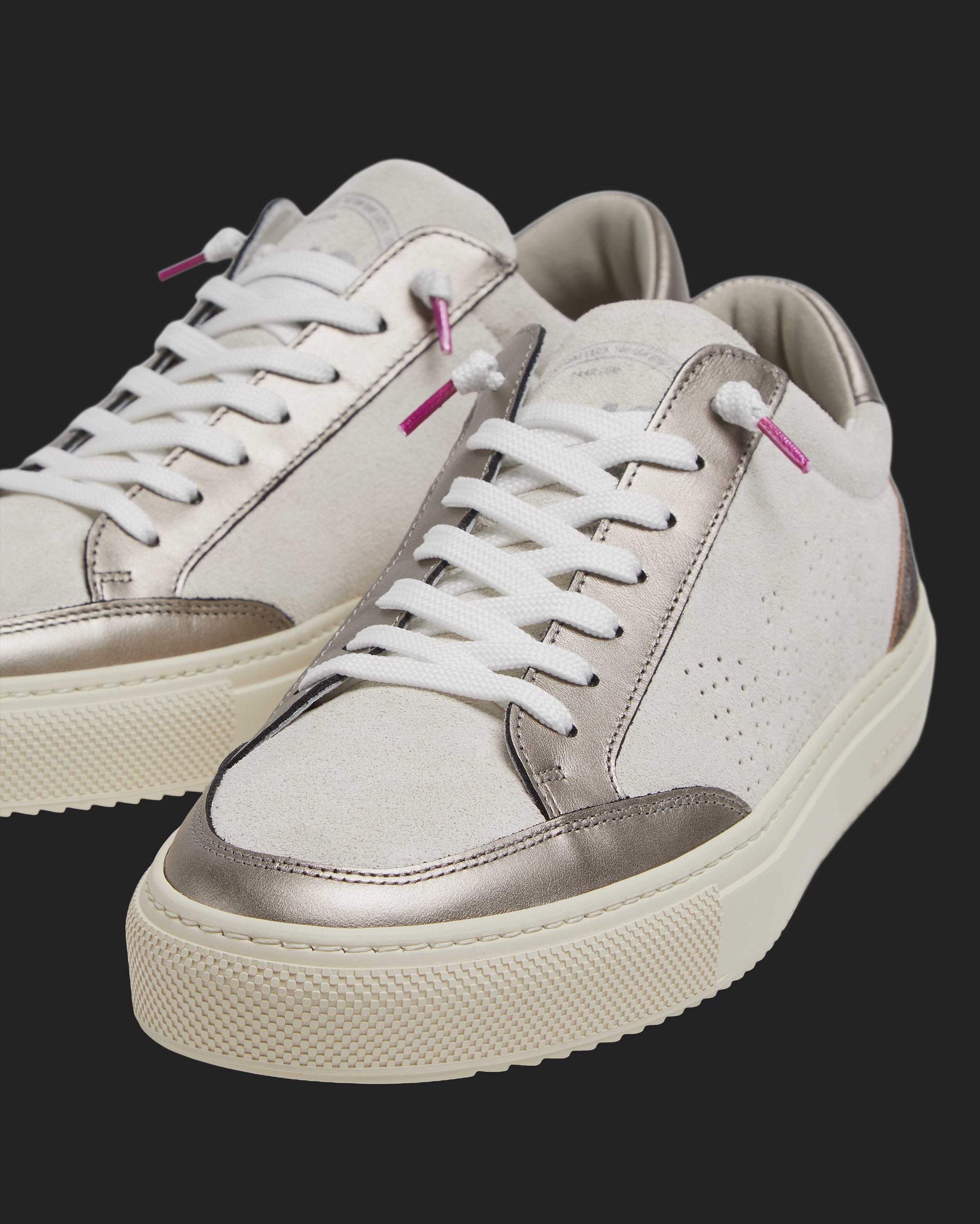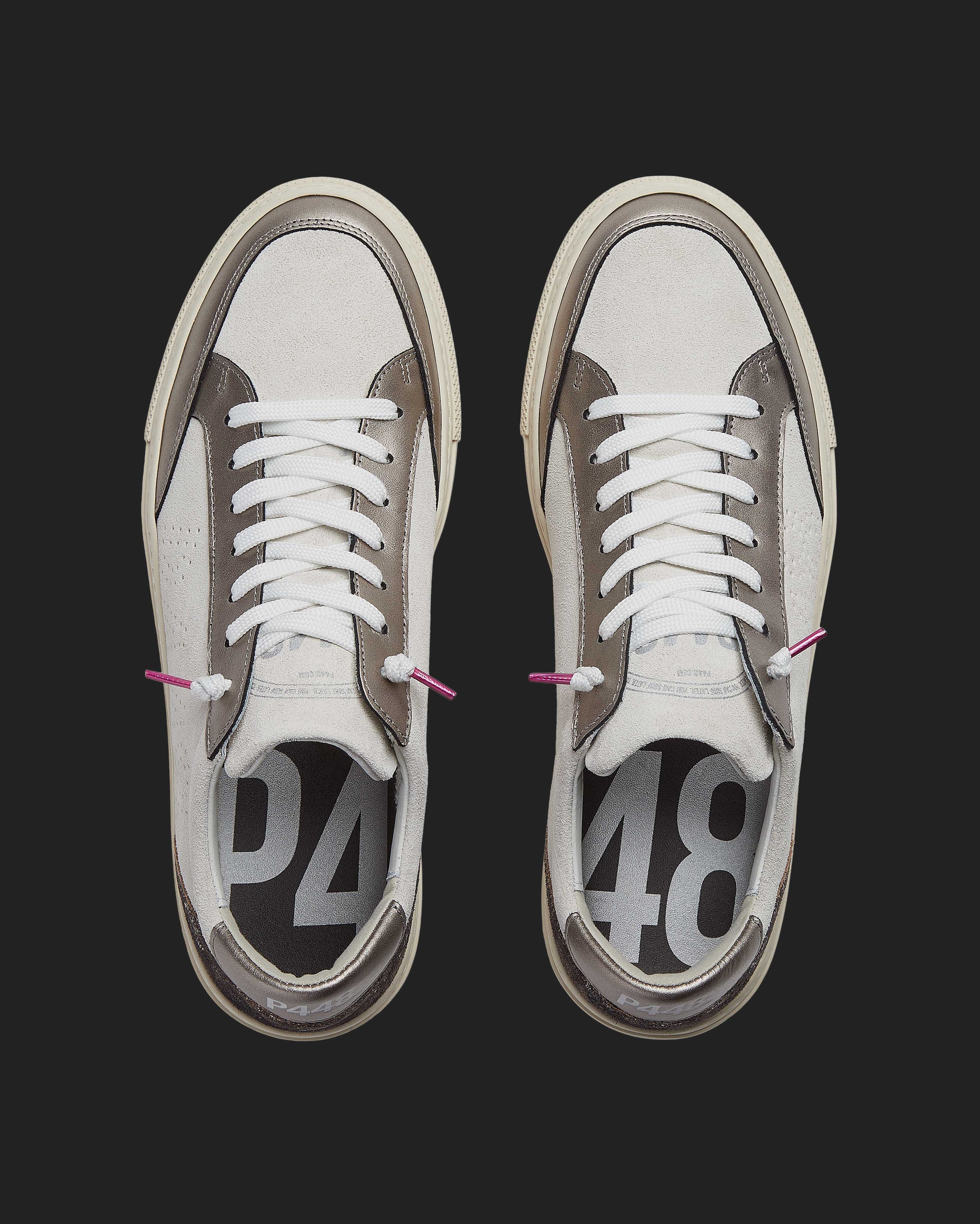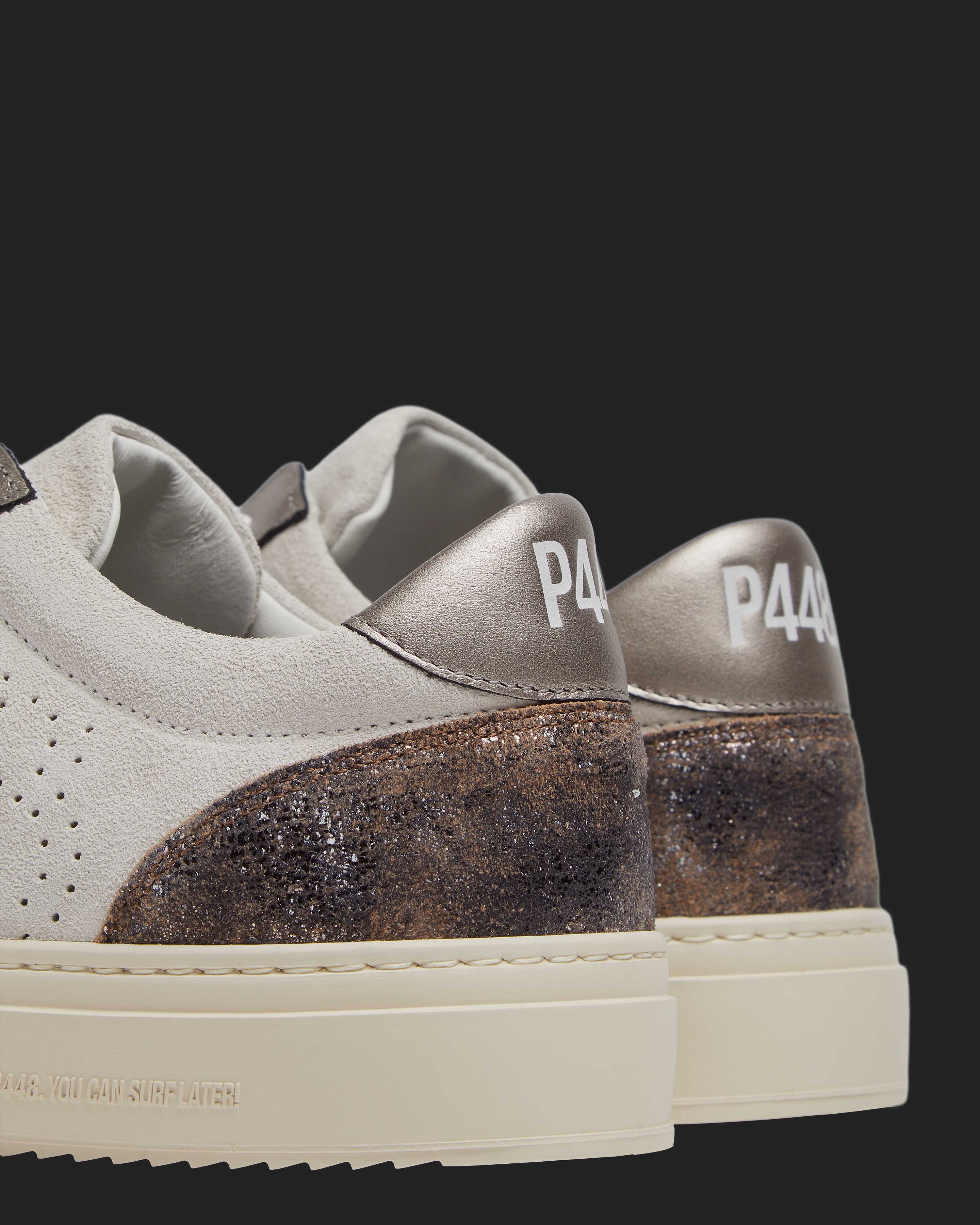 The Soho Moondust is wrapped in white suede and complemented by a silver leather trim and heel tab, pearly metallic leather toe and cloudy light brown metallic leather heel accent. White laces with violet aglets and our signature P448 hand-distressed rubber soles with dark grey treads tie it all together.