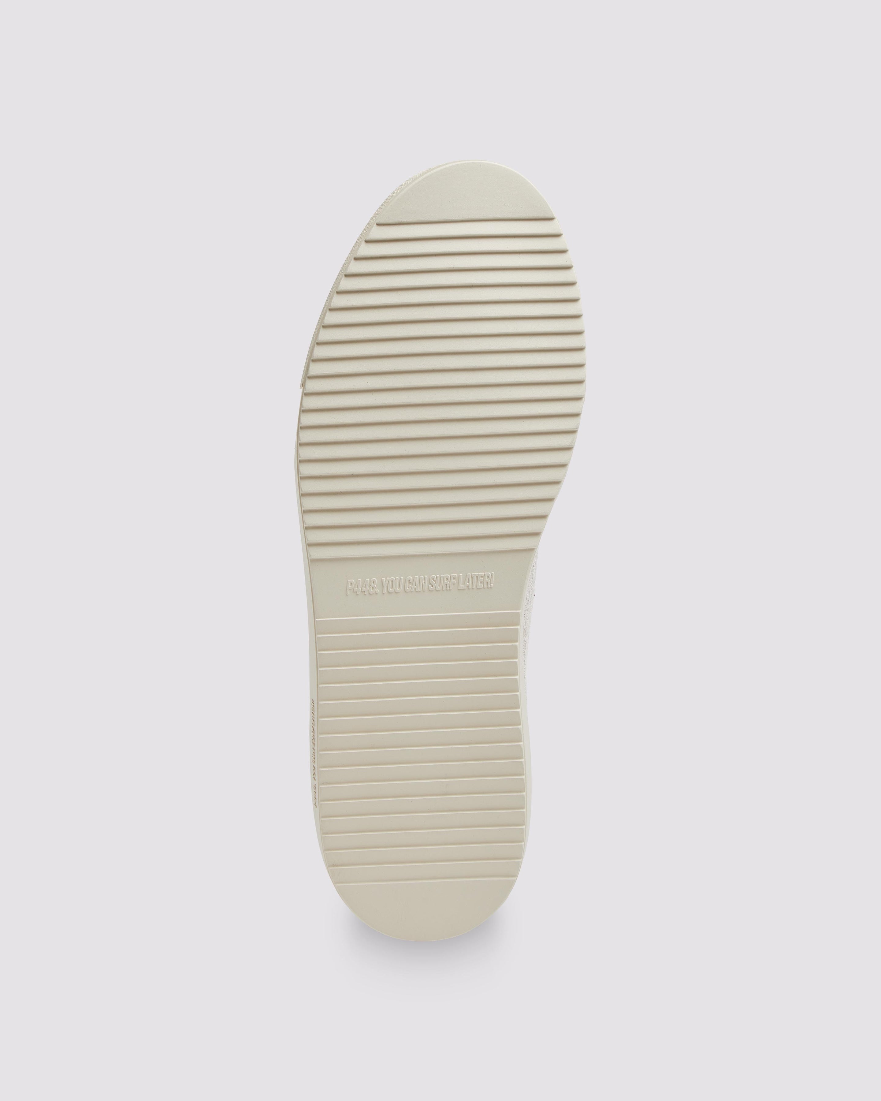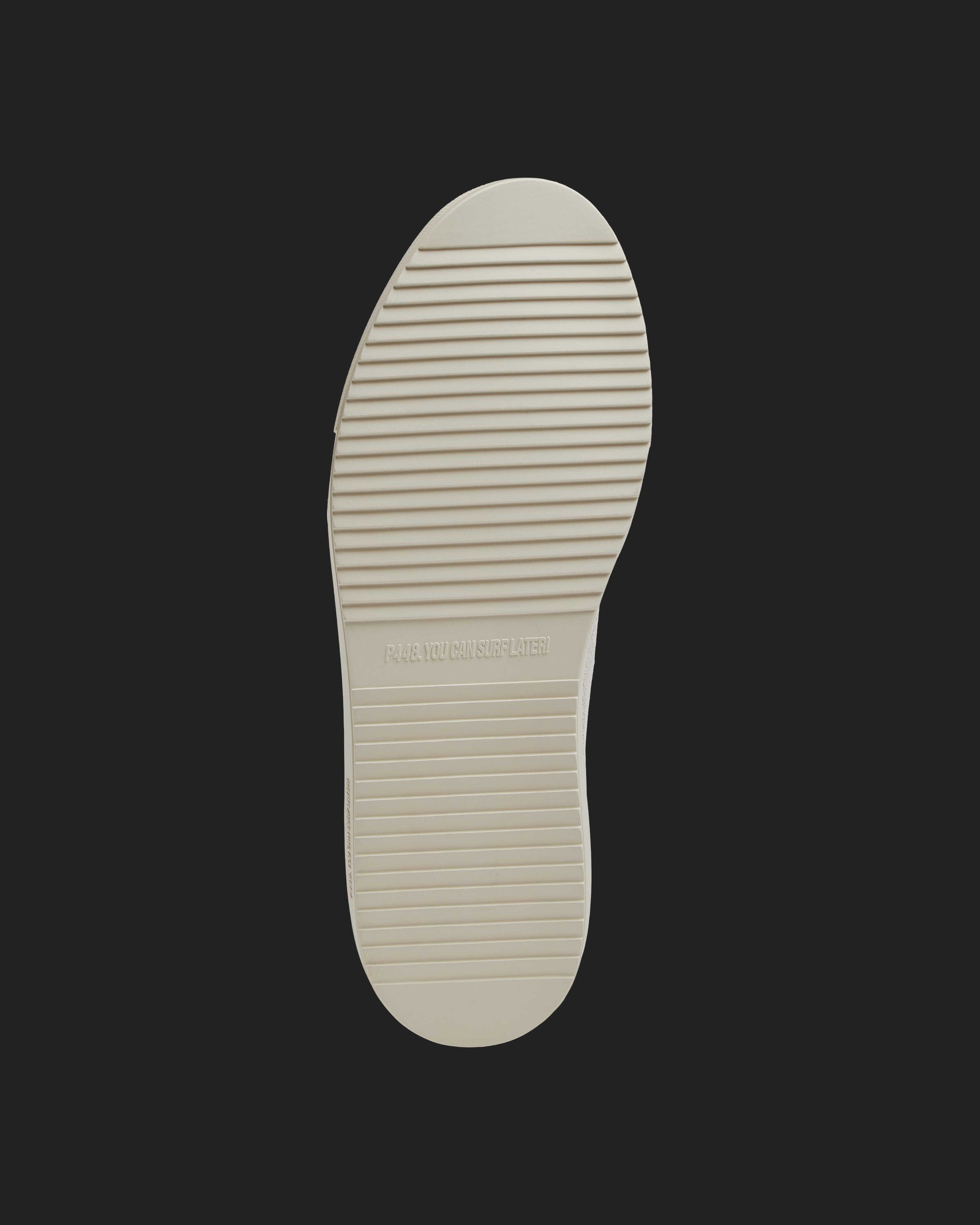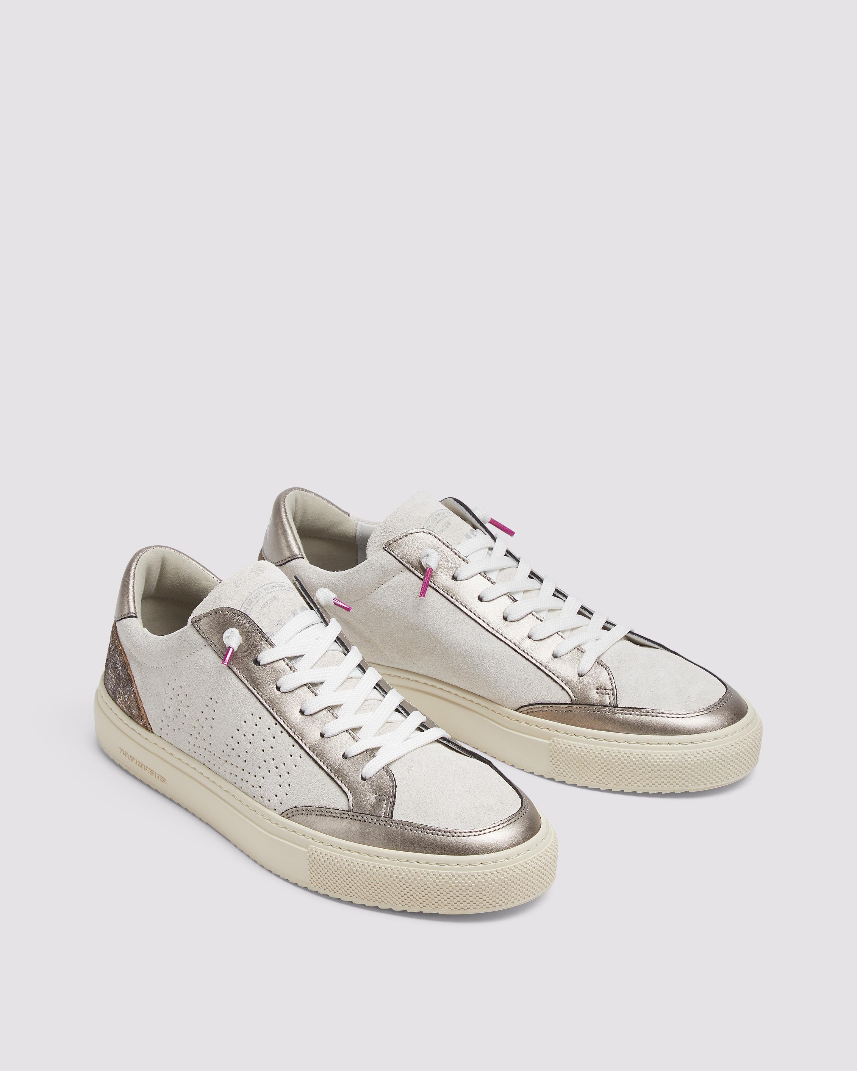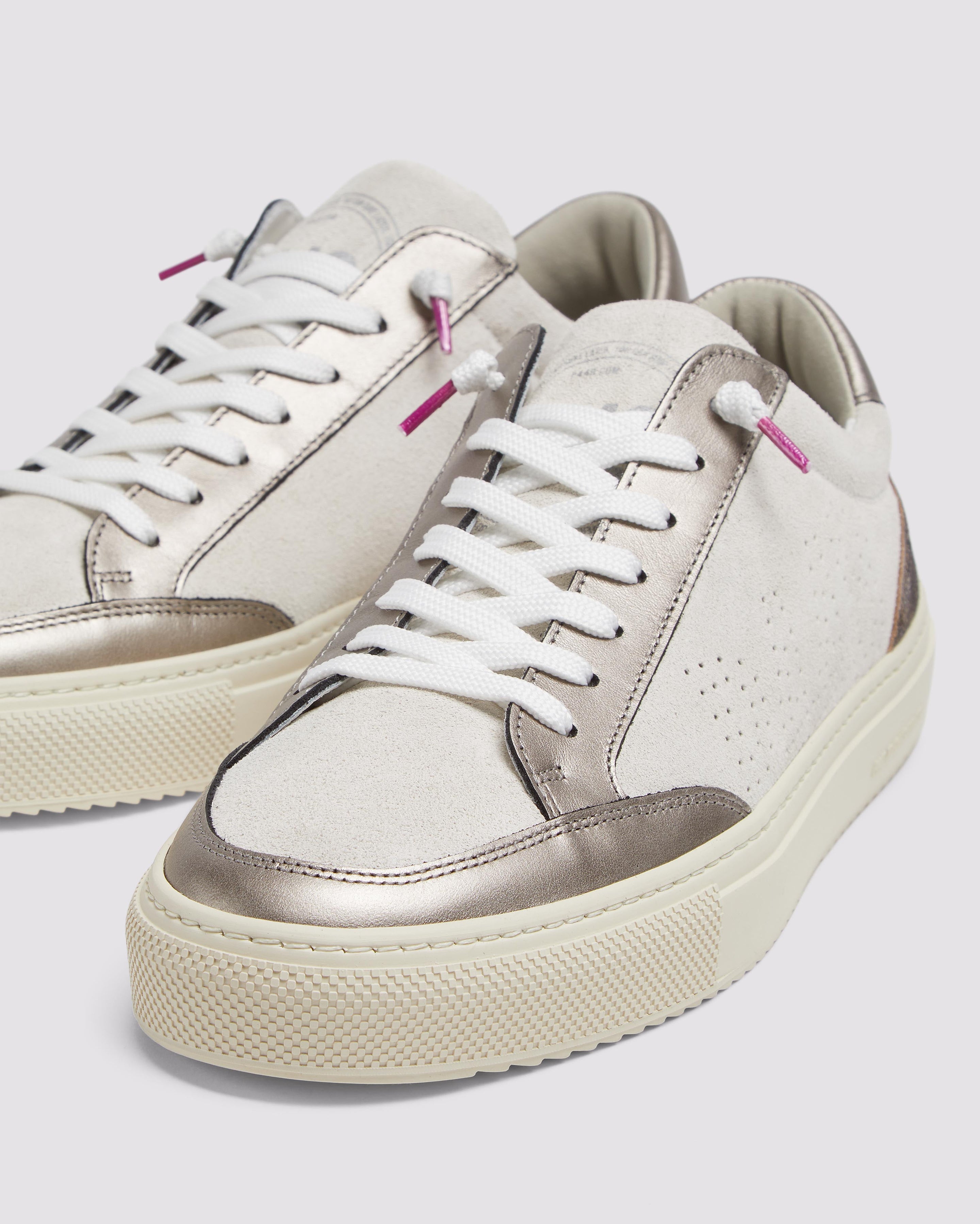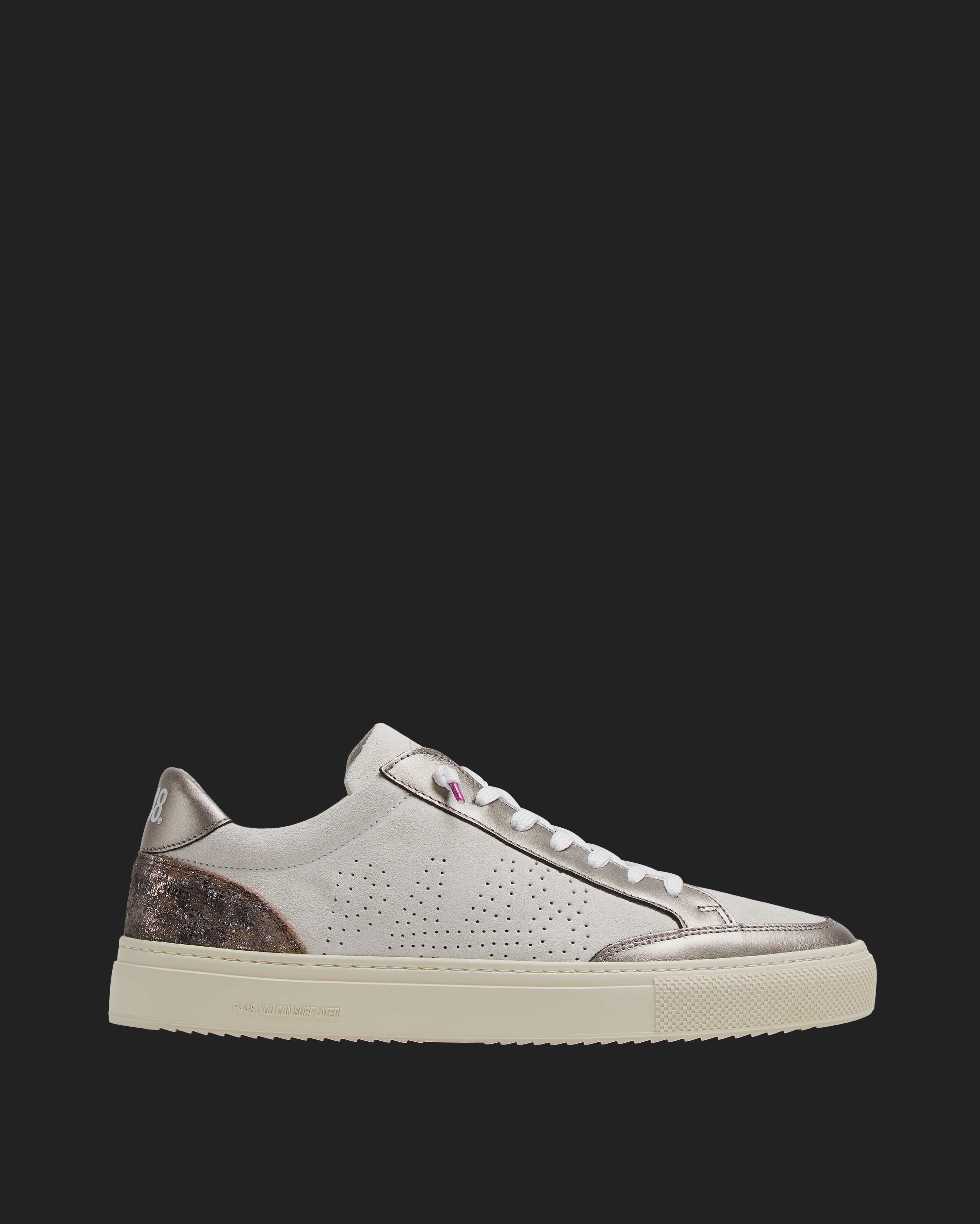 The Soho Moondust is wrapped in white suede and complemented by a silver leather trim and heel tab, pearly metallic leather toe and cloudy light brown metallic leather heel accent. White laces with violet aglets and our signature P448 hand-distressed rubber soles with dark grey treads tie it all together.