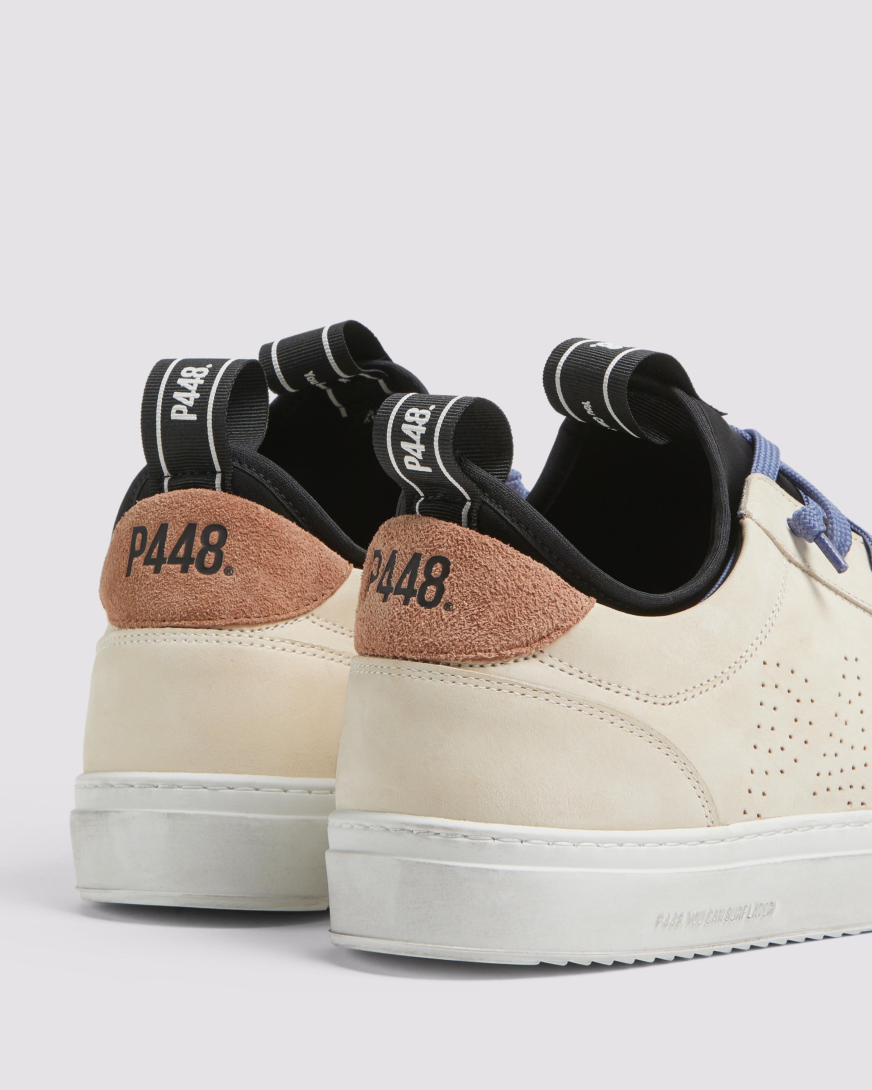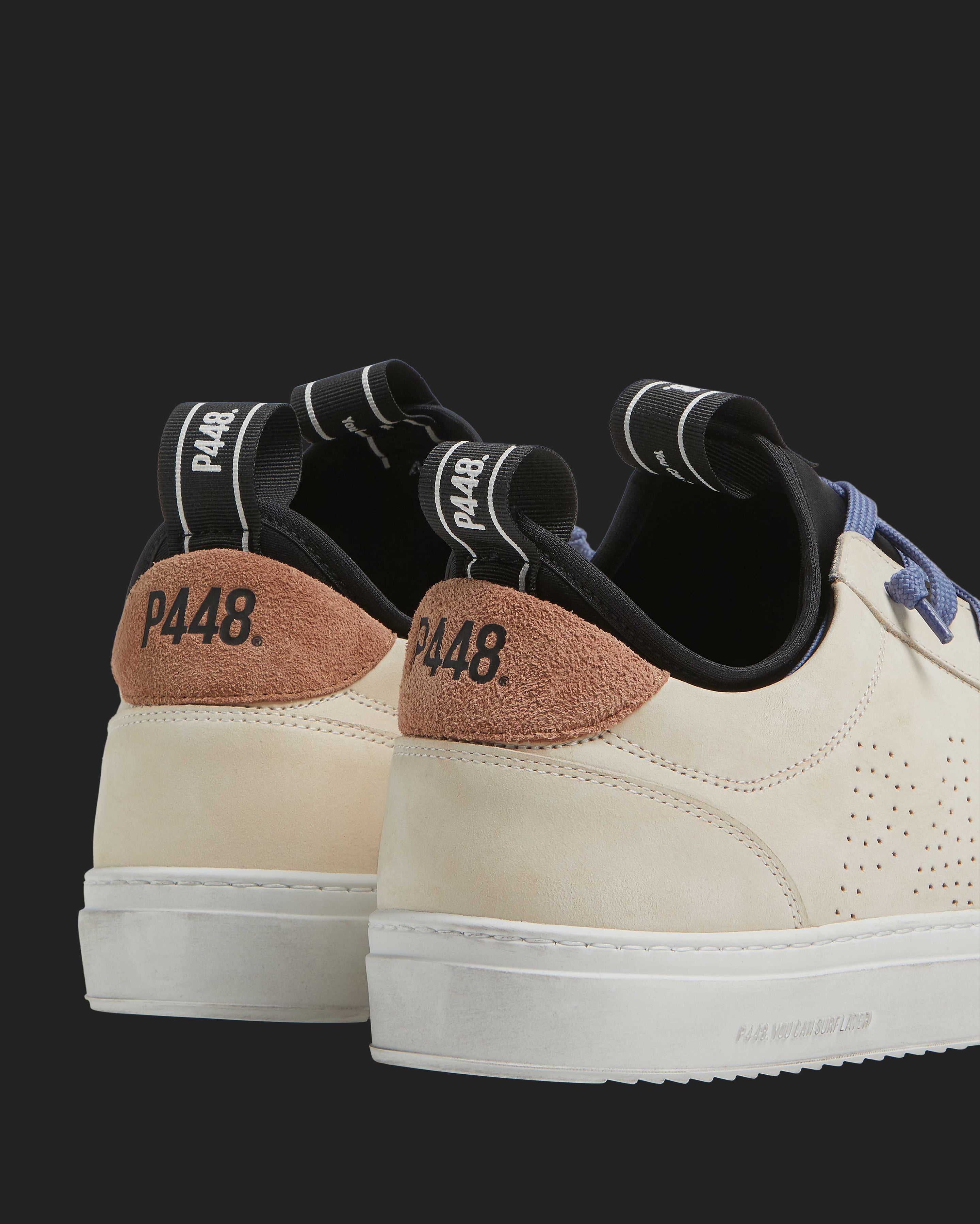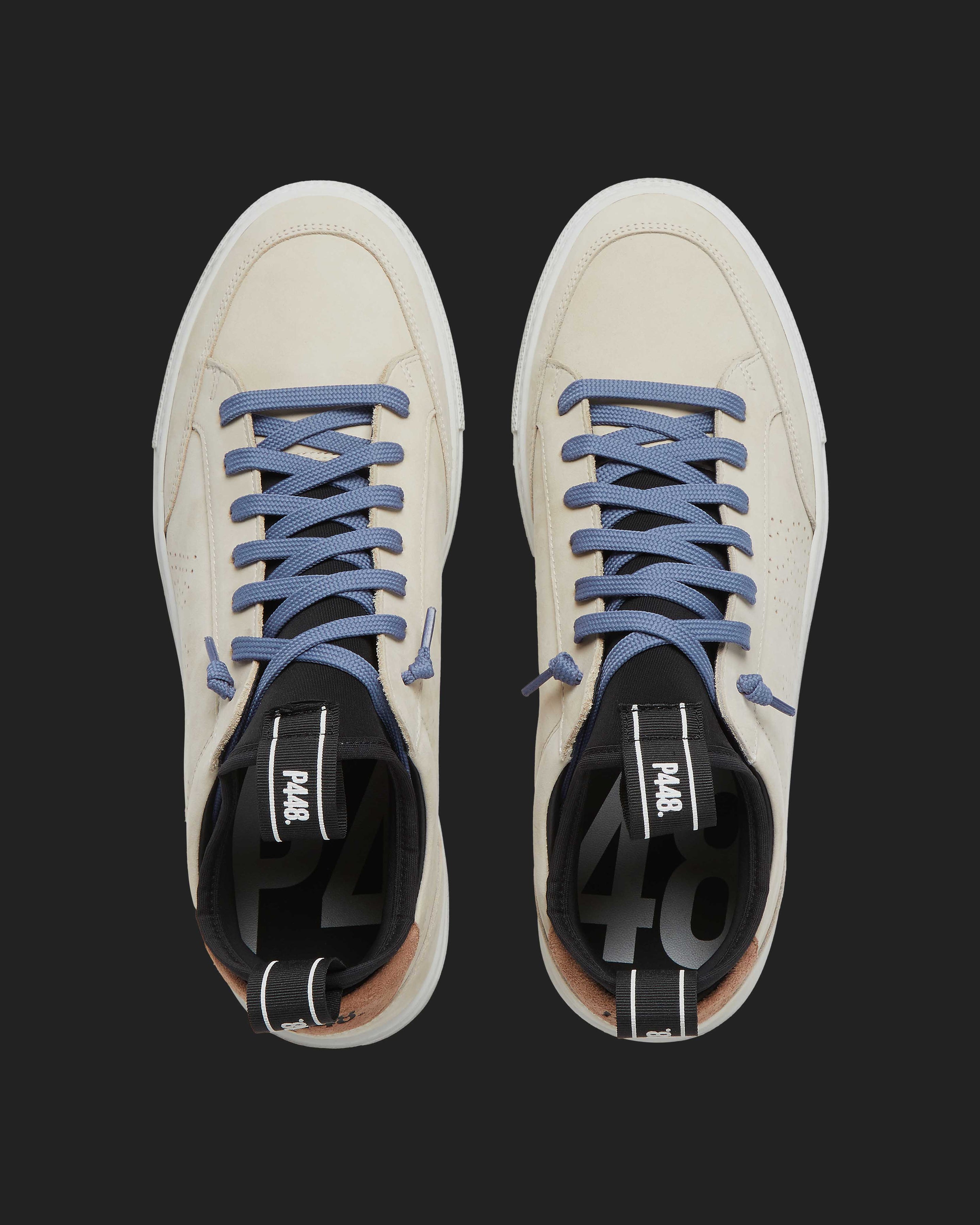 The easygoing Sohosocks Blurra is wrapped in cream nubuck leather with a contrasting brown suede heel tab and black sock lining. Deep blue laces and our signature P448 hand-distressed sole finish off the look.