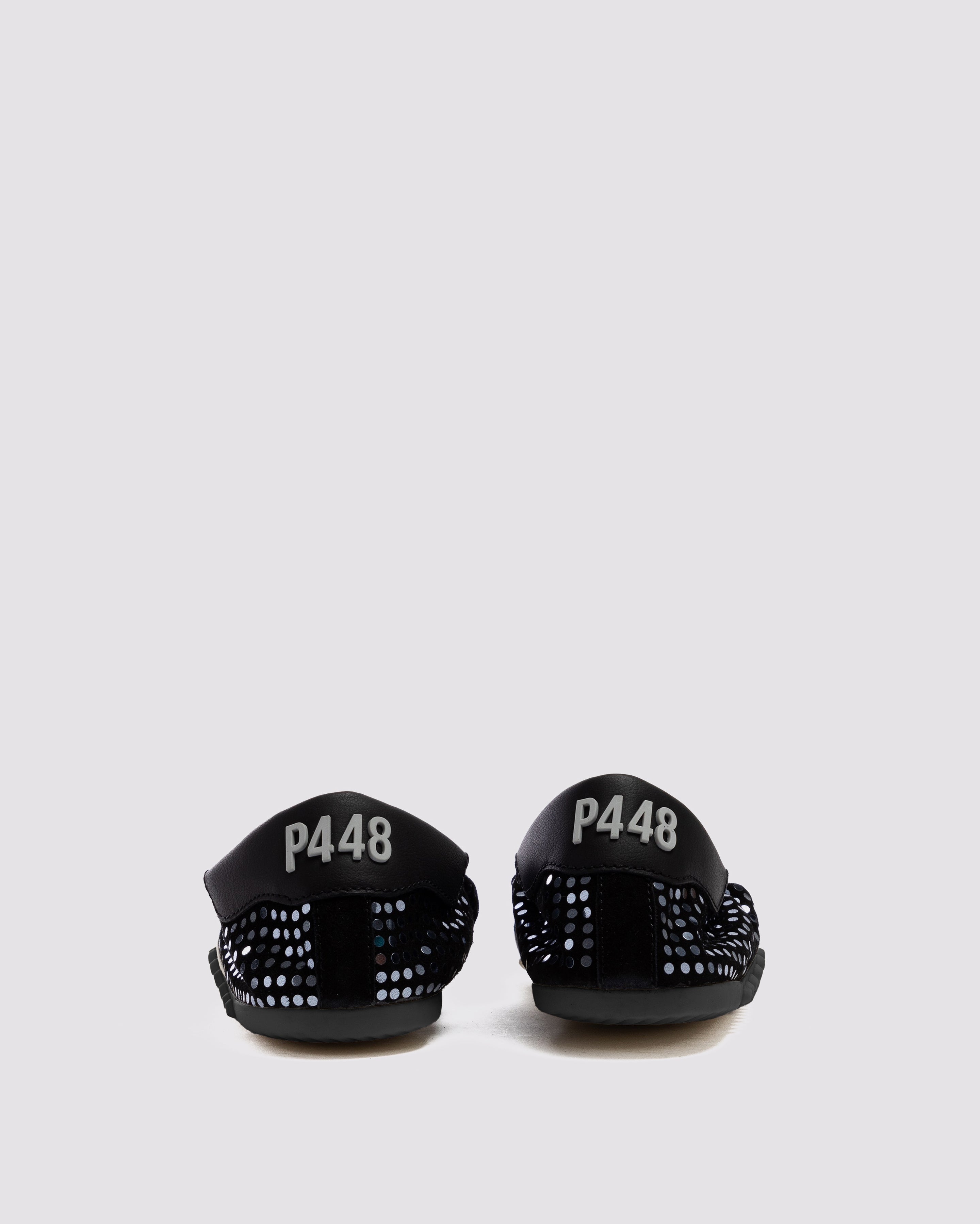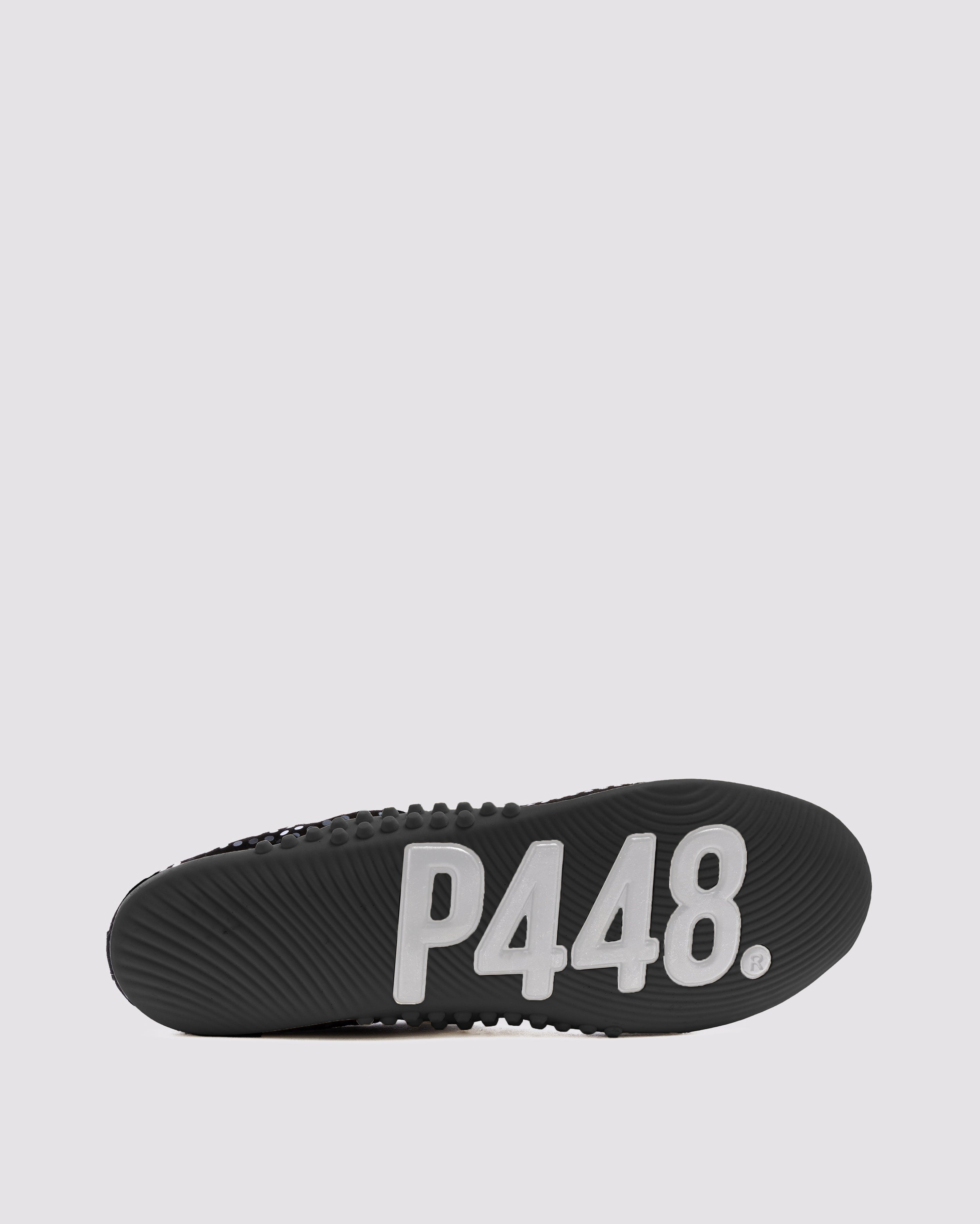 It features an all-over black suede design embellished with silver paillettes and a black leather heel tab. Our P448 raised black soles finish off the look.