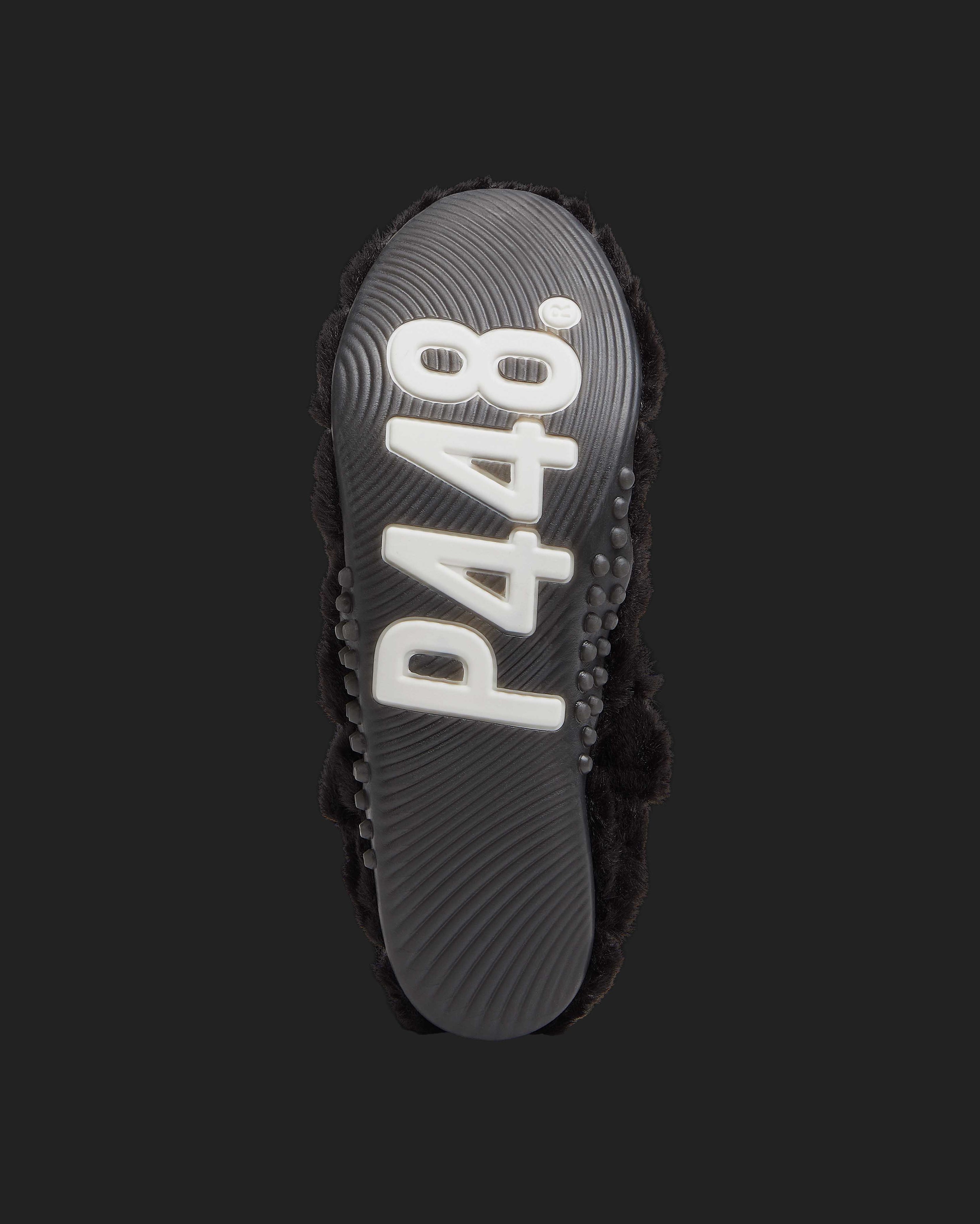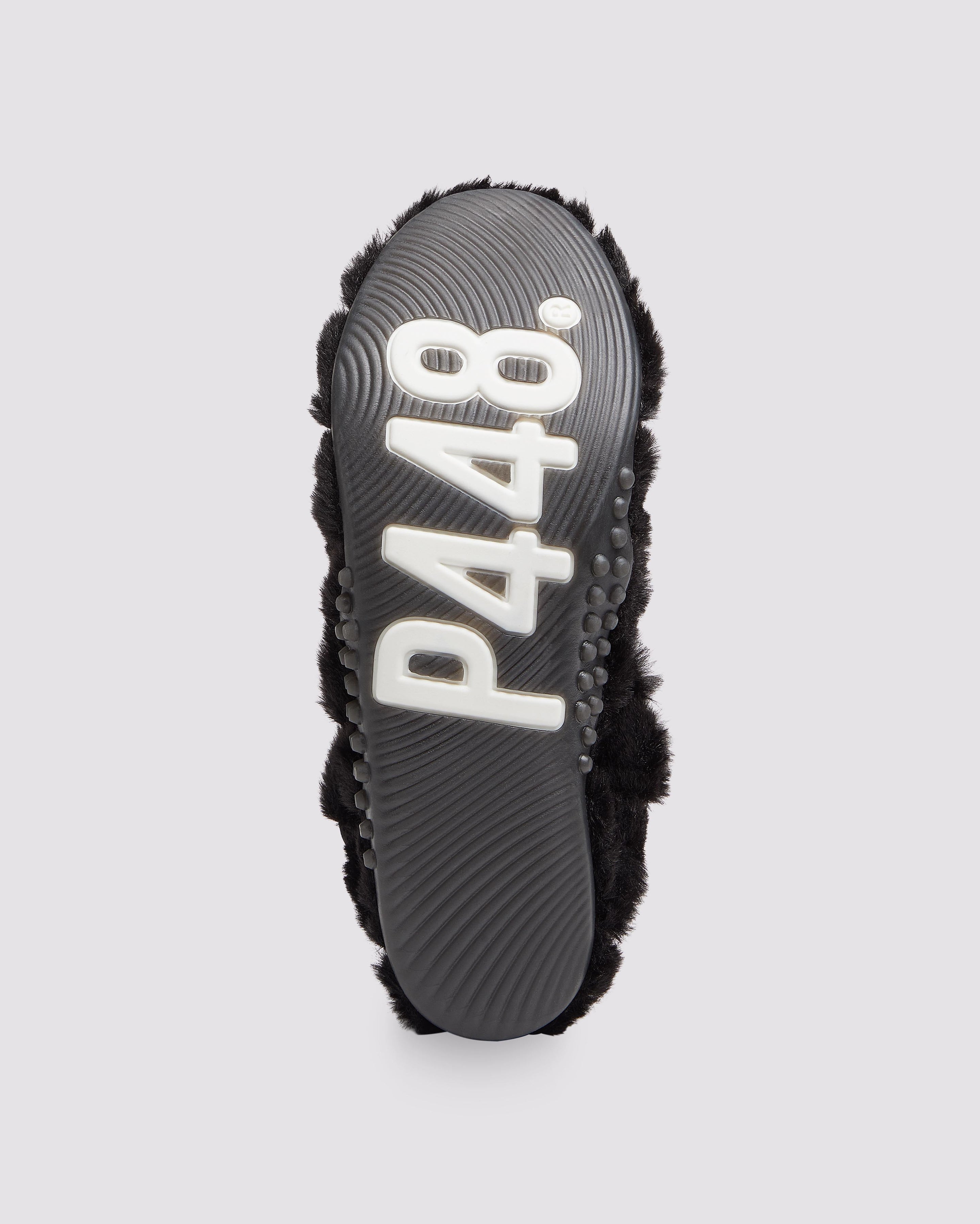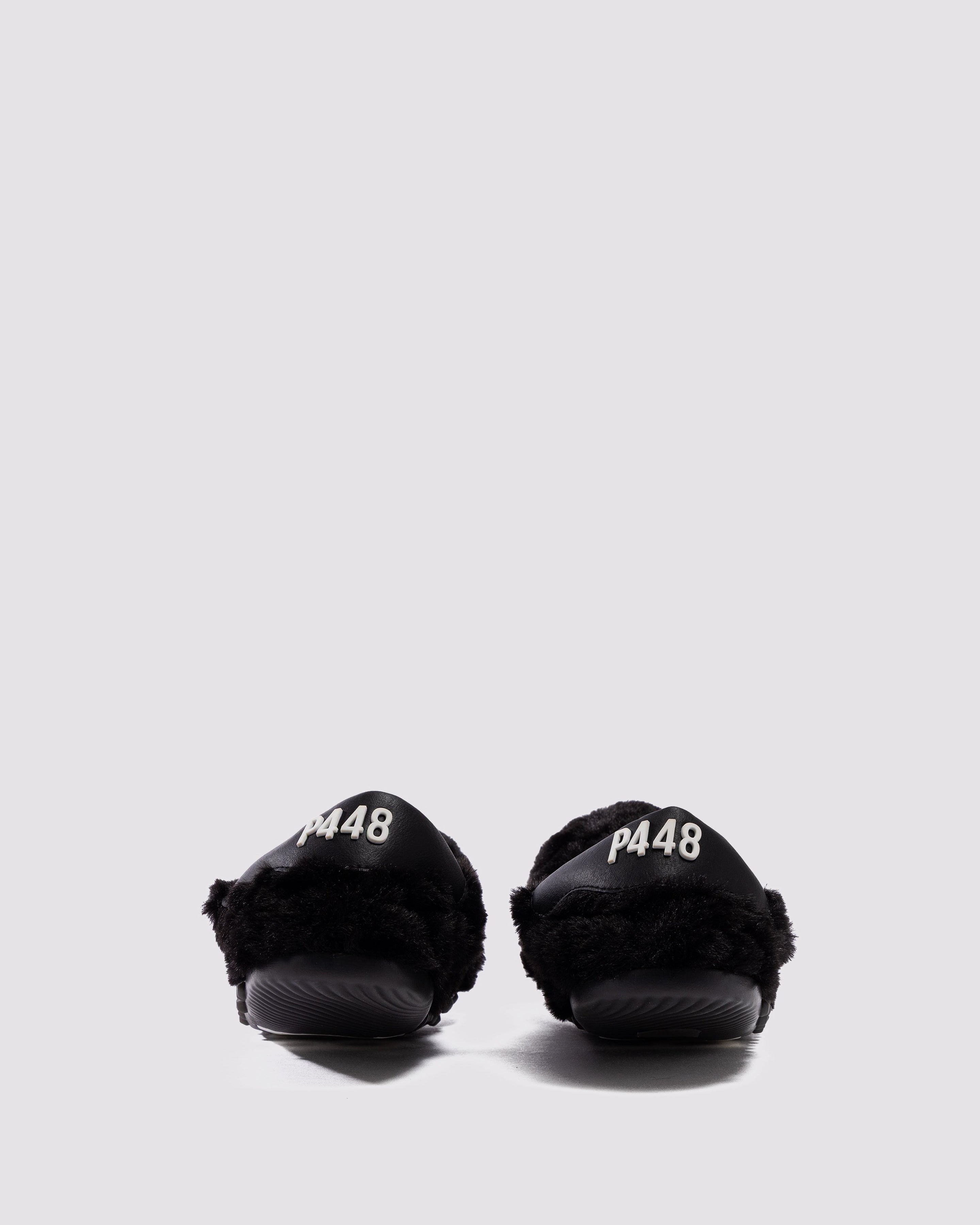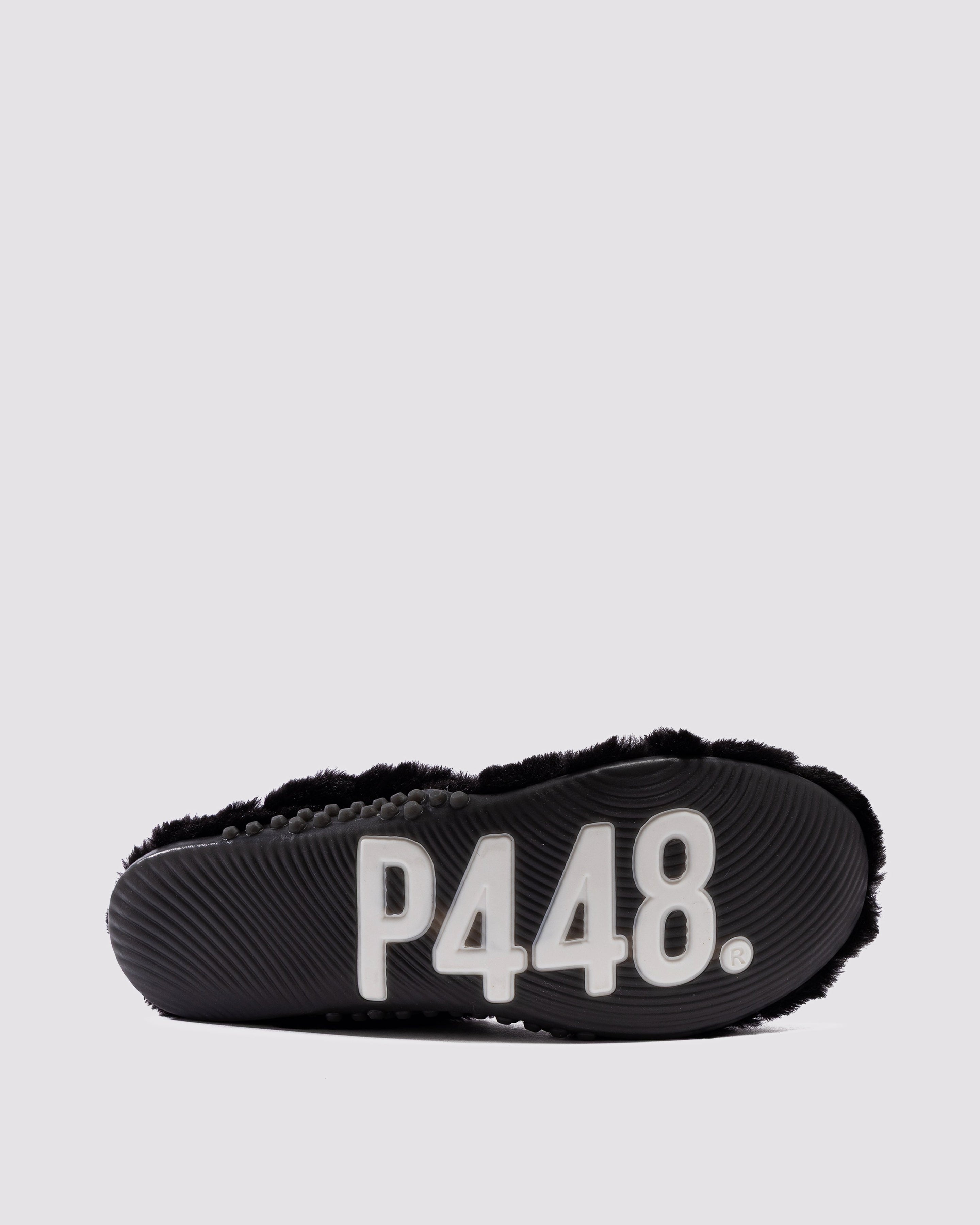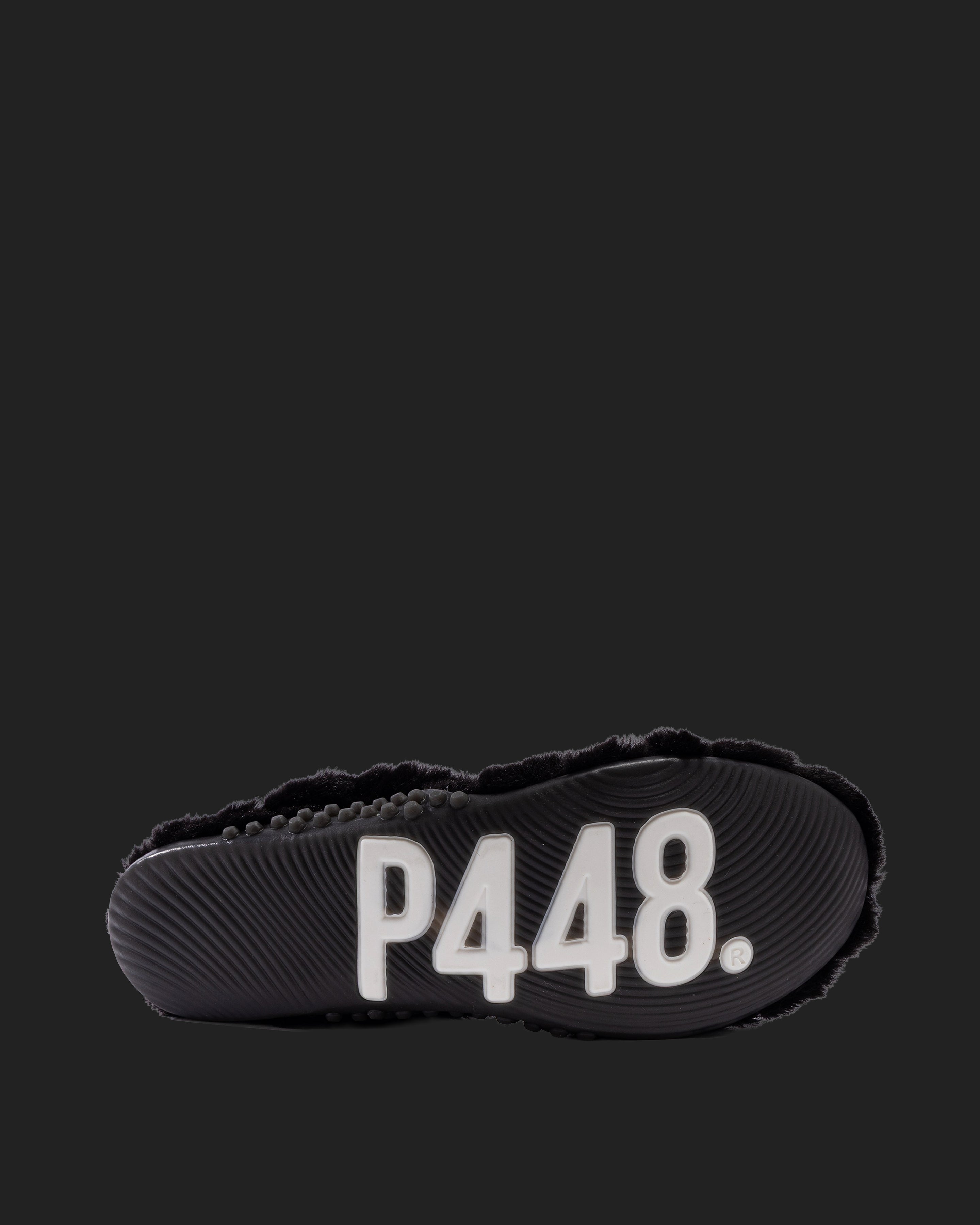 It features an all-over quilted black faux fur design with a black recycled leather heel tab. Our P448 raised black rubber soles finish off the look.