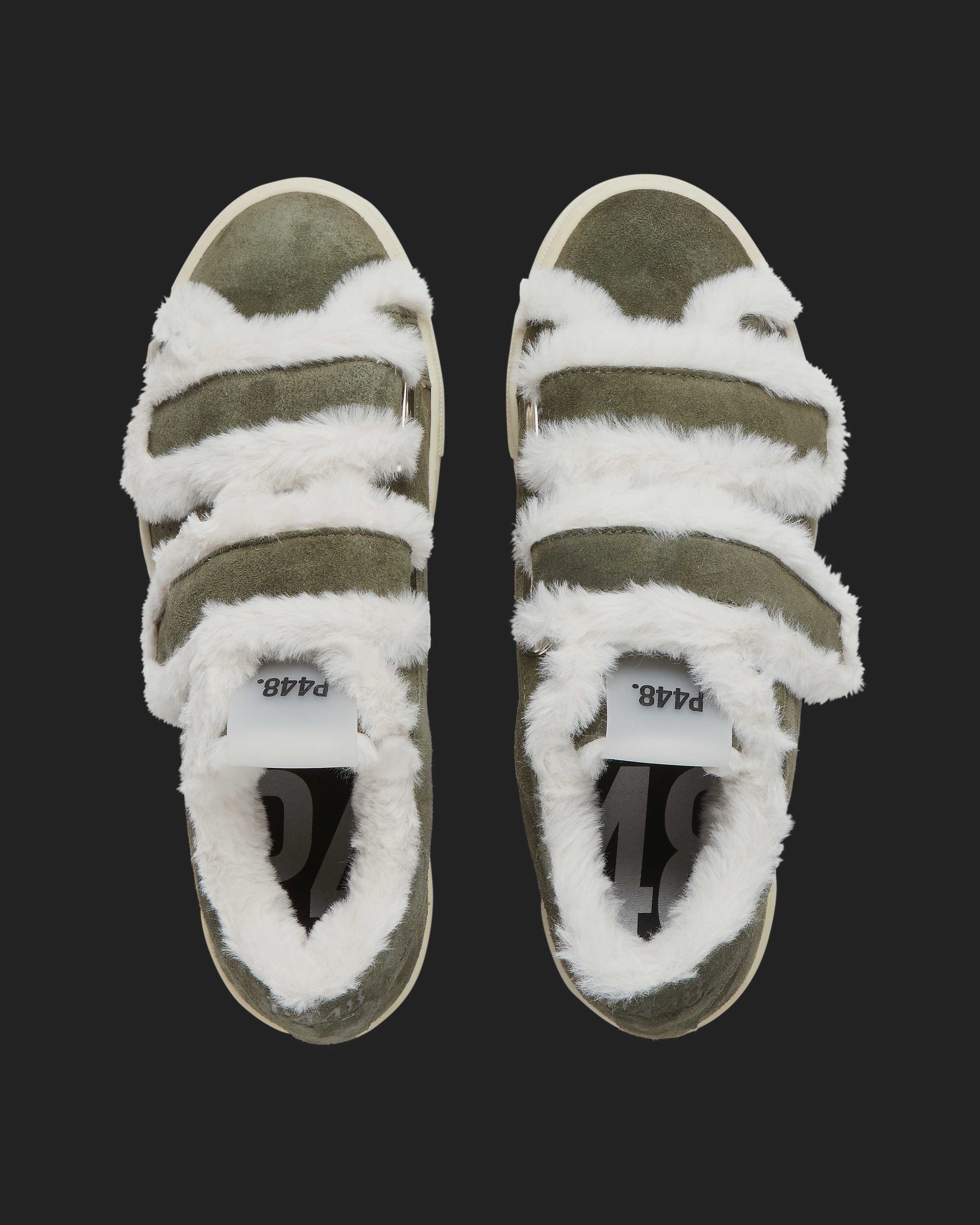 The Thea Flok/White features a white leather upper with a perforated P448 logo, complemented by off-white suede trims and tongue. A beige sparkling suede heel tab and ivory cotton laces complete the look, grounded by our signature P448 platform rubber soles with white treads.