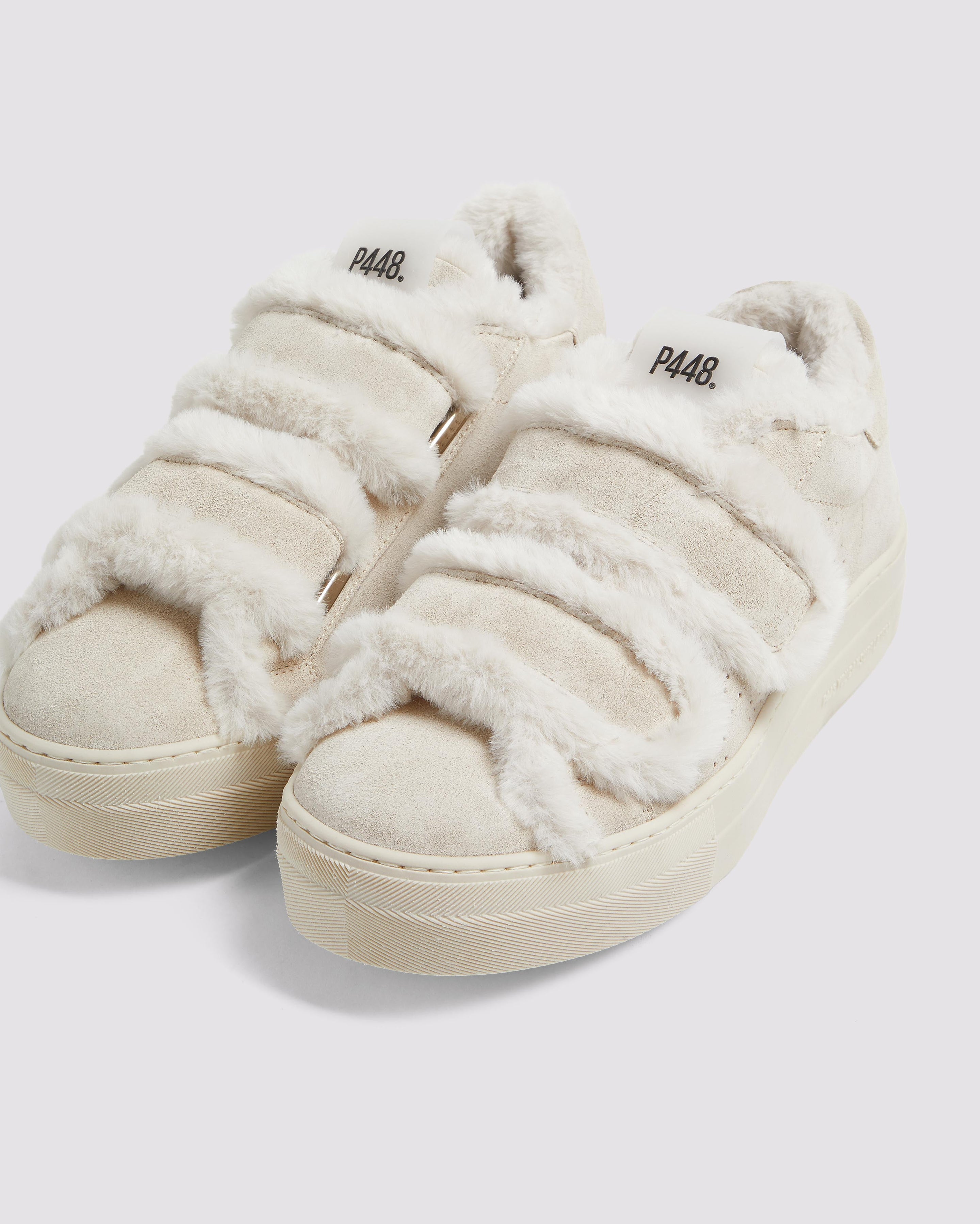 The Thea Sherpa Sand is wrapped in beige suede with matching straps and soft white sherpa trims. Our signature P448 platform rubber soles finish off the look.