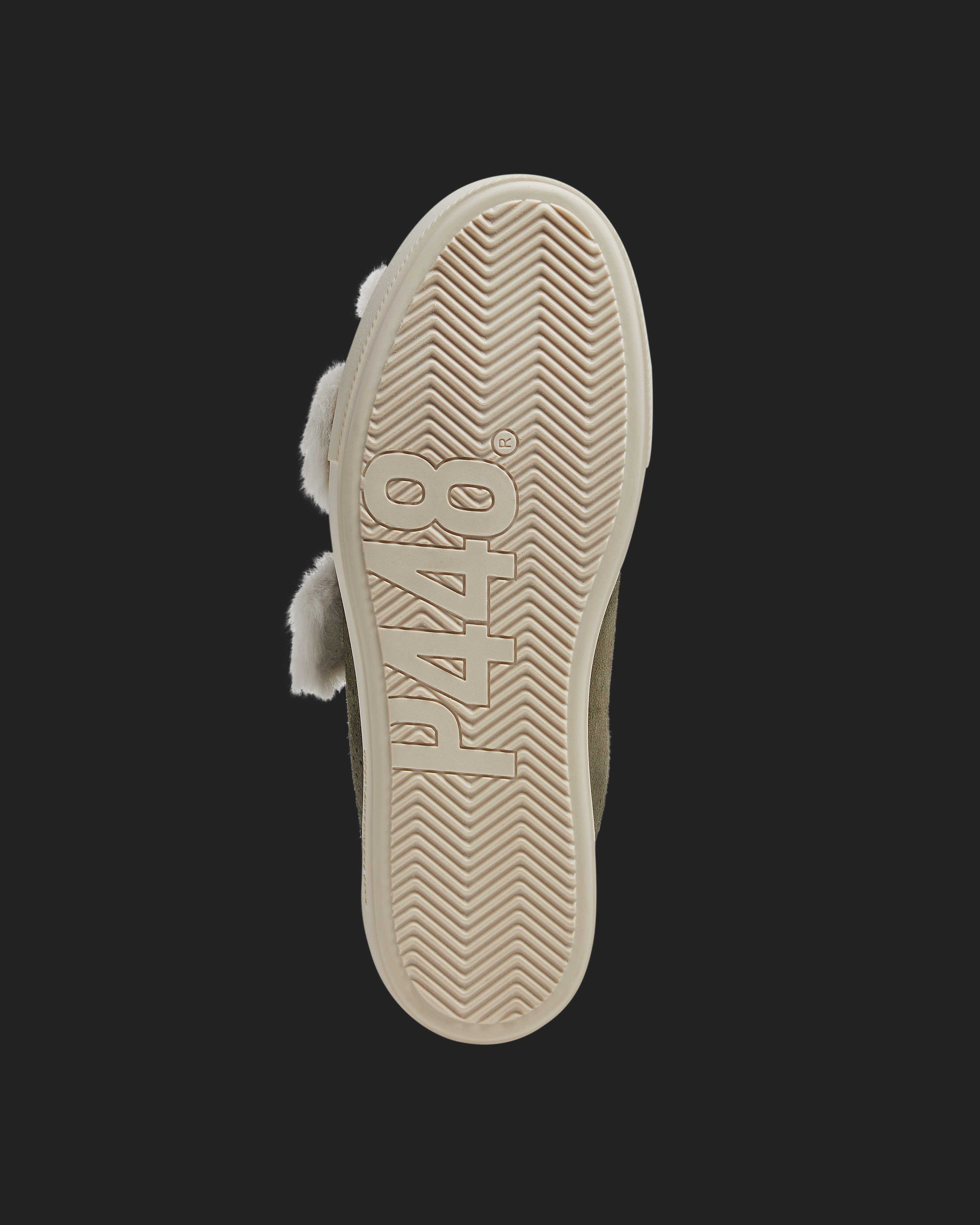 The Thea Sherpa Green is wrapped in army green suede with matching straps and soft white sherpa trims. Our signature P448 platform rubber soles finish off the look.