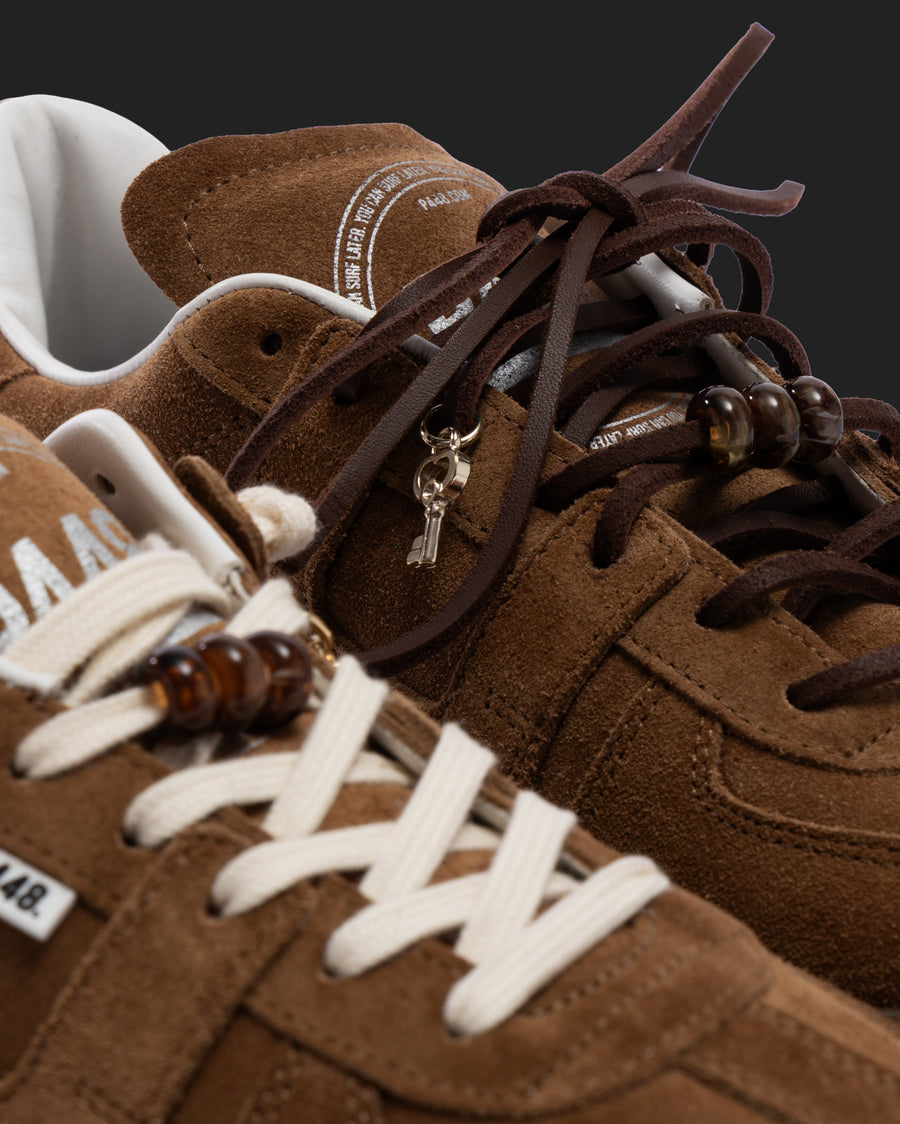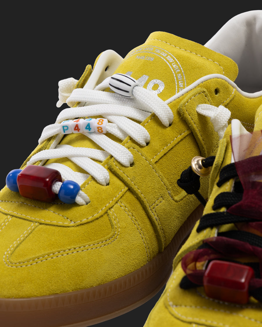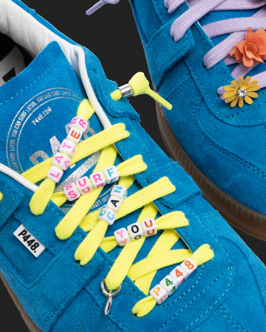 The Jack Flash is wrapped in white leather and light beige suede accented by fluorescent blue and orange leather. Black cotton laces and fluorescent yellow treads tie it all together.