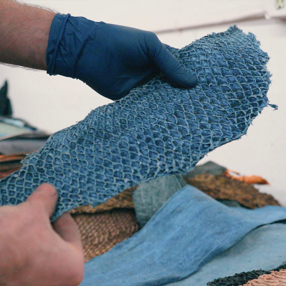 After months of research, testing and trial samples, we partnered with eco‑friendly leather manufacturer Aquaborne to use their hybrid tanning method, which saves 80% of the water and energy used in the traditional tanning process.