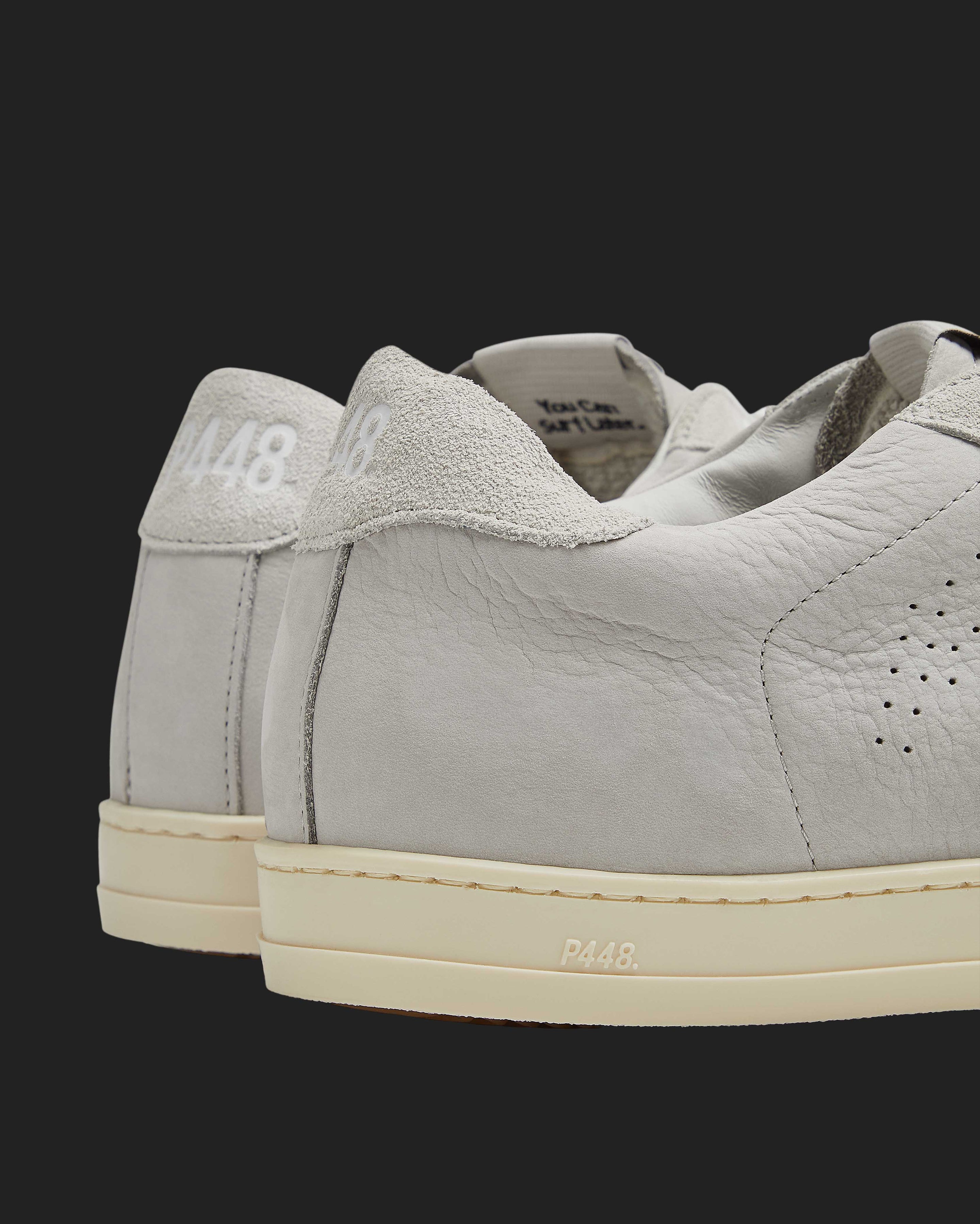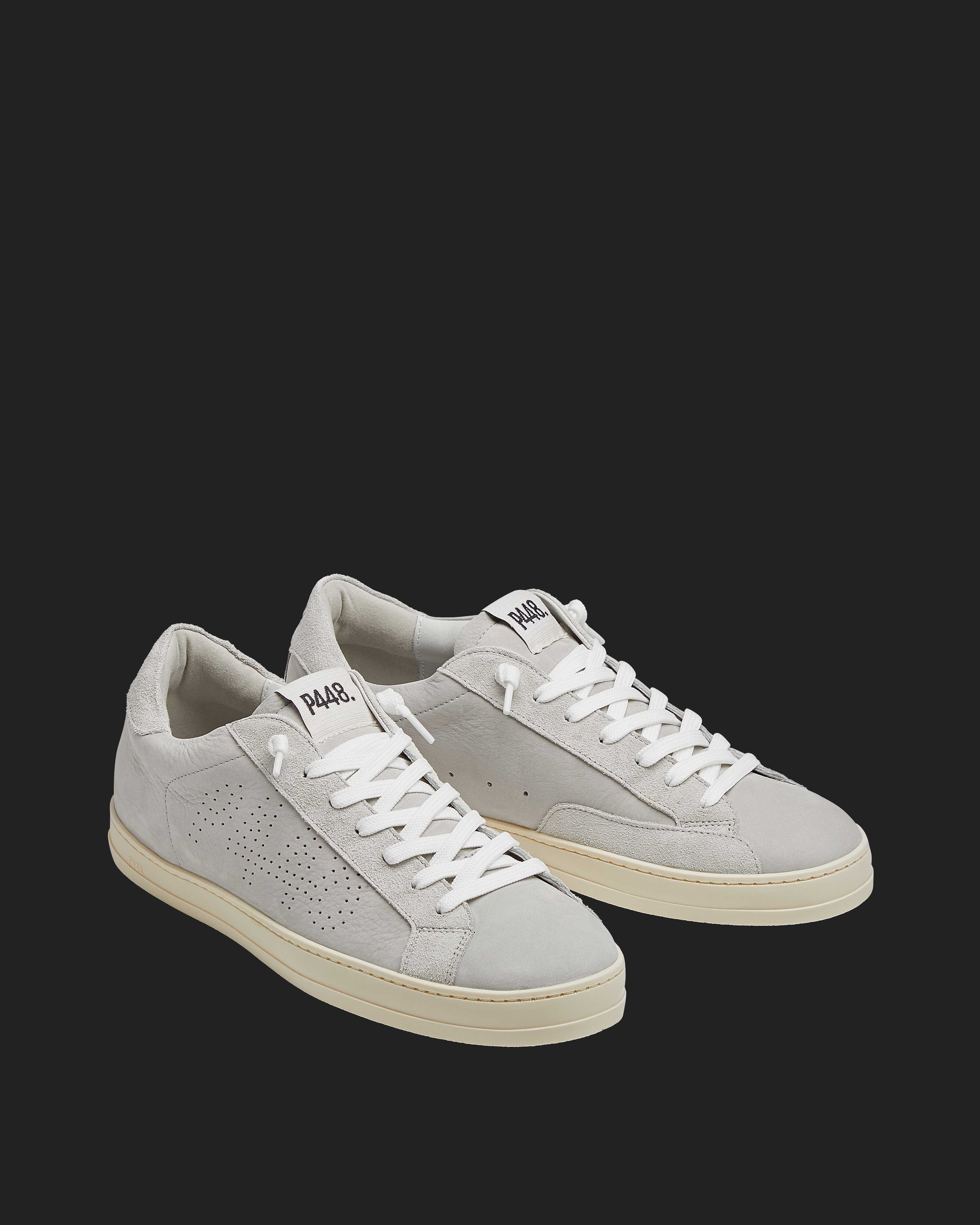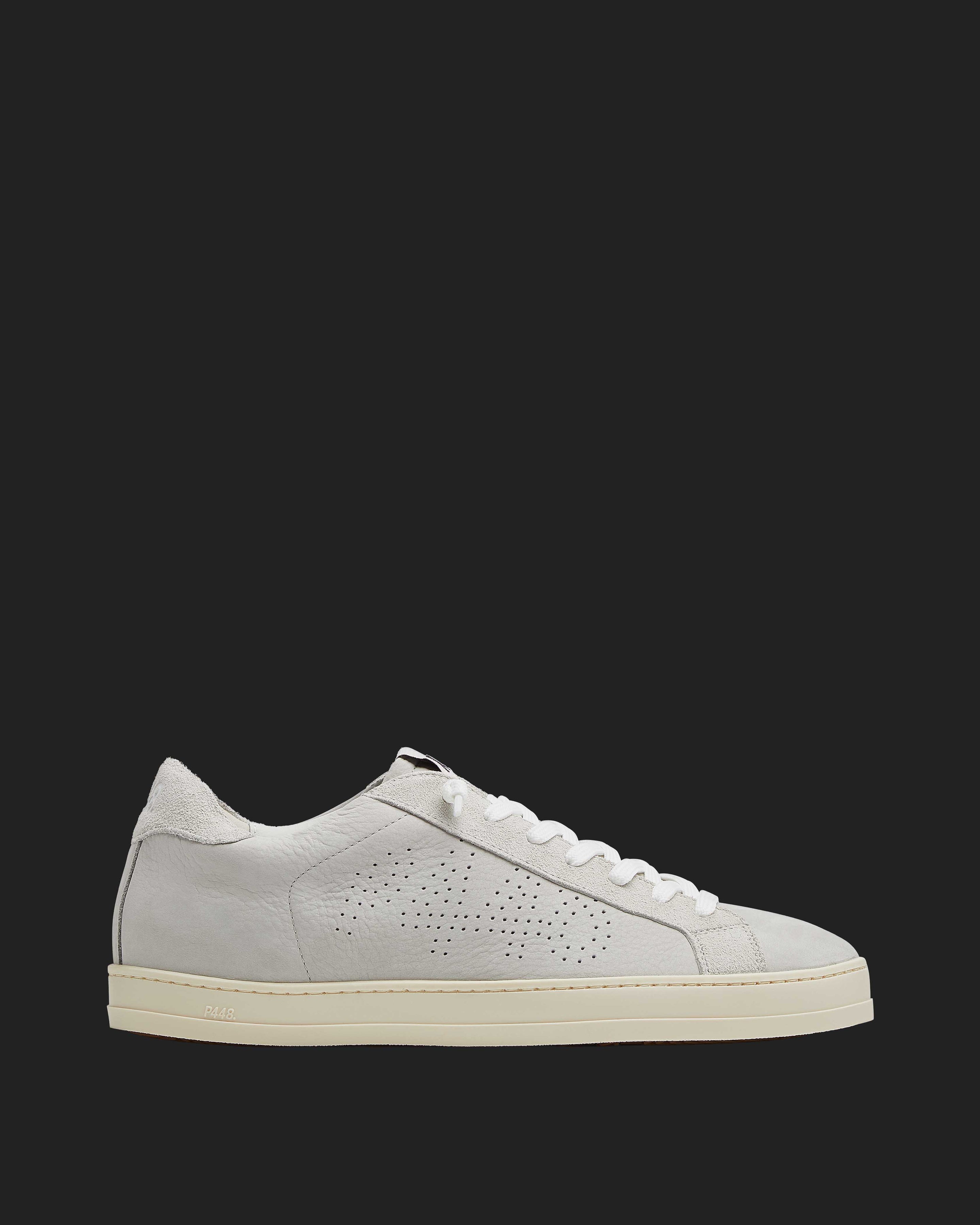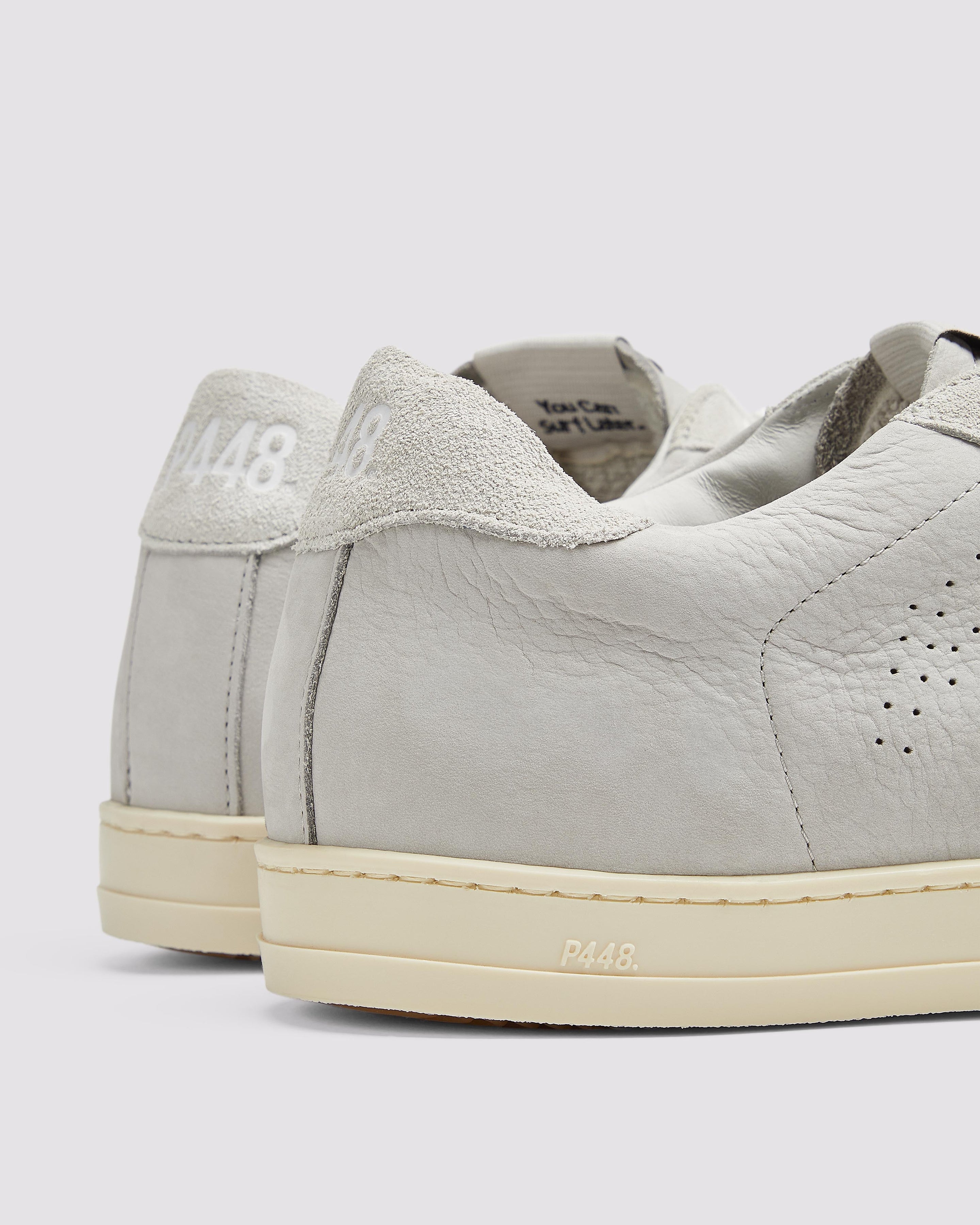 The John Grey features a grey leather upper with a perforated P448 logo, accented by a grey leather tongue, toe, and heel tab. Grey suede trims add texture, while white cotton laces and our signature P448 rubber soles with beige tread complete the look.