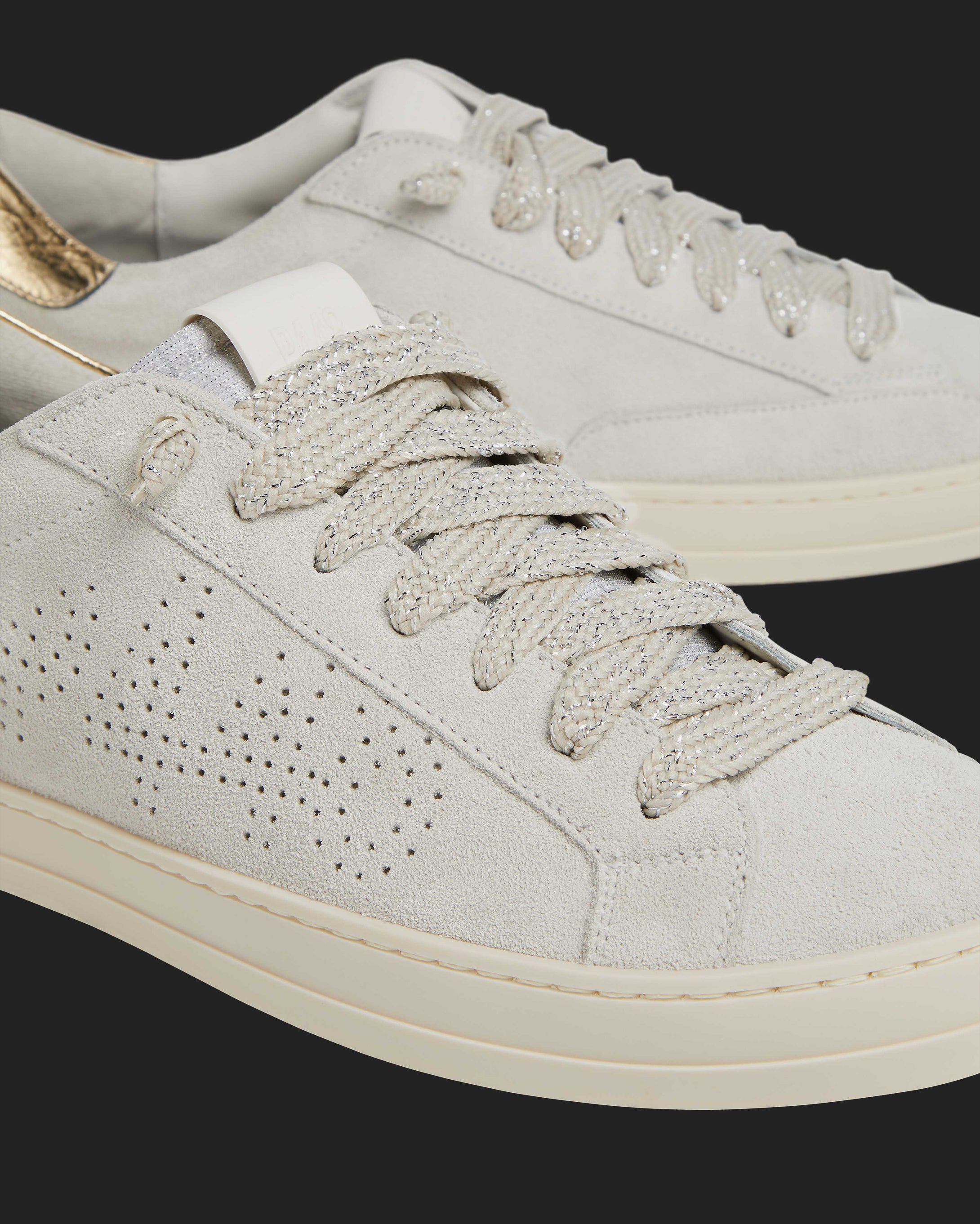 The John Copper is wrapped in off-white suede accented by gold fabric details across the tongue and heel tab. Off-white glitter laces and matching gold treads finish off the look.