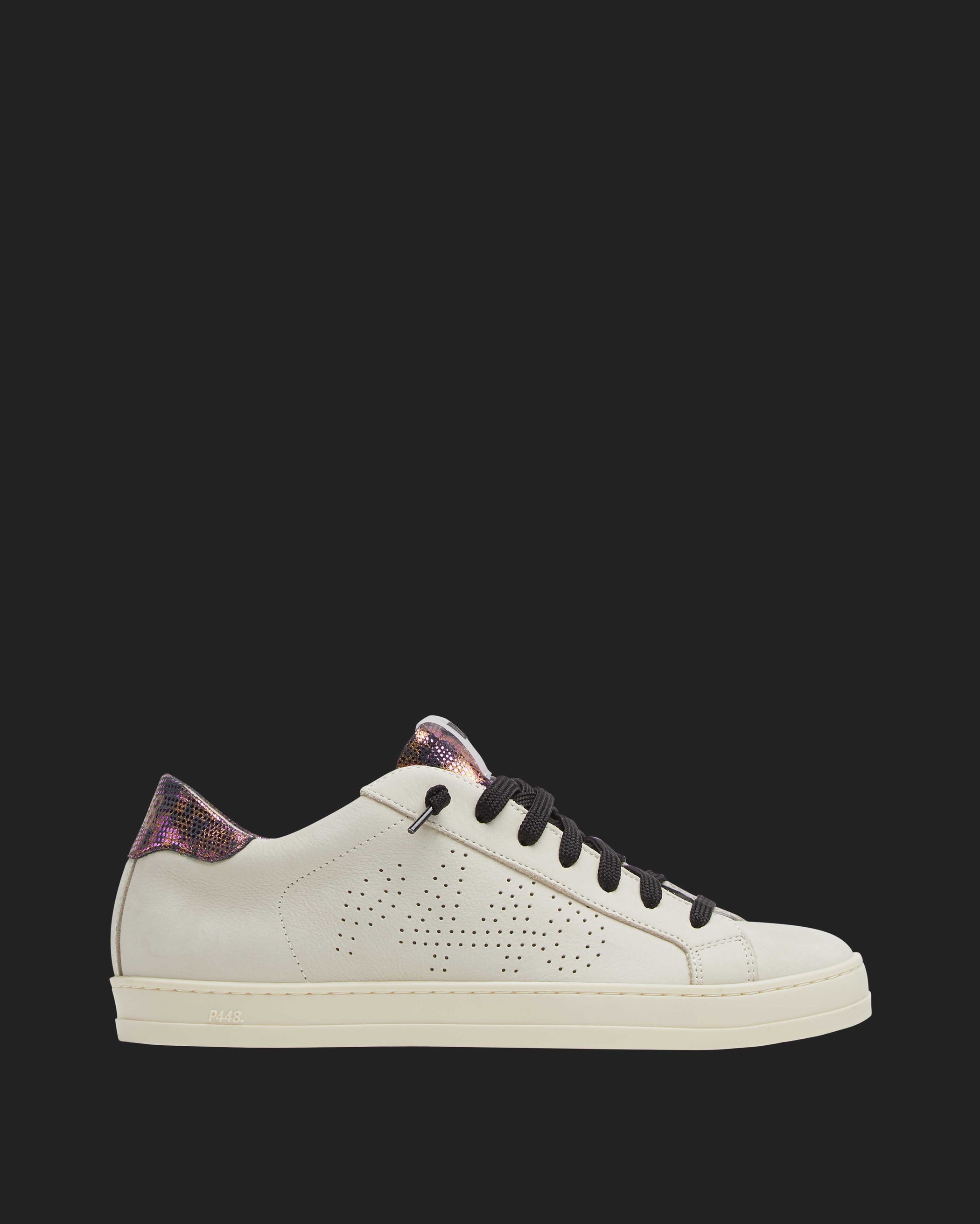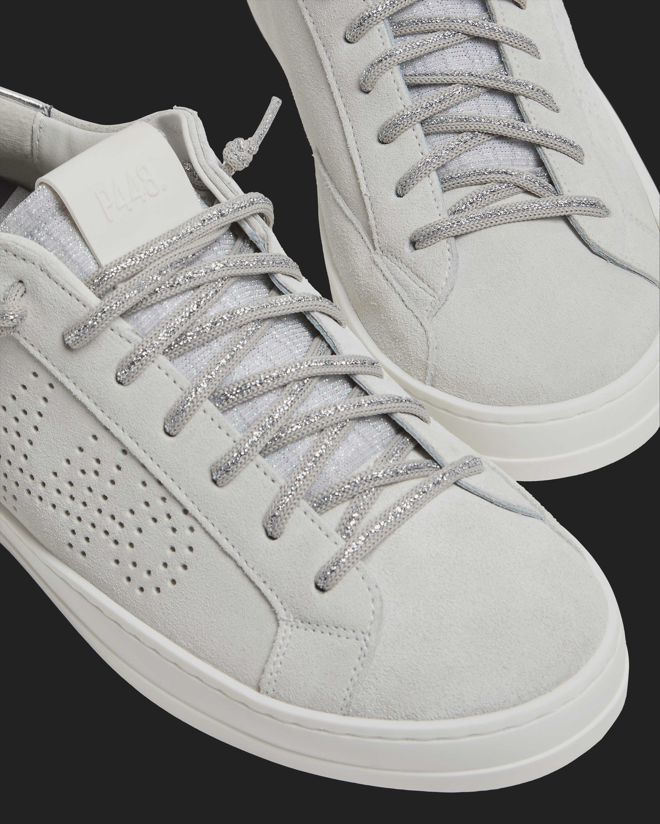The John Platinum is an elevated neutral with off-white suede and accent silver fabric details across the tongue and heel tab. Silver laces and matching silver treads tie it all together.