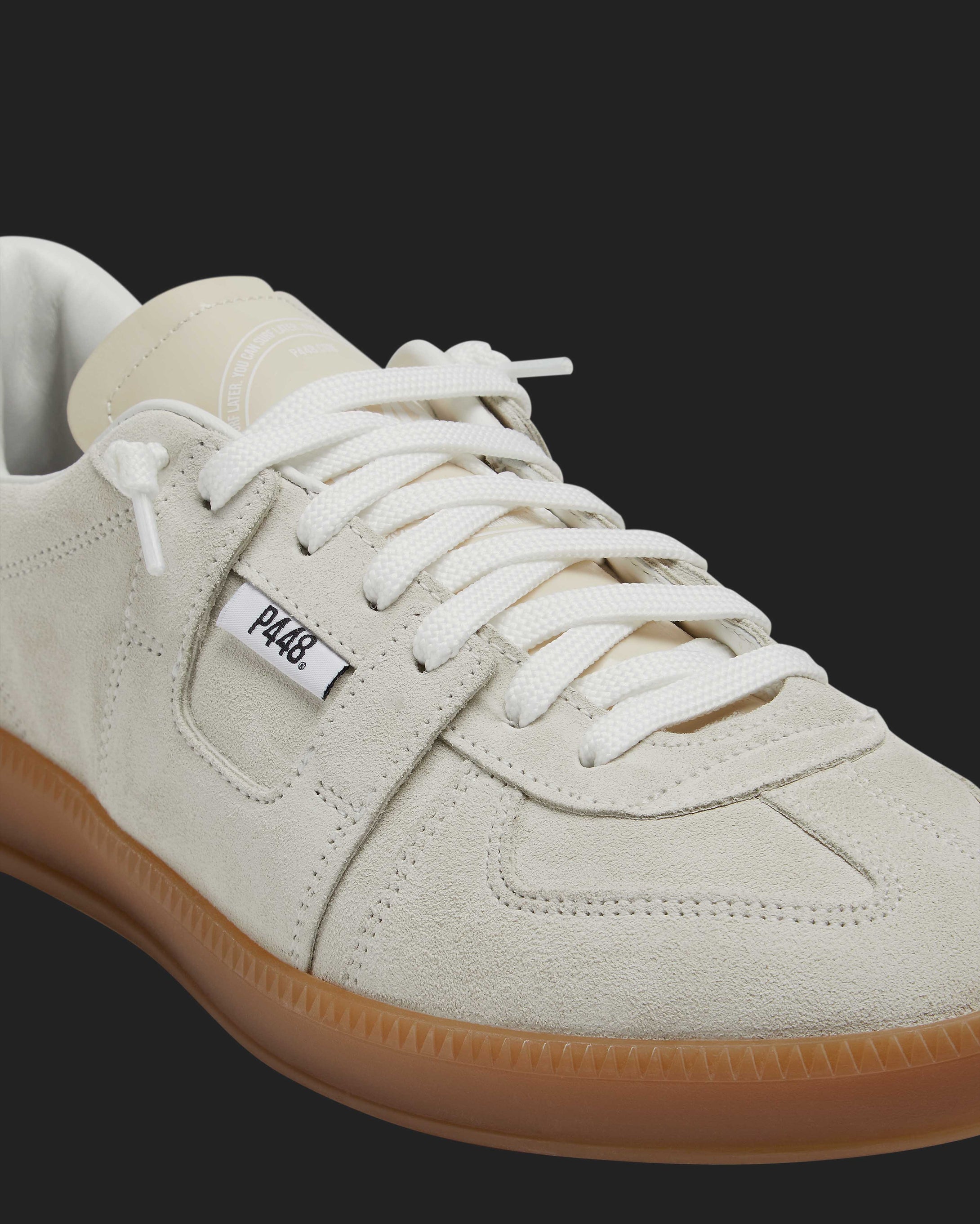 The Monza Dew features all-over light beige suede accented by light beige patent leather details across the tongue and heel tab. White cotton laces and our signature P448 amber rubber sole and treads finish off the look.