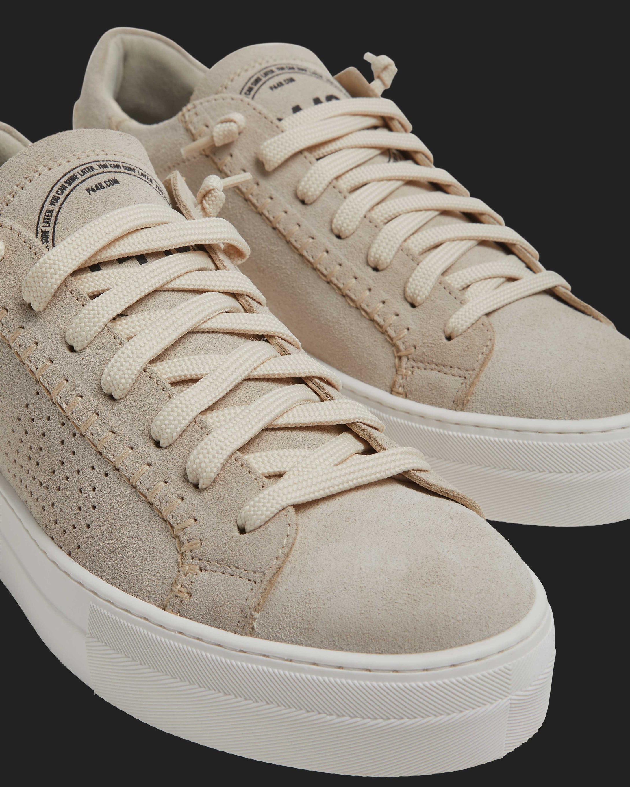 The Thea Sand Stitch is wrapped in tan suede with contrast stitchwork. Off-white cotton laces and our signature platform rubber sole finish off the look. This silhouette runs small, so be sure to size up if you're in between.