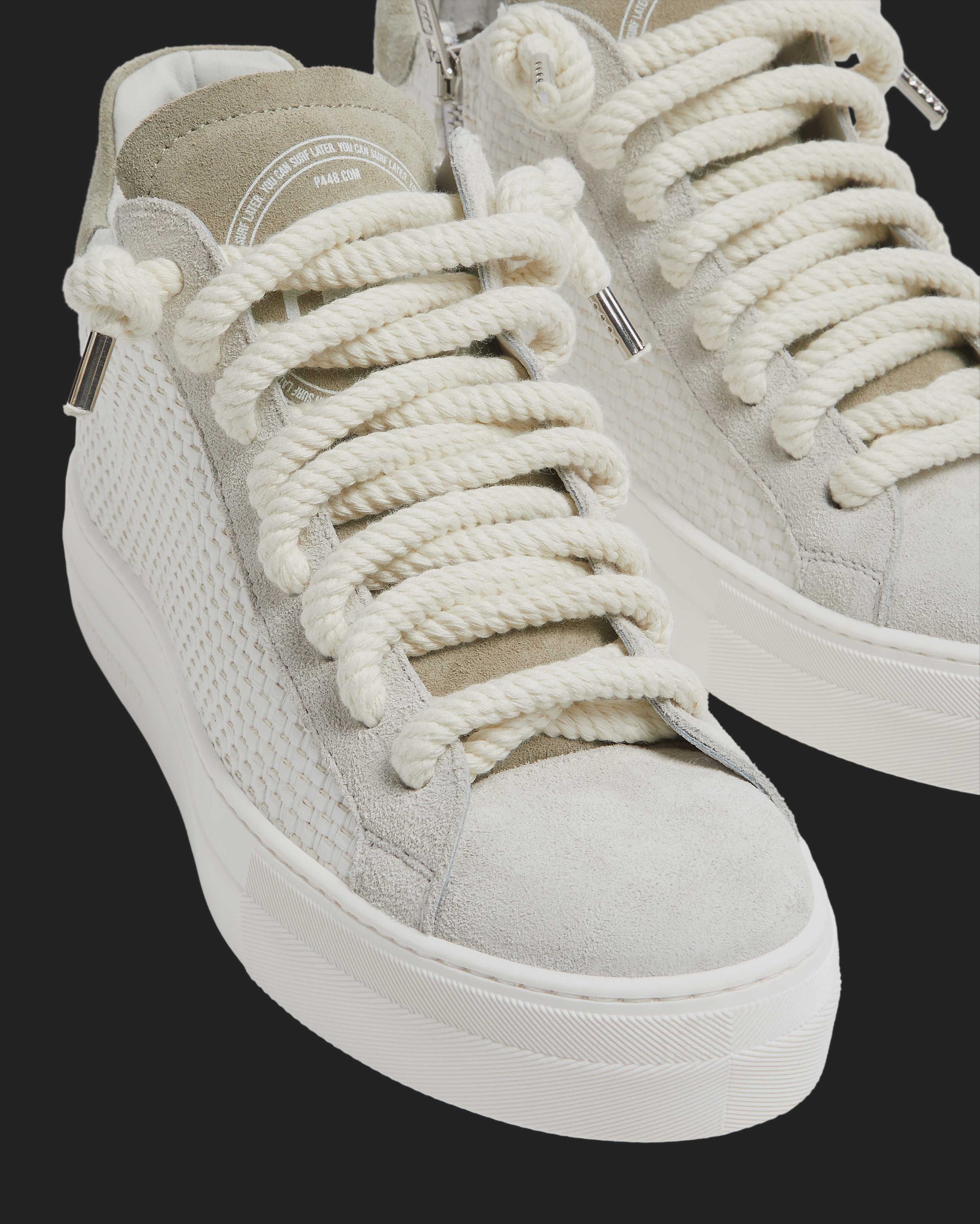 The Thea Mid White/Sand is wrapped in white woven fabric with tan and off-white suede accents. White rope laces and our signature platform rubber sole finish off the look. This playful silhouette runs small, so be sure to size up if you're in between.