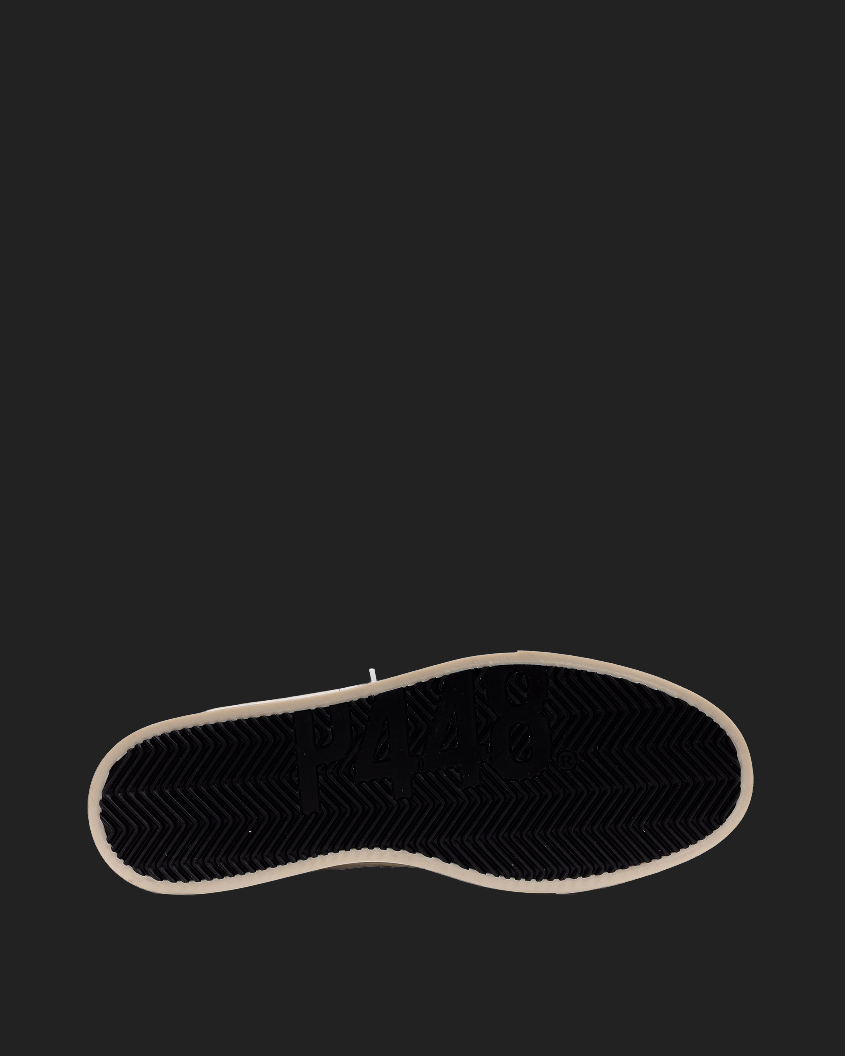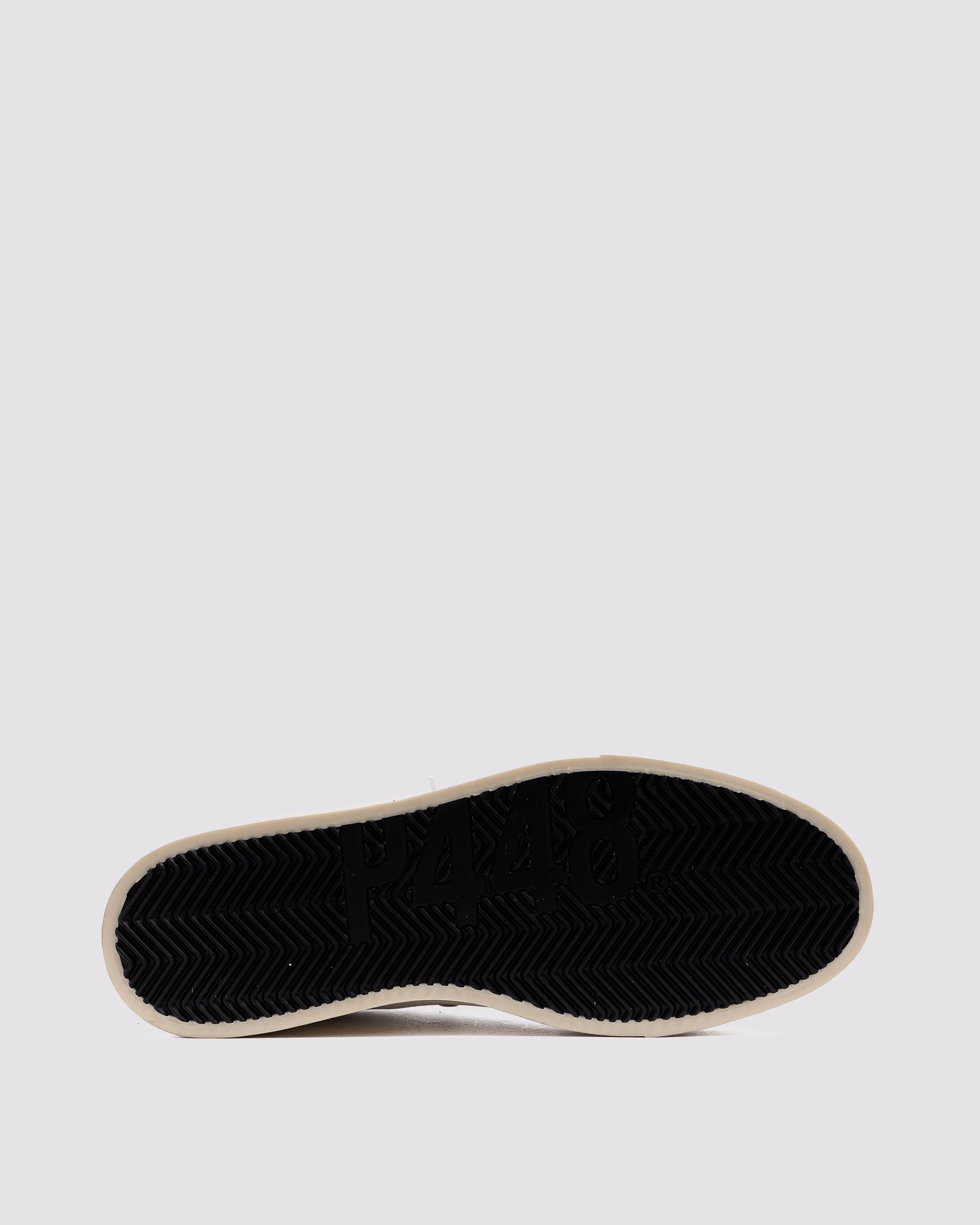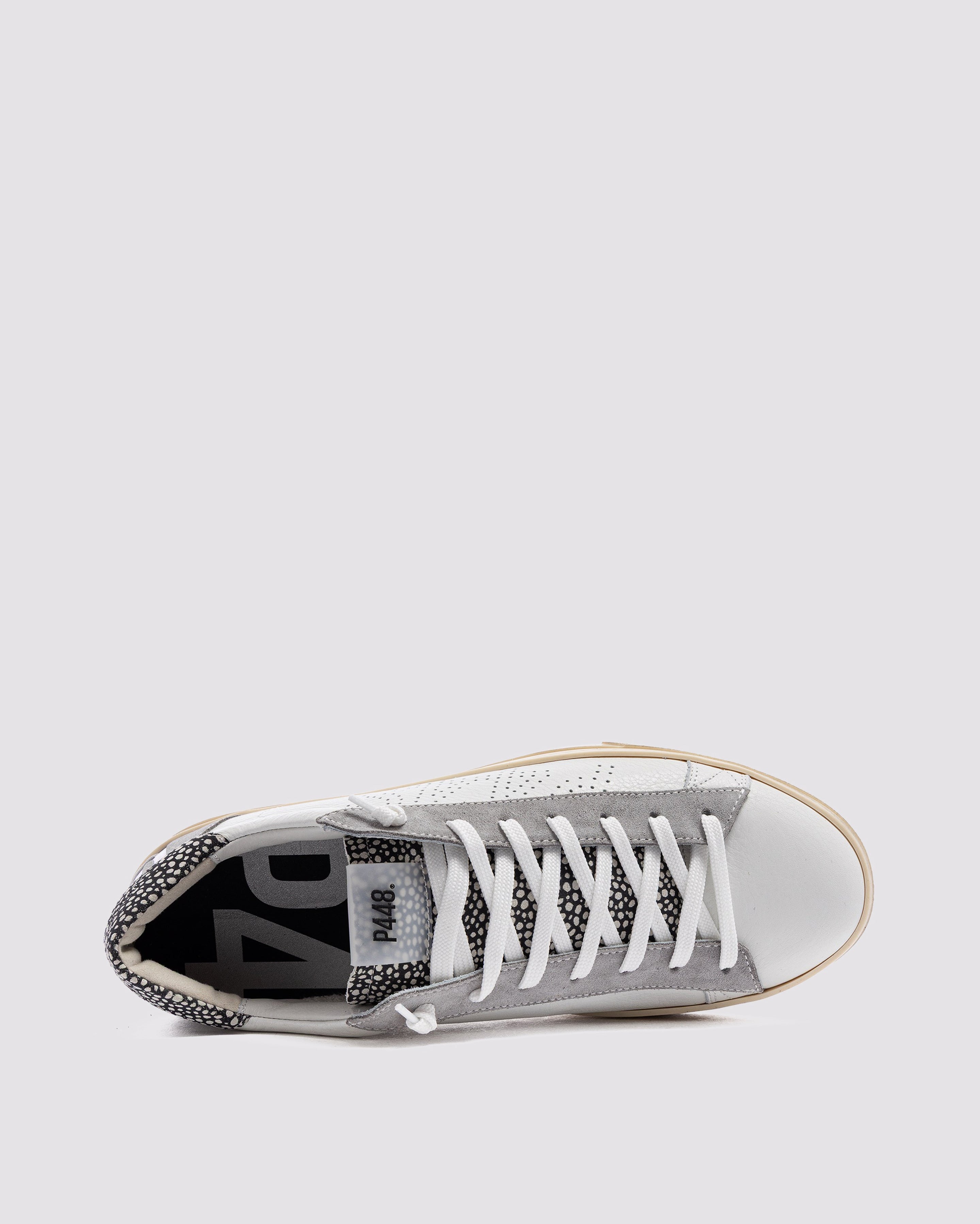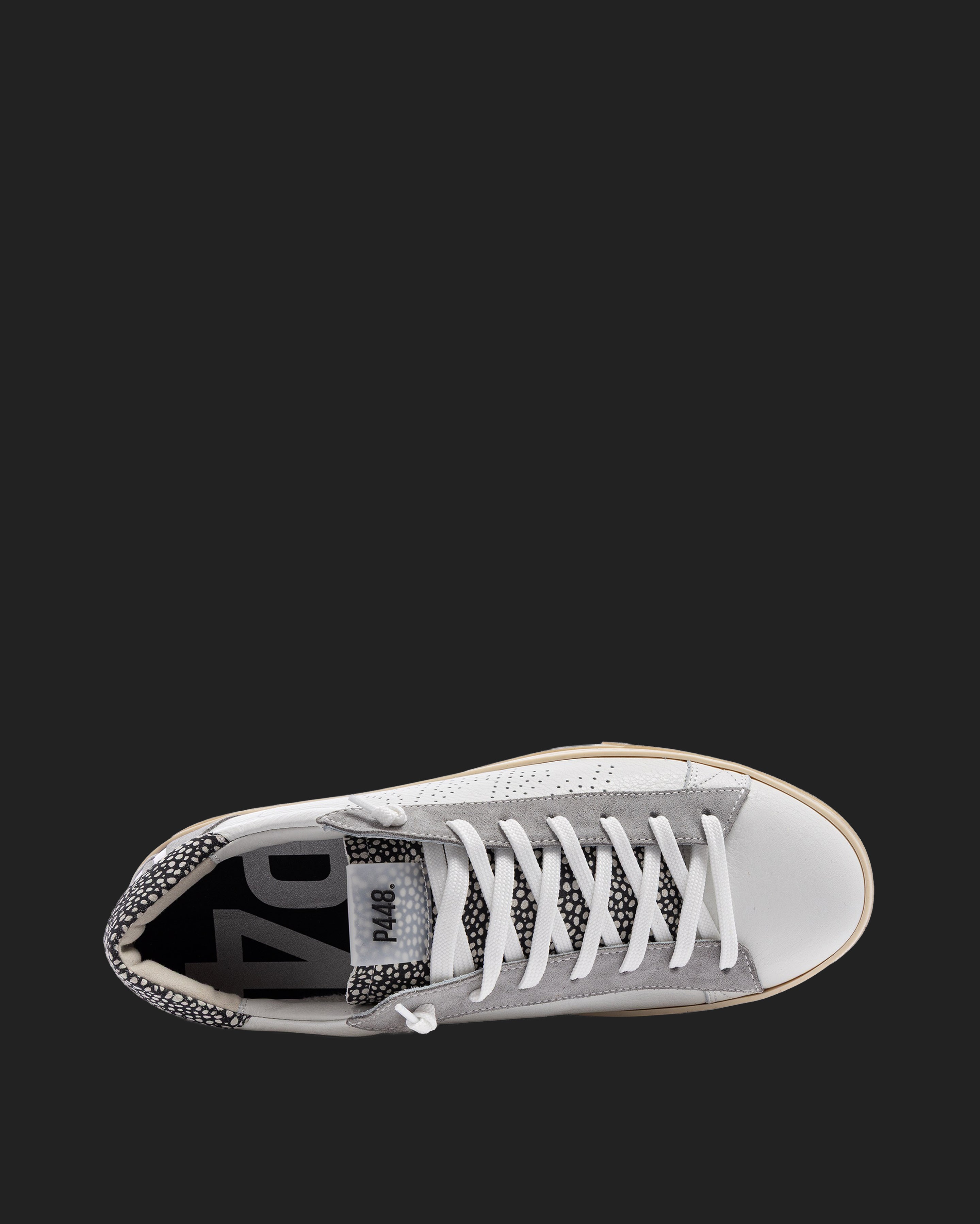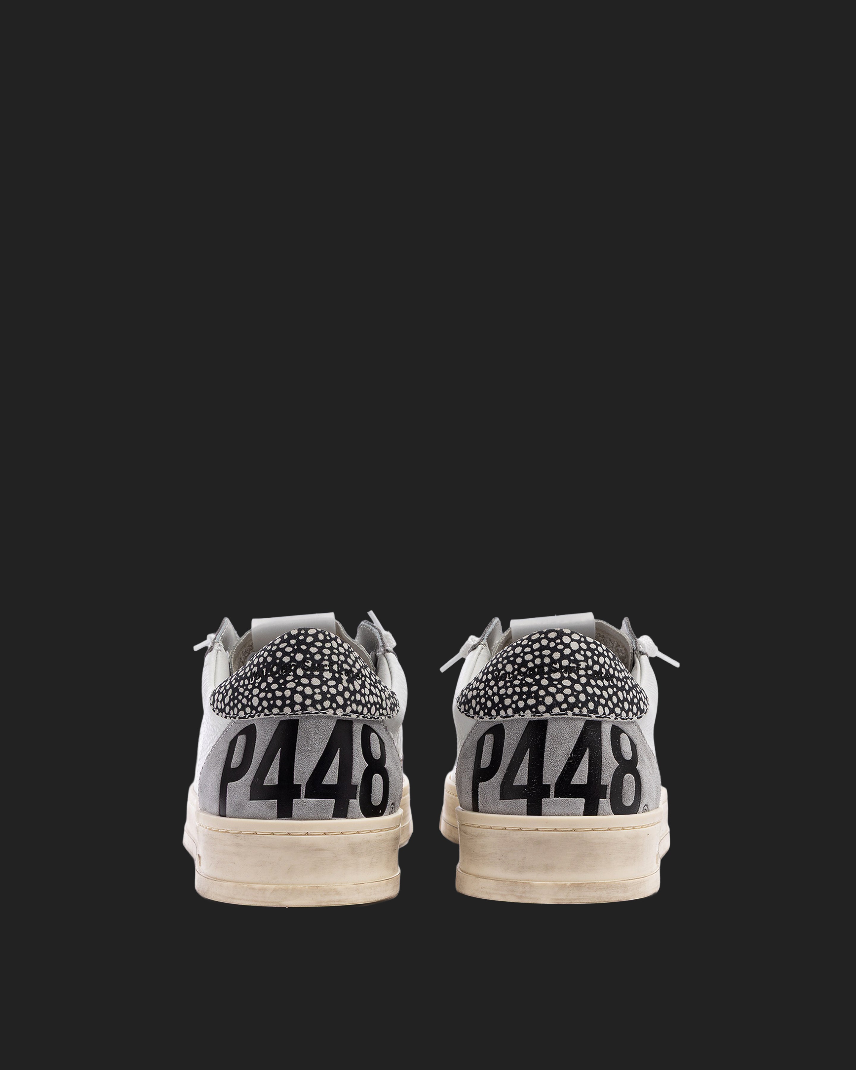 The Jack Spot White features all-over white leather and suede, complemented by grey suede and white-and-black speckled suede accents. White laces, our signature P448 hand-distressed rubber sole and black tread ground the look. Swap in the extra pair of dark grey laces to tie it all together.