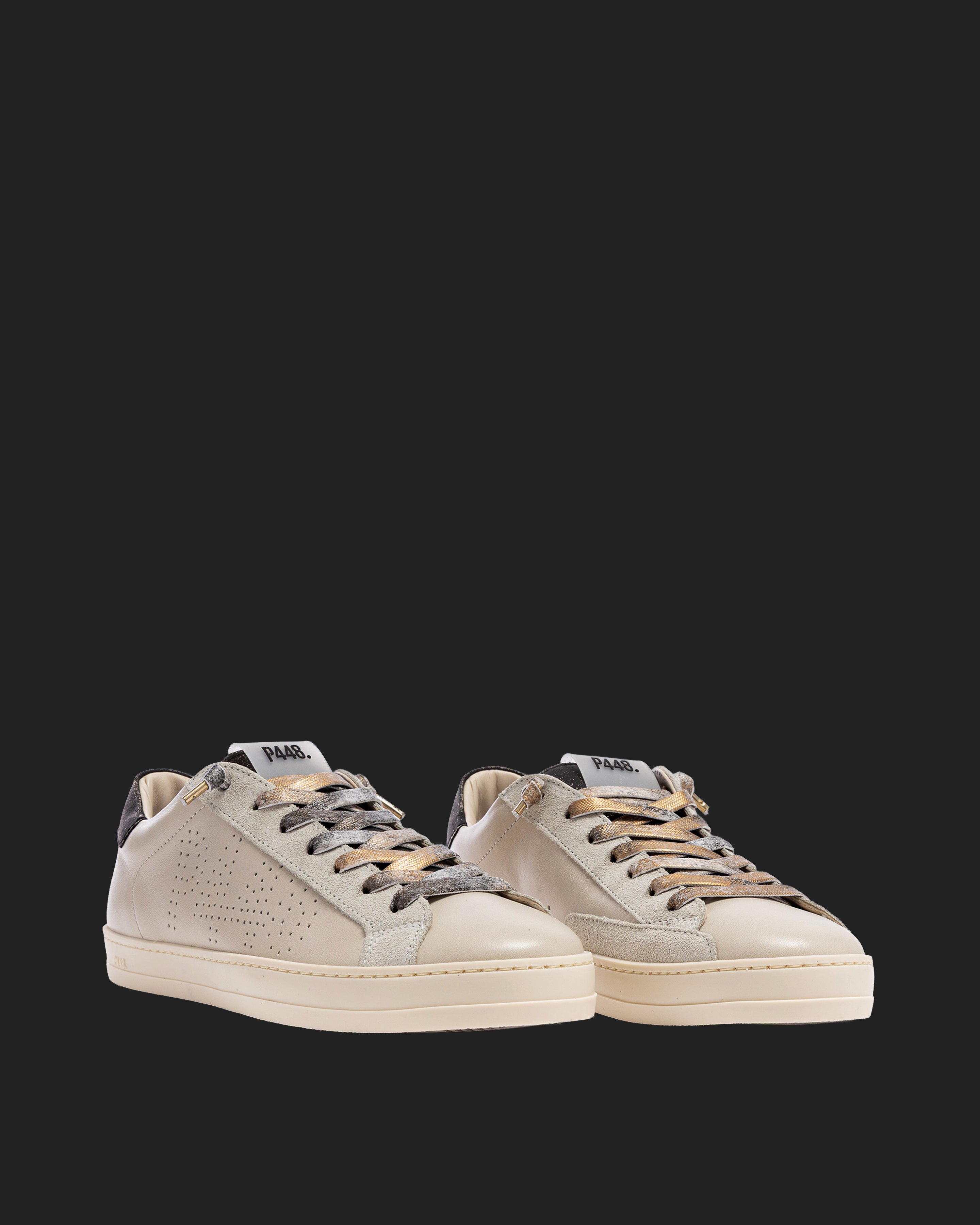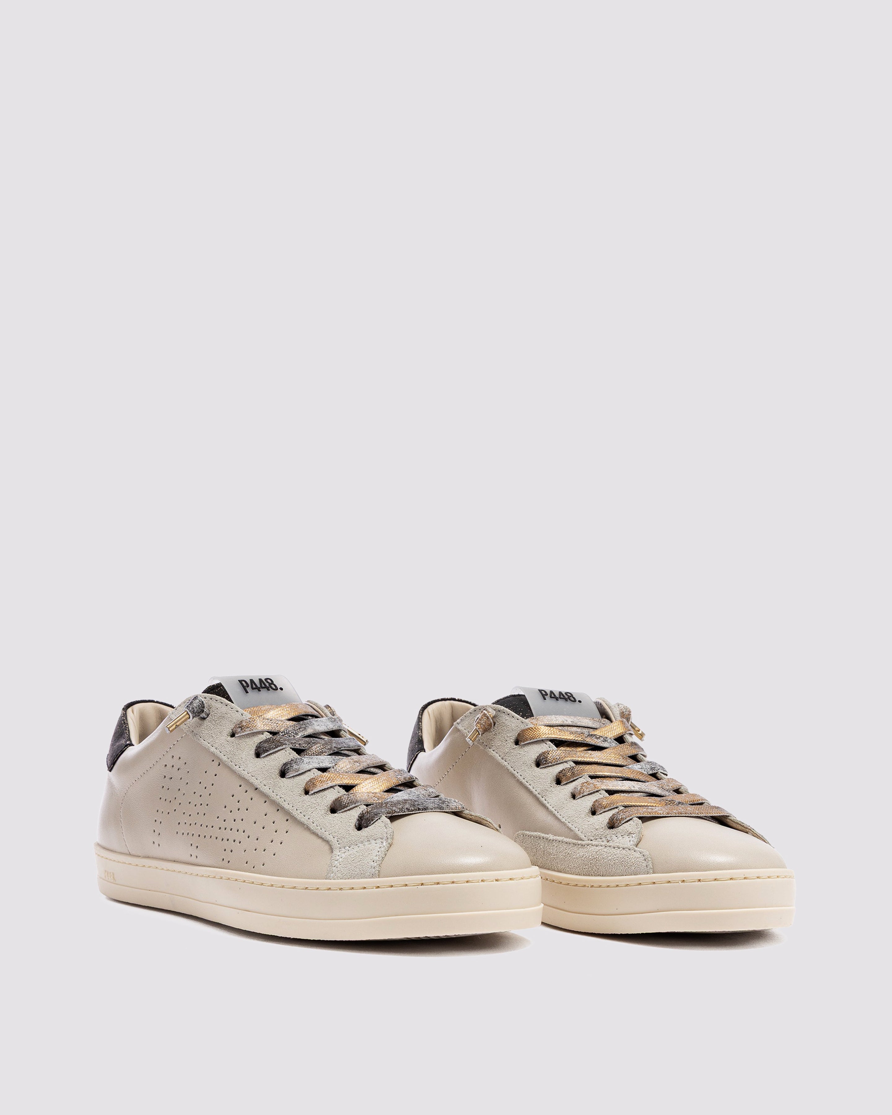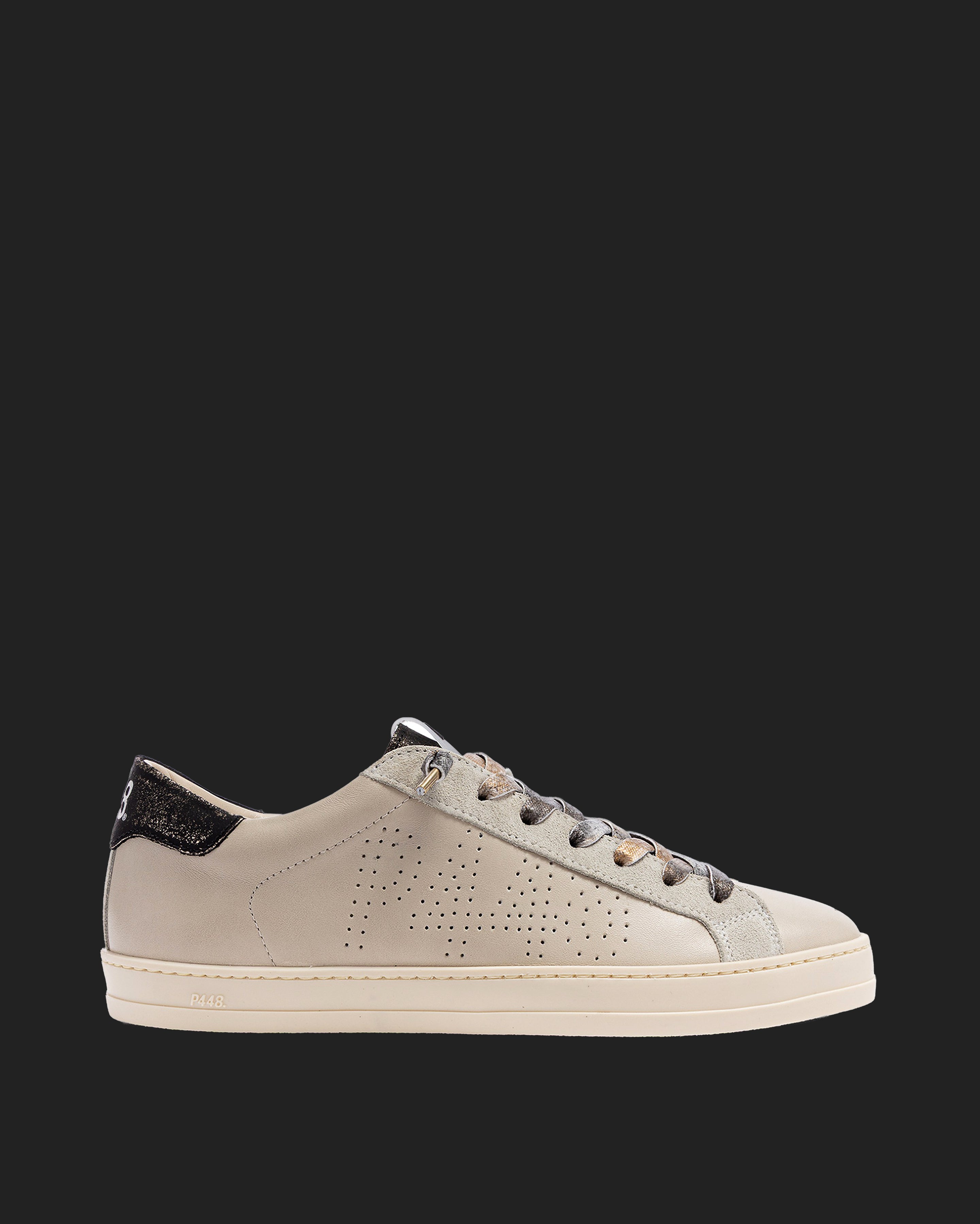 The John Panna is wrapped in cream leather accented by a black metallic leather tongue and heel tab and matching multi-color laces with gold metallic tips. Our signature P448 rubber sole and silver tread finish off the look. Swap in the extra pair of white laces to tie it all together.