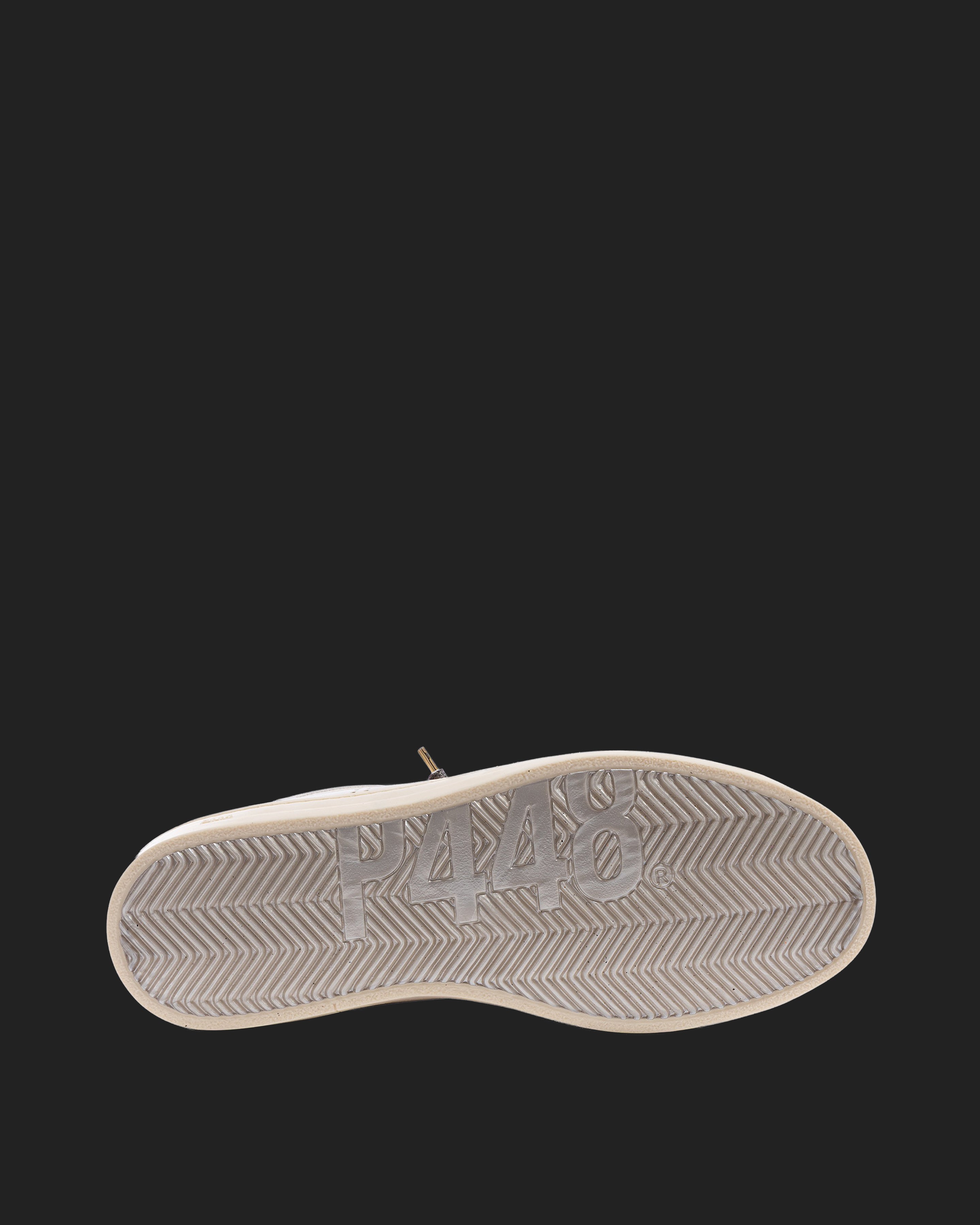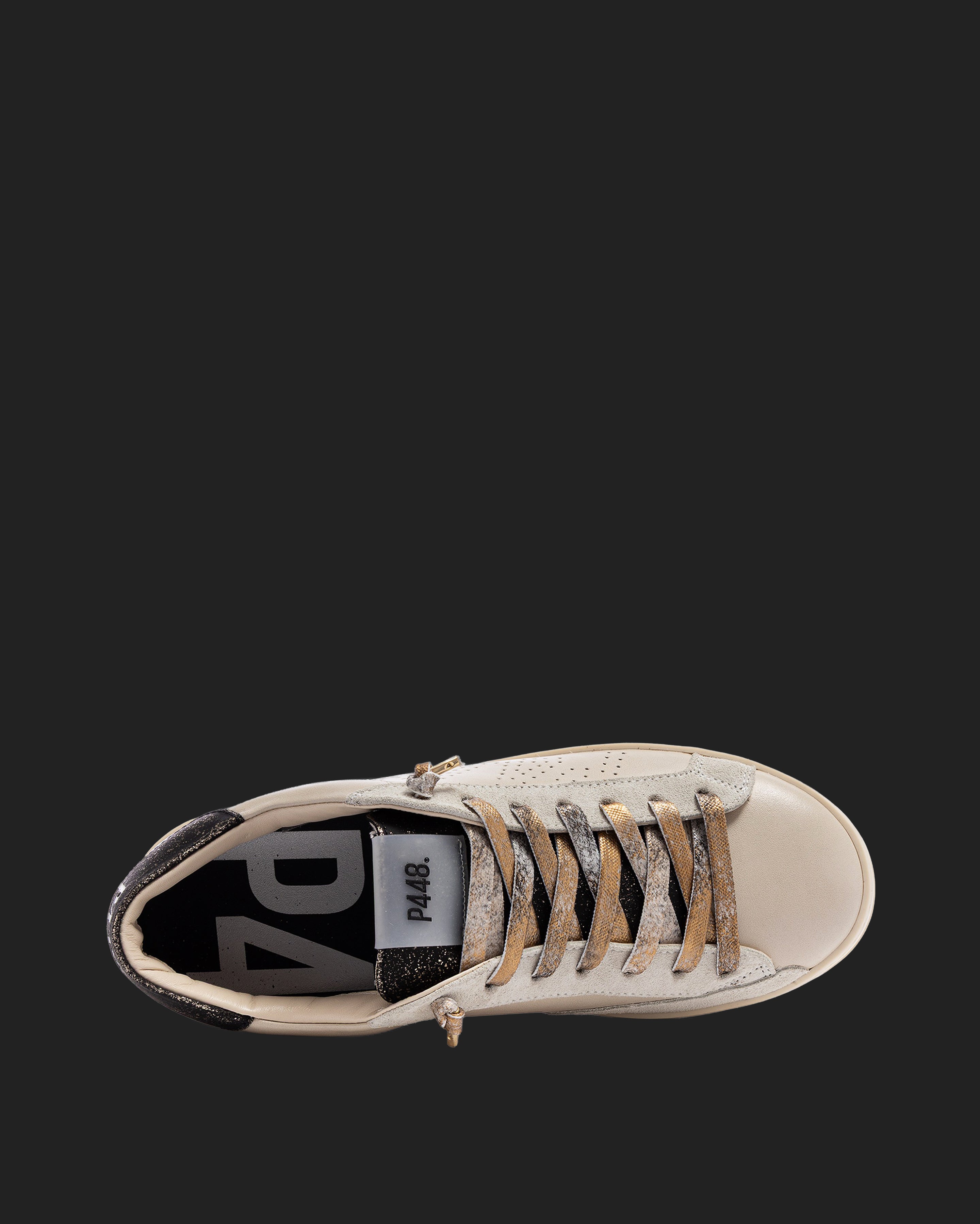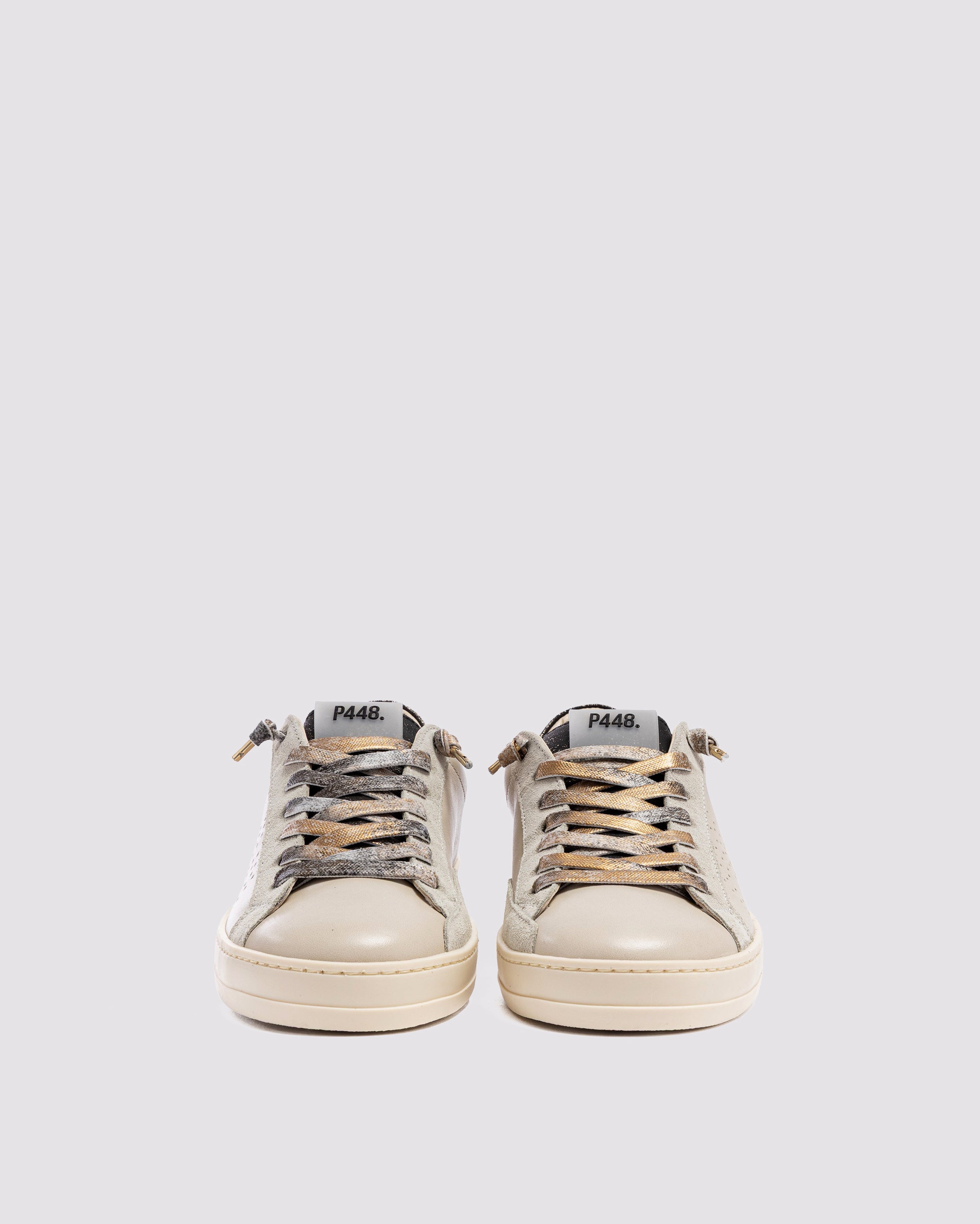 The John Panna is wrapped in cream leather accented by a black metallic leather tongue and heel tab and matching multi-color laces with gold metallic tips. Our signature P448 rubber sole and silver tread finish off the look. Swap in the extra pair of white laces to tie it all together.