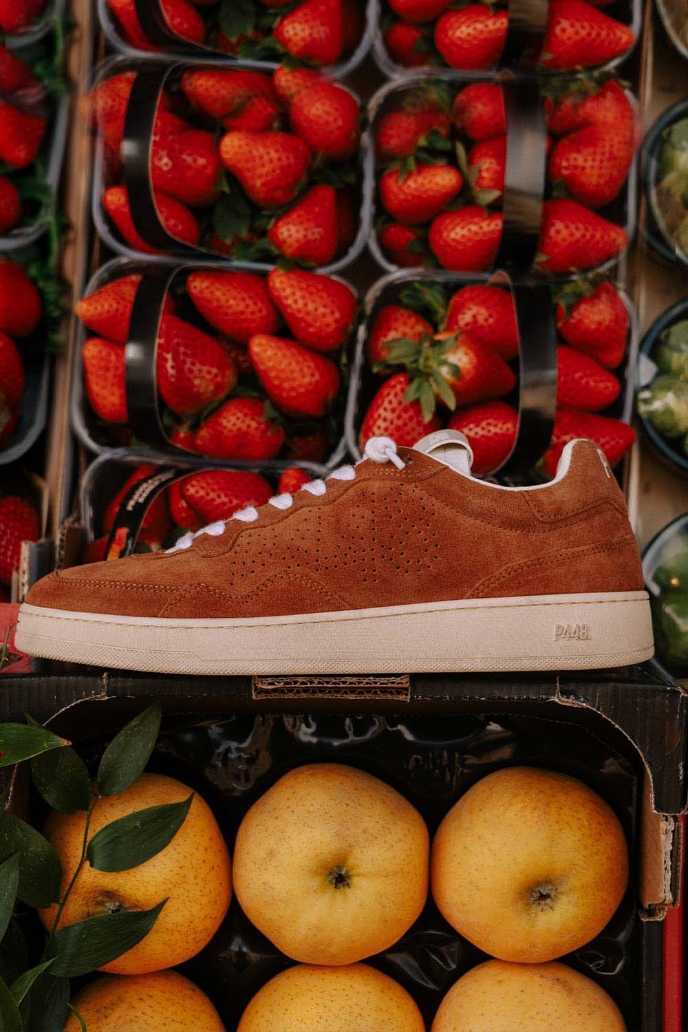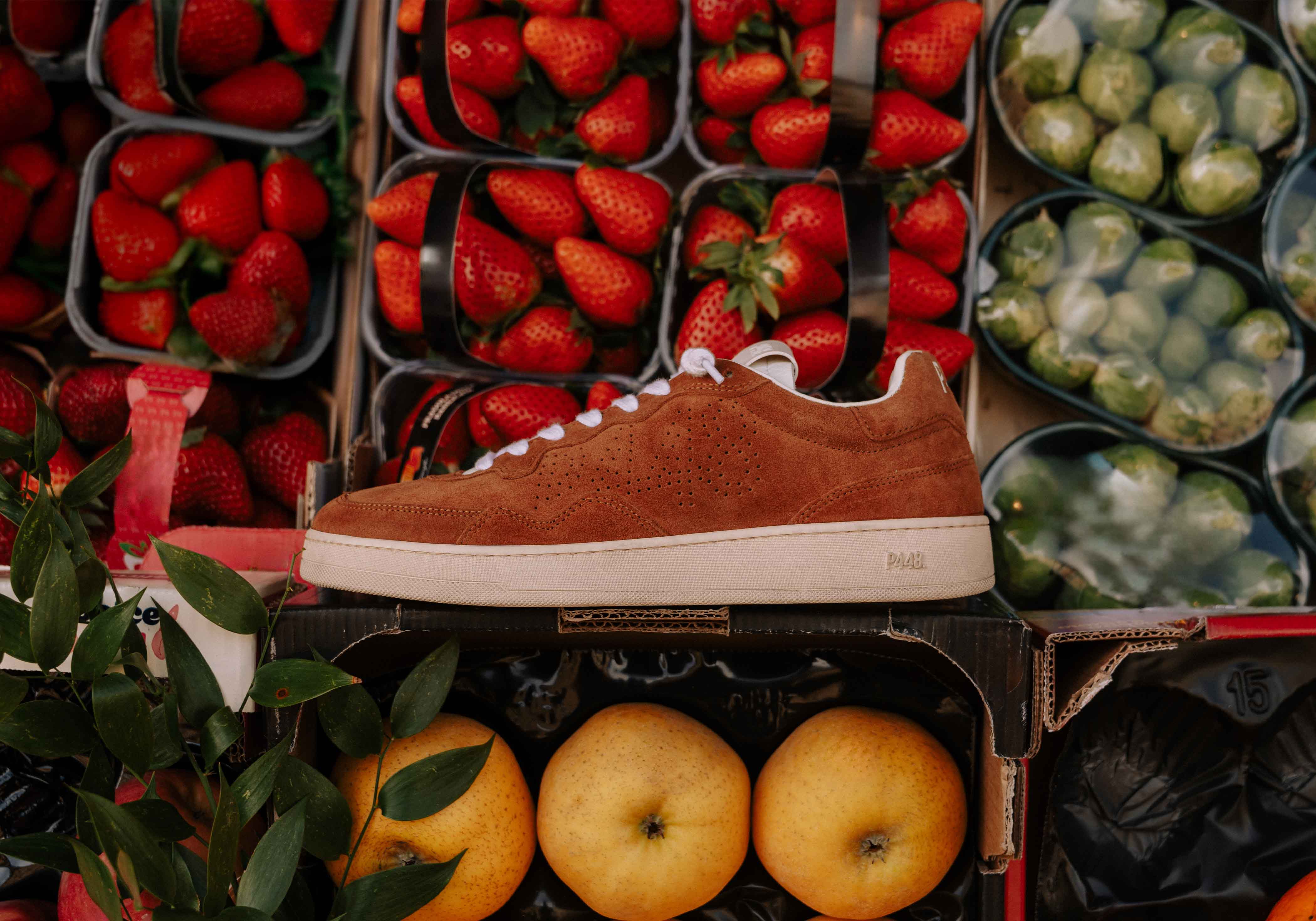The John Vintage Camel is wrapped in light yellow suede and white leather with off-white cotton laces. Our signature P448 rubber sole and light brown tread finish off the look. Swap in the extra pair of copper cotton laces to make a statement.